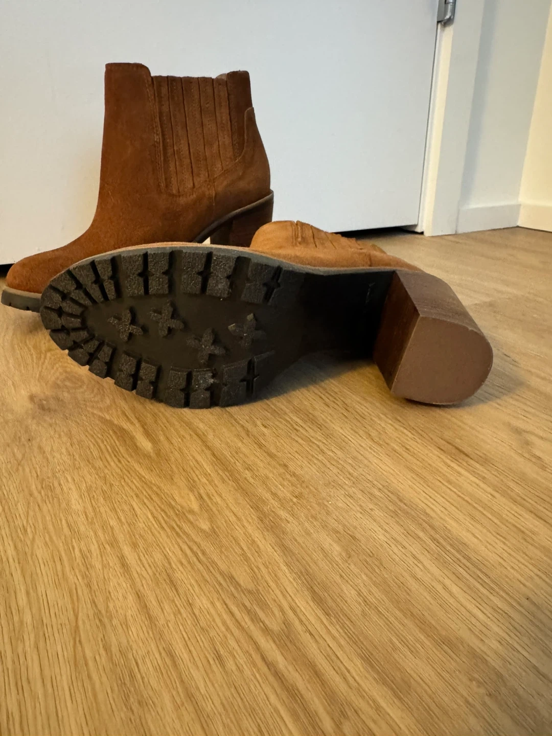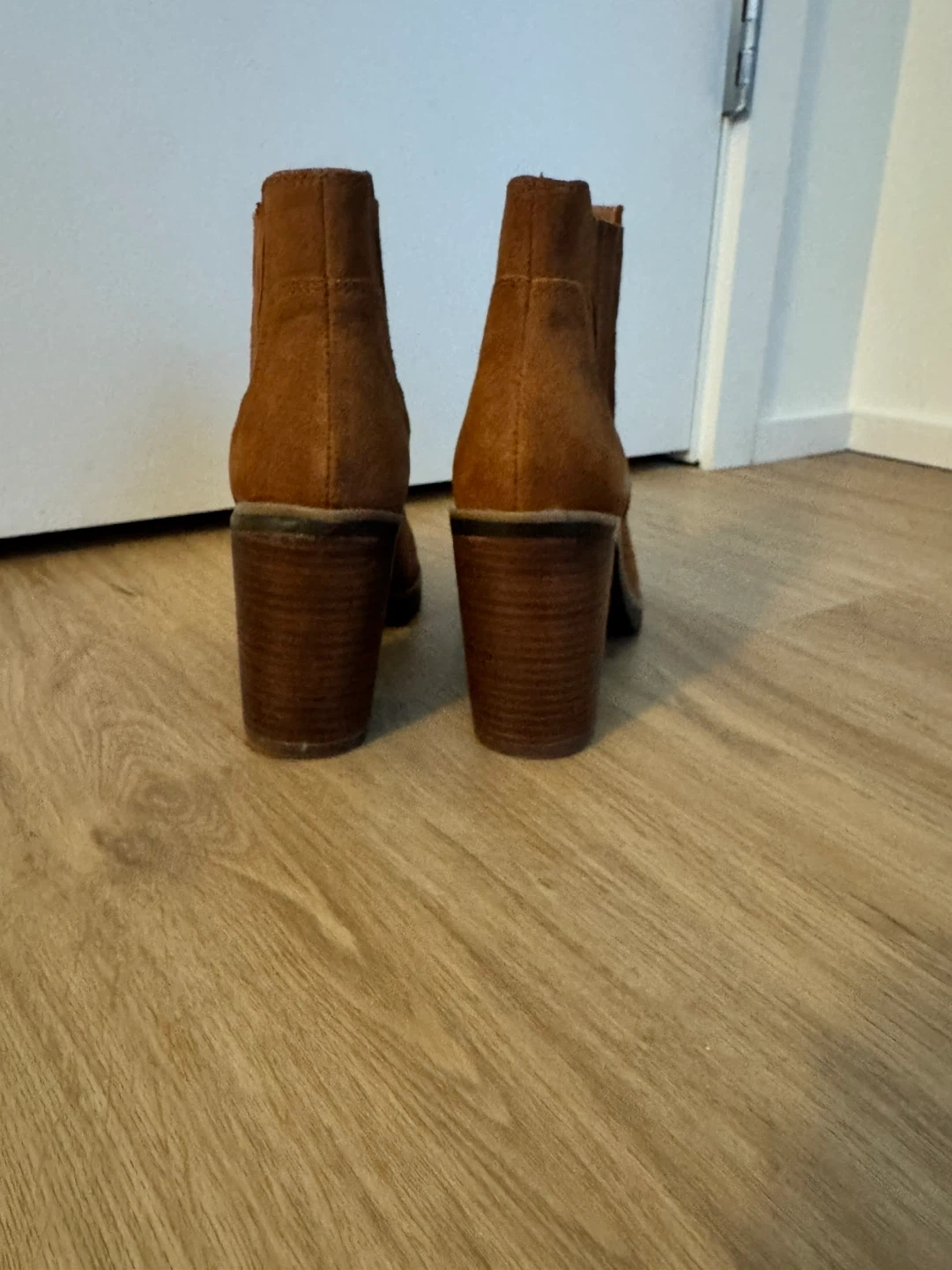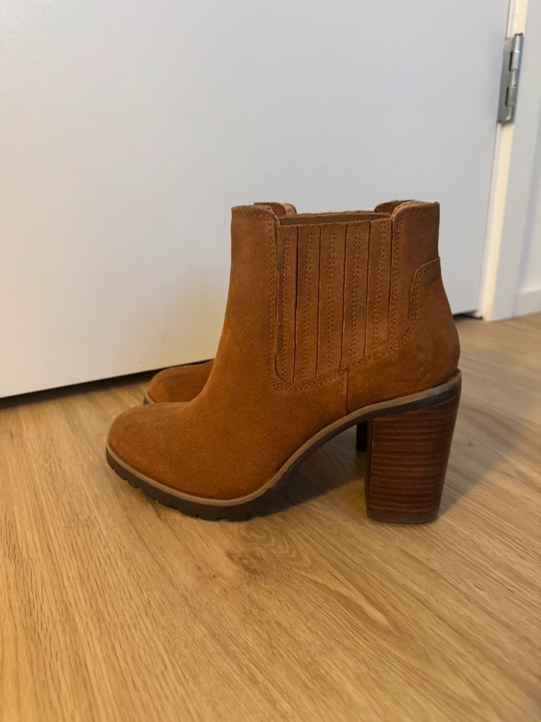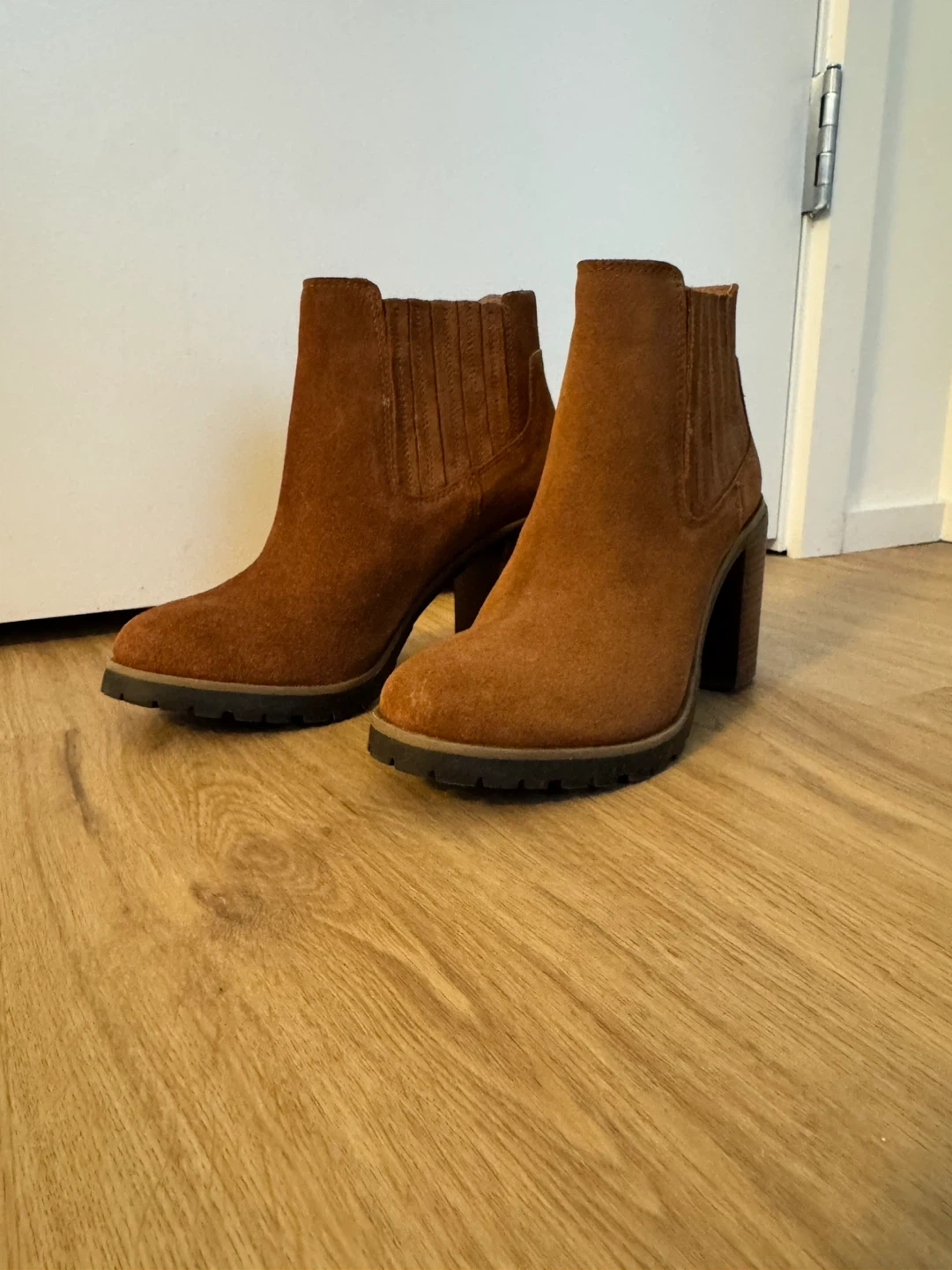 These stylish brown ankle boots are made of suede and feature a comfortable block heel. They're perfect for adding a touch of sophistication to any outfit. They are in great condition and ready for a new home!