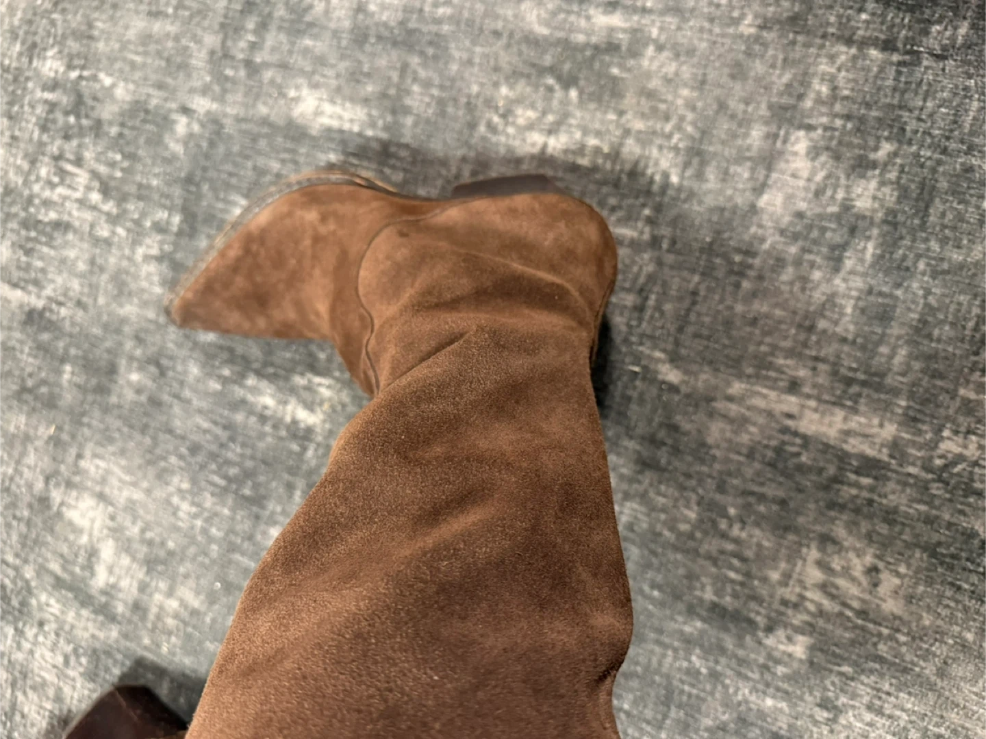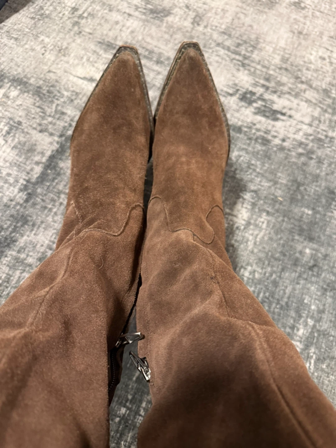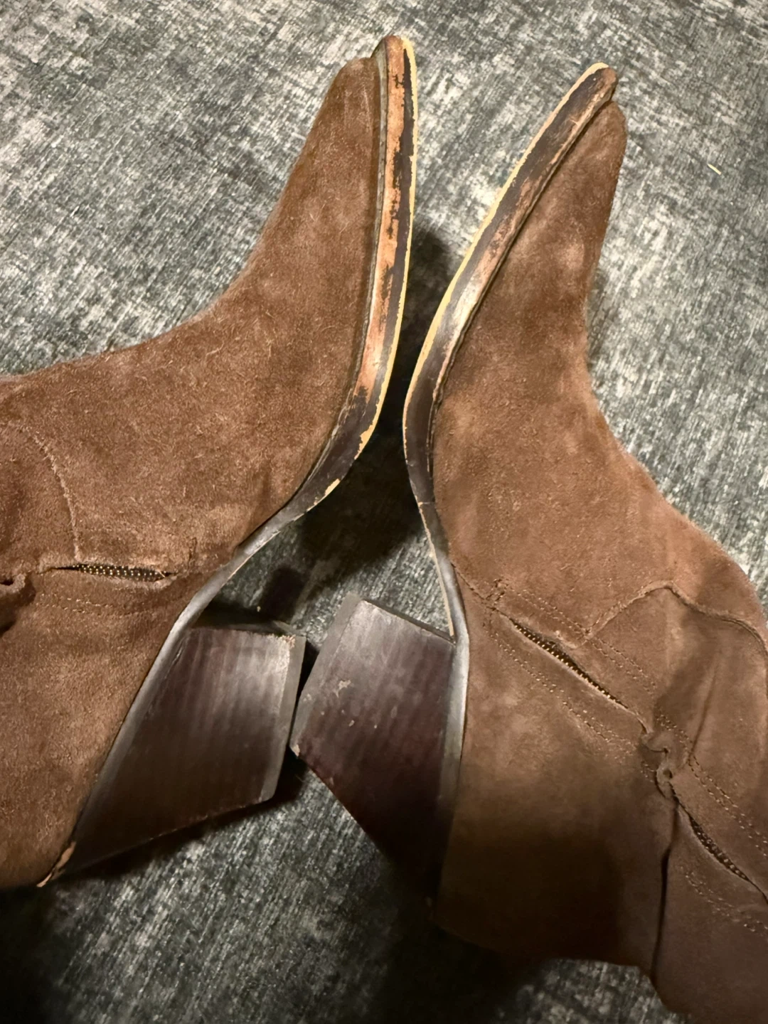1000+Selling a pair of brown suede boots in size 8.5. They have a stylish look and are made of suede material. There are some signs of wear on the tips of the toes, as shown in the photos.