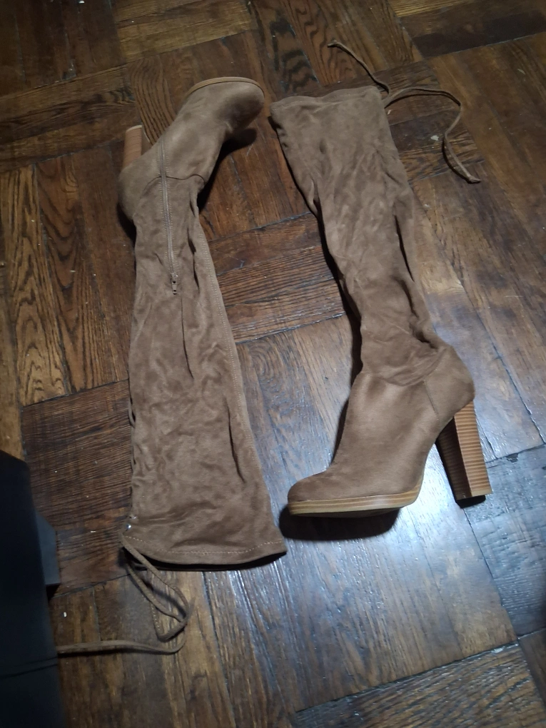 88Selling a pair of brown thigh-high heel boots! They have a stylish look and are perfect for a night out