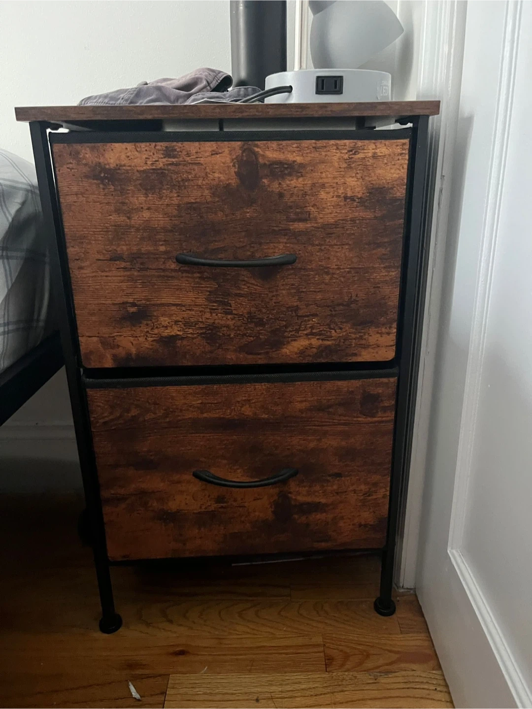 10I'm selling a cute nightstand with two drawers! It's a brown wood color with a black metal frame. It's perfect for storing books or small items next to your bed. It's in great condition and ready for a new home