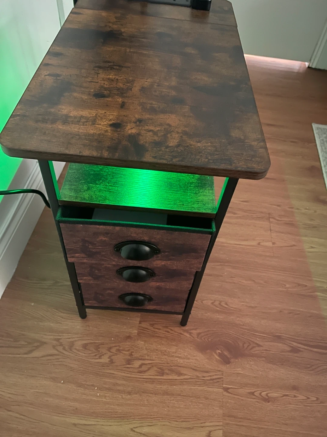 86This is a cute little wood nightstand with drawers. It has a dark brown finish and a cool industrial look. It's in great condition and would look great in any bedroom!