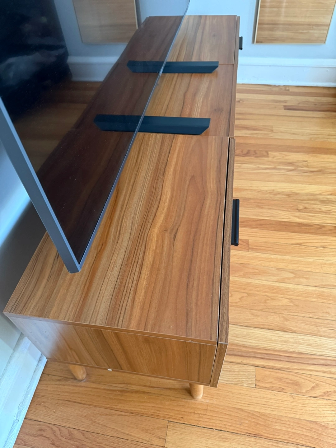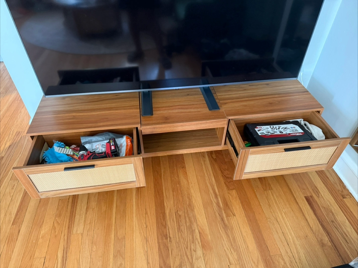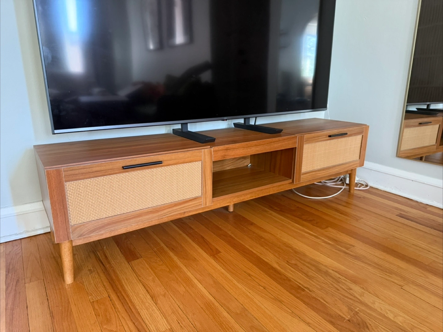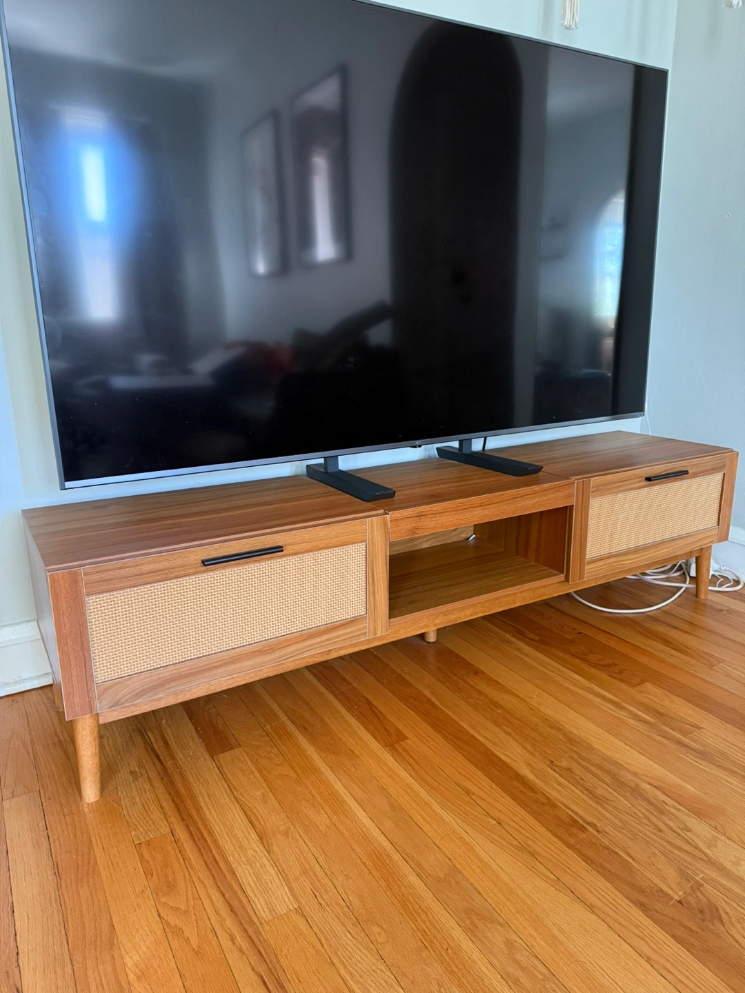 83Selling a stylish TV stand with a beautiful combination of brown wood and rattan detailing- soft close drawers. It has drawers and open shelving for storage. It's in great condition and ready for a new home!