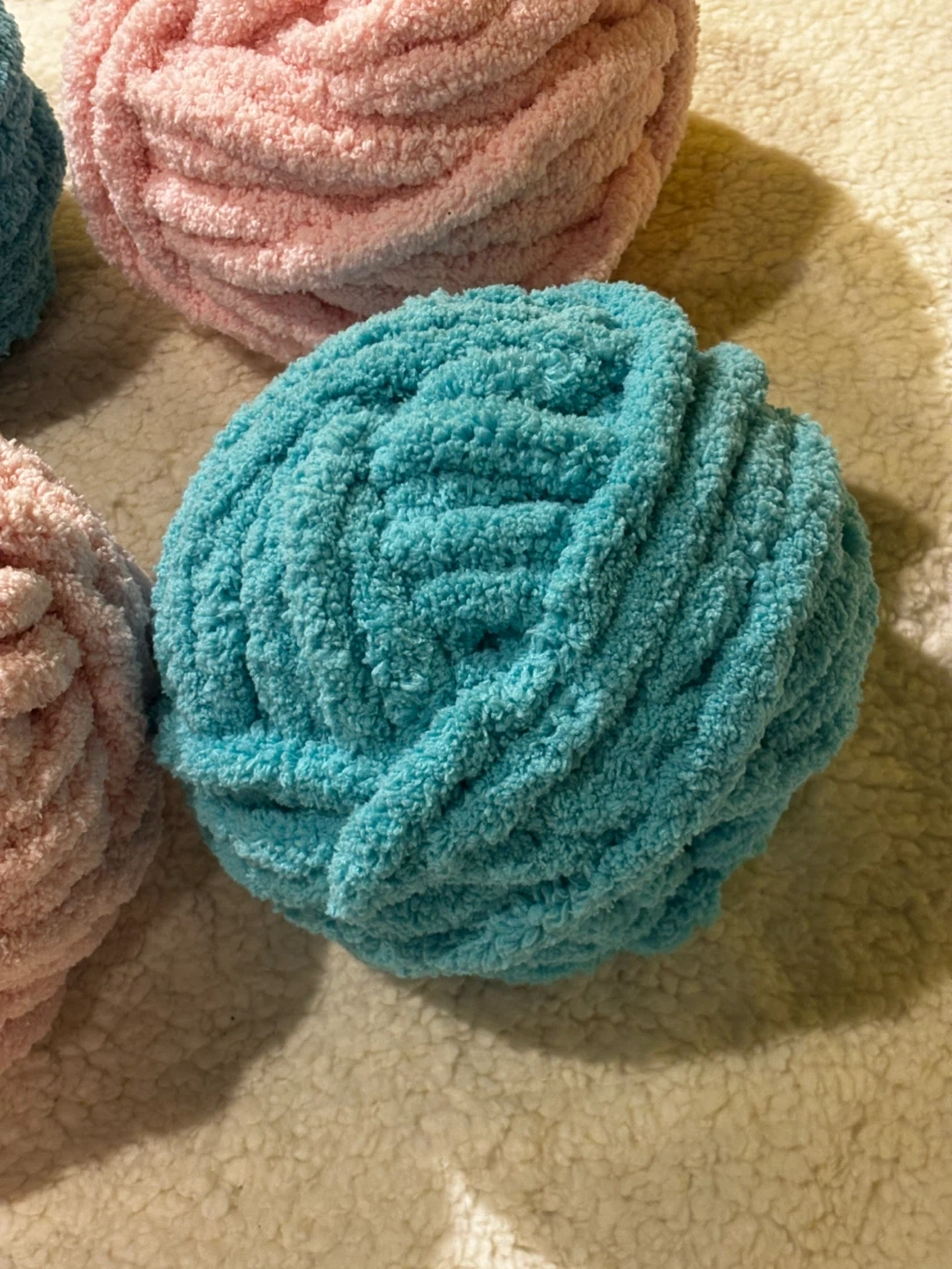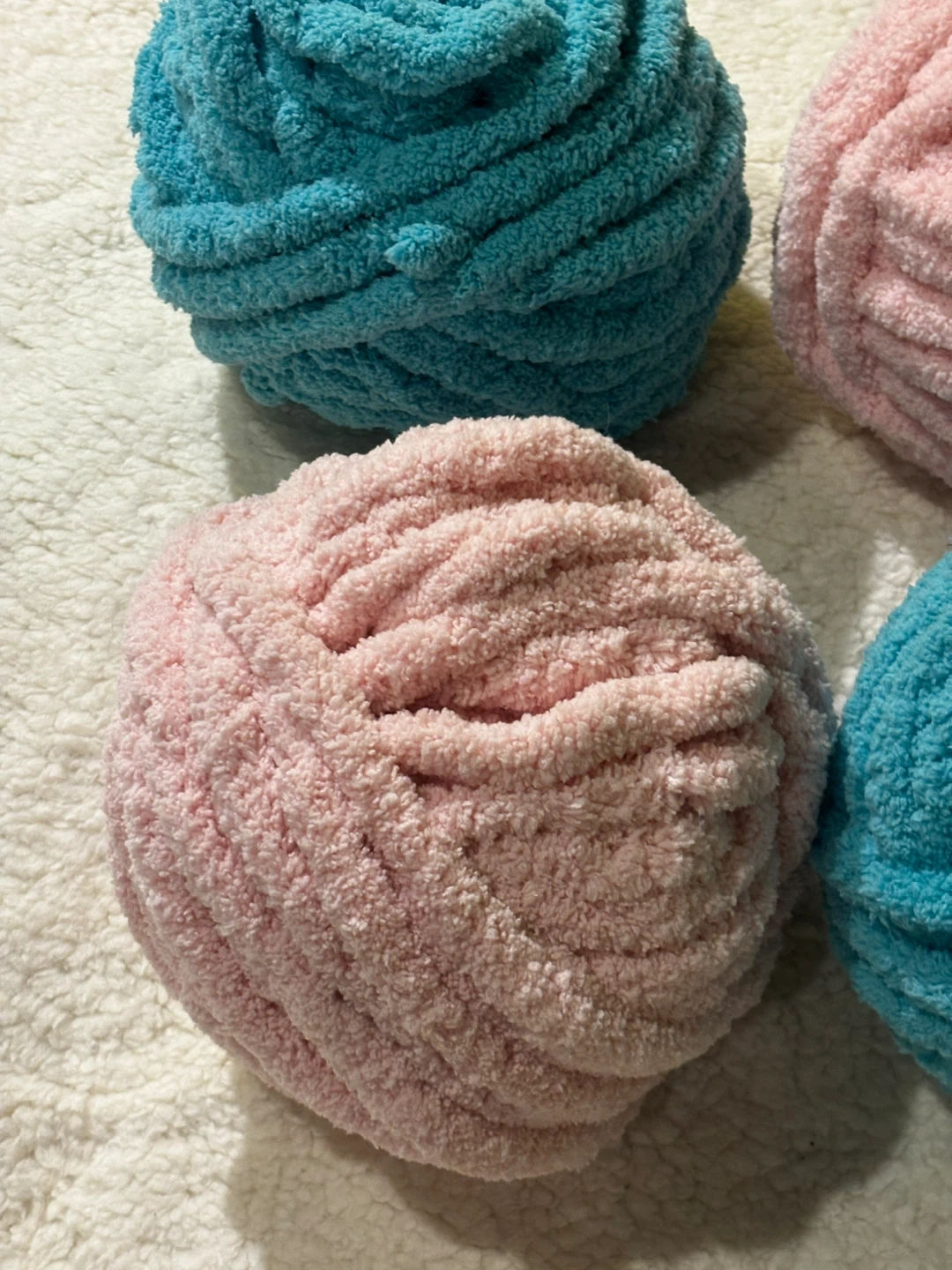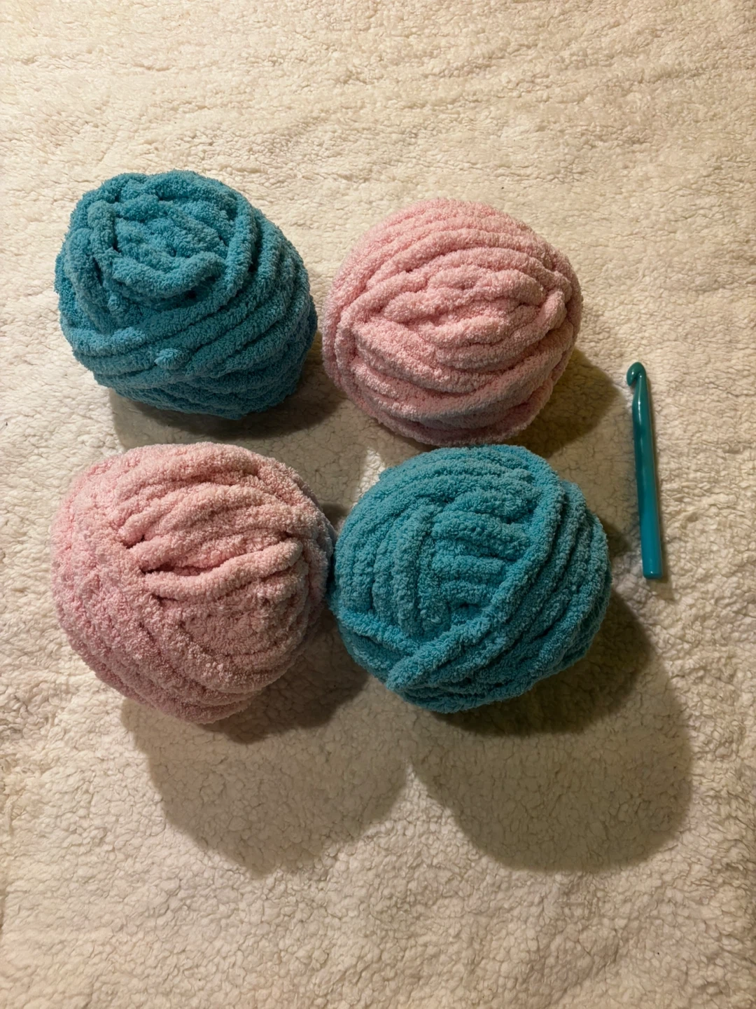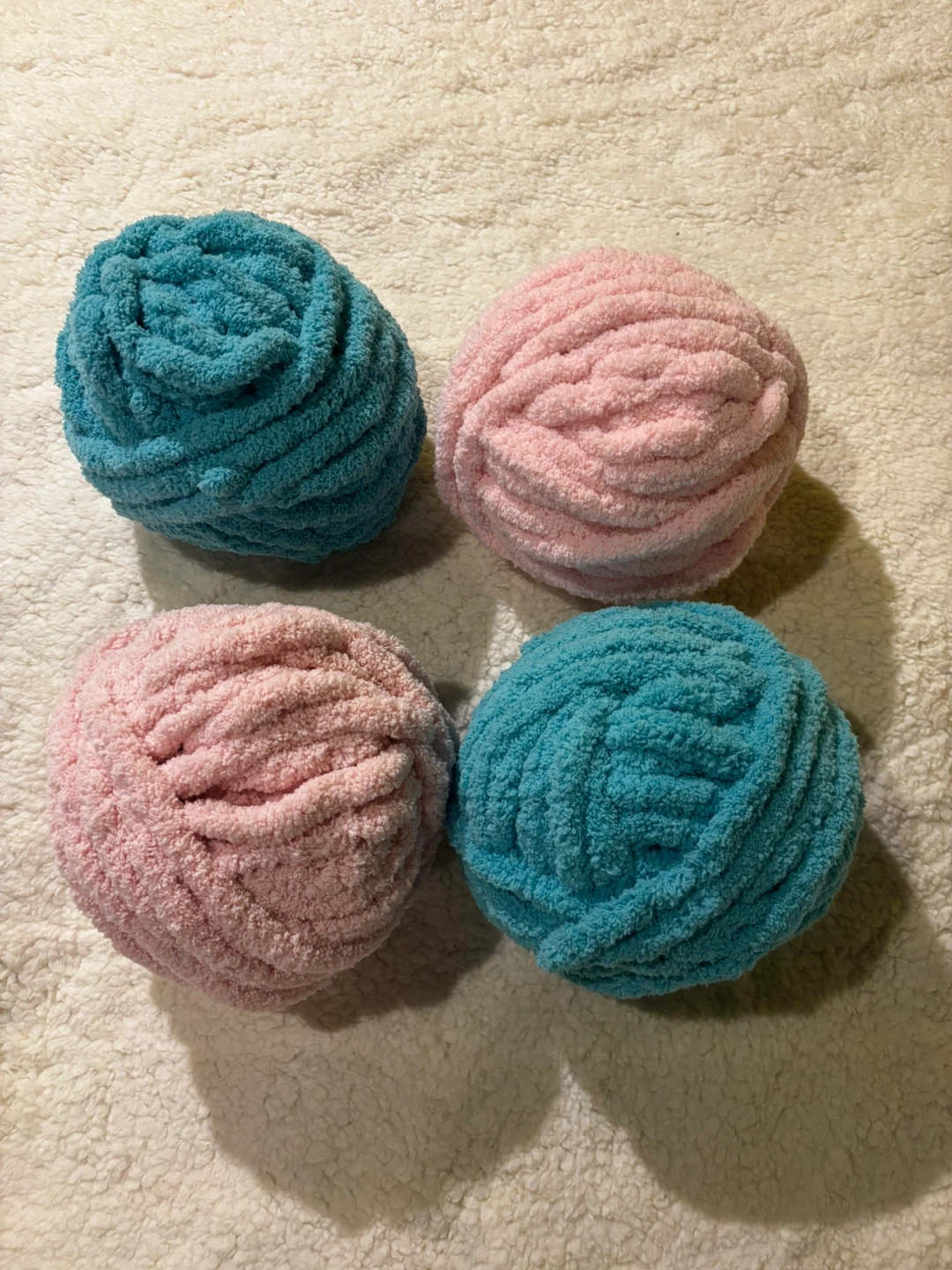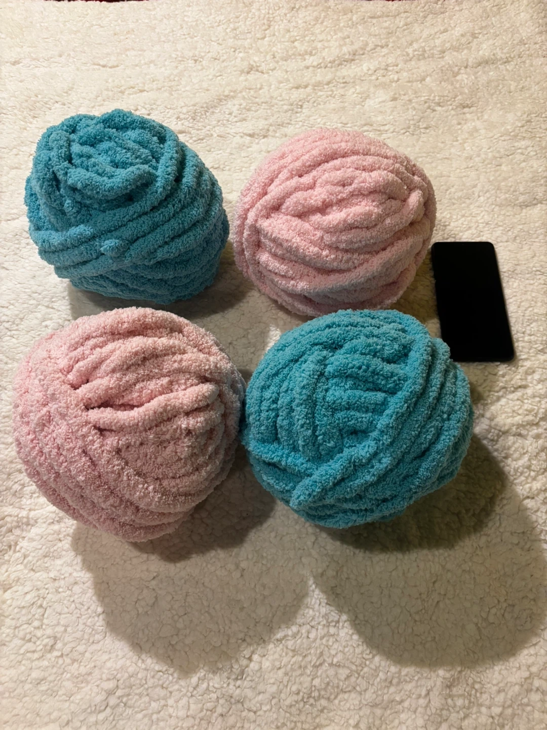 This set includes four balls of super chunky, soft yarn in pink and teal. It also comes with a teal crochet hook. Perfect for beginner knitters and crafters looking to make quick projects like blankets or rugs!