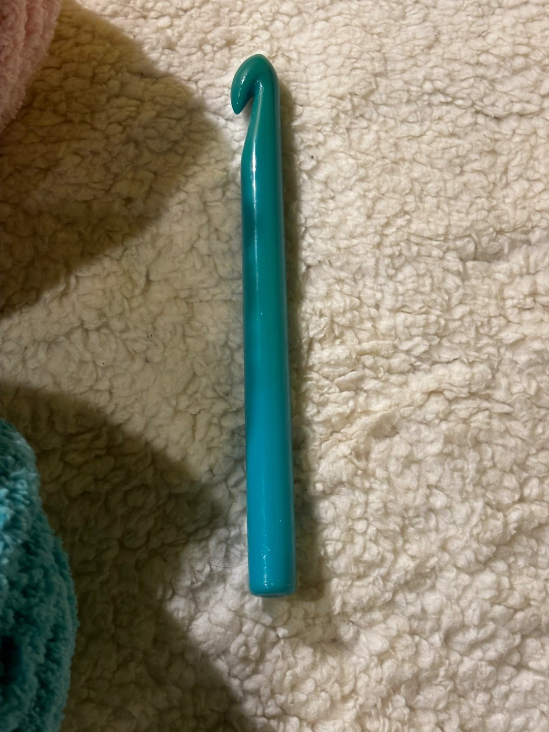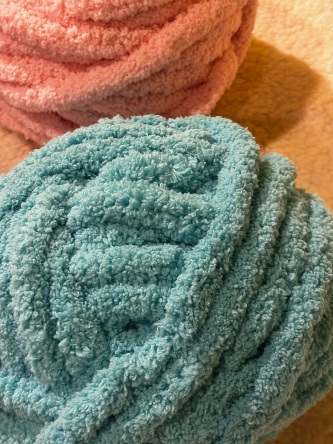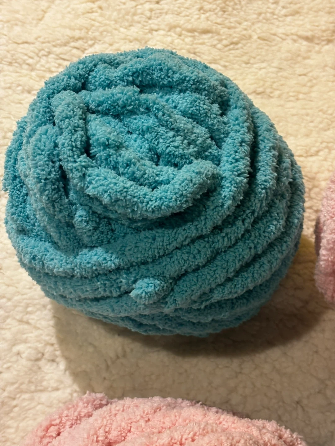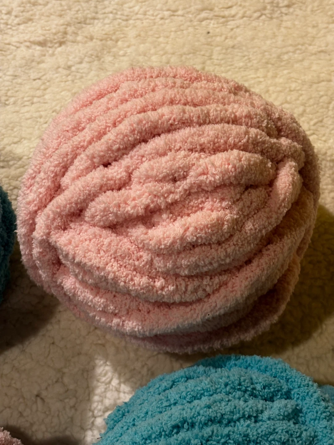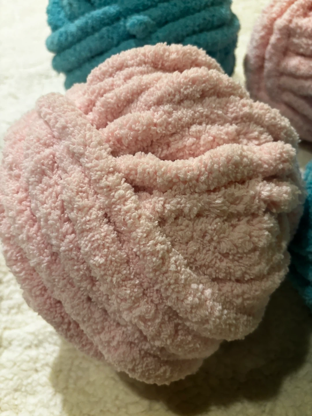 This set includes four balls of super chunky, soft yarn in pink and teal. It also comes with a teal crochet hook. Perfect for beginner knitters and crafters looking to make quick projects like blankets or rugs!