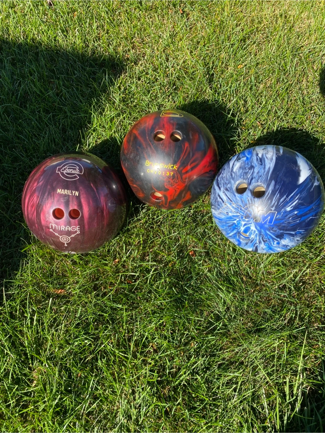 10Selling three used bowling balls. One is a Brunswick CHV0137, another is an Ebonite Marilyn Mirage, and the third is a blue and white ball. All have been used but are in good condition for someone looking to get into bowling or expand their collection. 30 dollars a ball