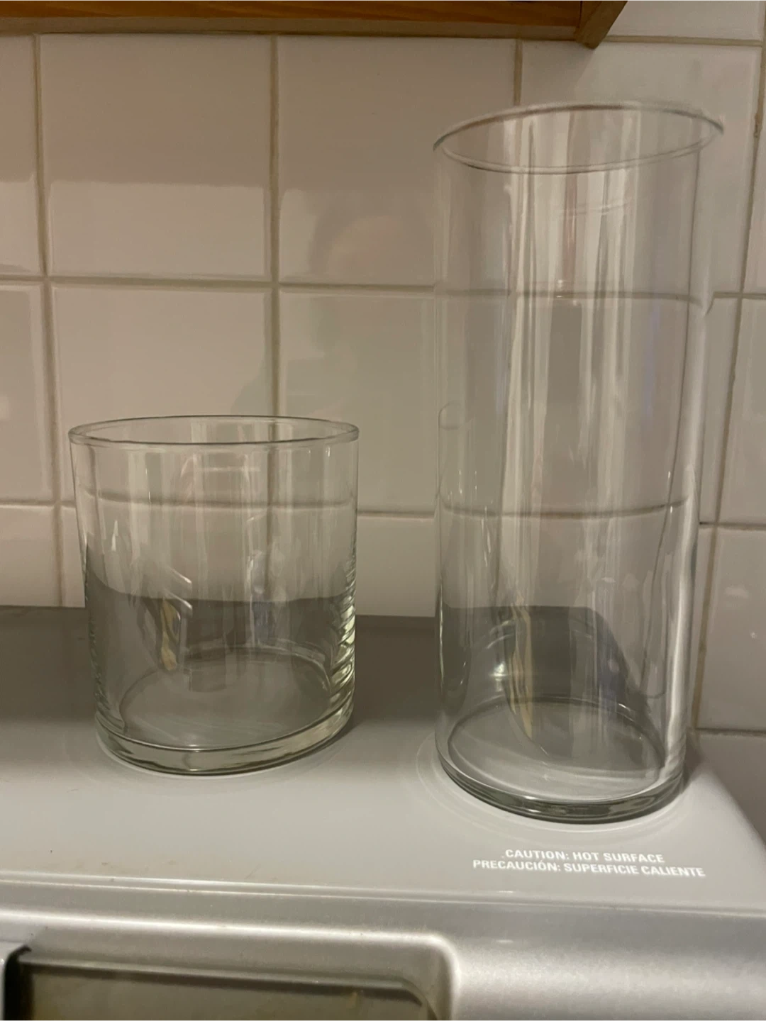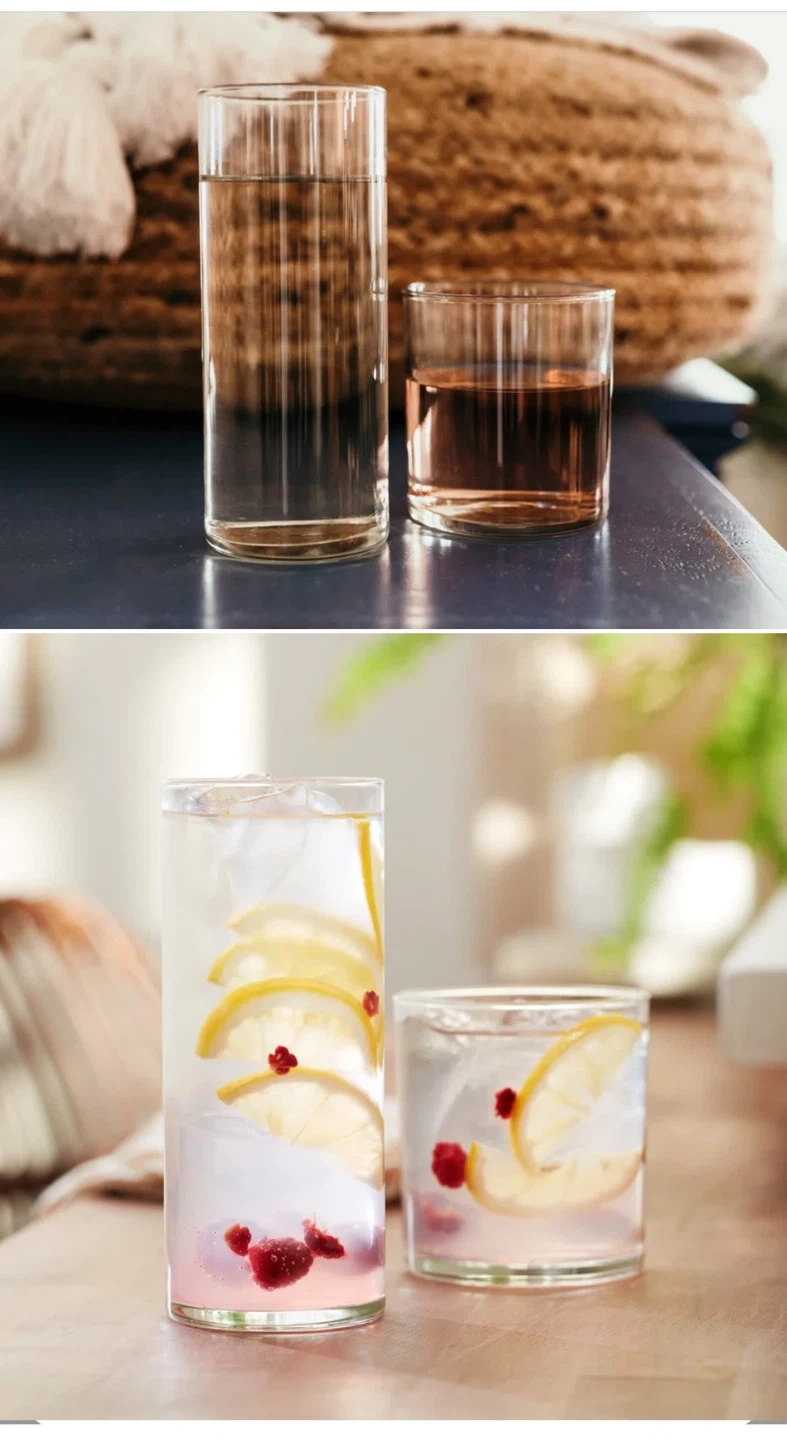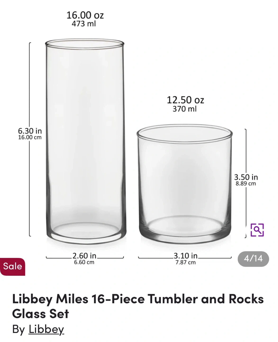 Set includes eight 16 oz. tumblers and eight 12.5 oz. rocks glasses. Tumblers measure 6.30 inches high with a 2.60-inch diameter. Rocks glasses measure 3.50 inches high with a 3.10-inch diameter. Made of glass.