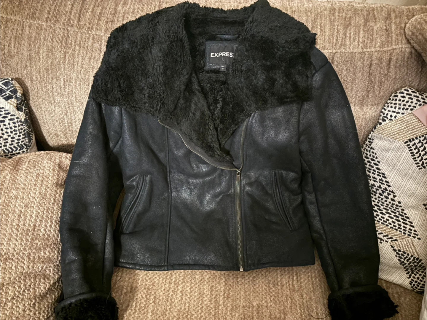 Stylish black faux leather moto jacket from Express. It features a cozy sherpa lining and collar for warmth. Zipper front with two zip pockets. Ribbed details on cuffs and hem.