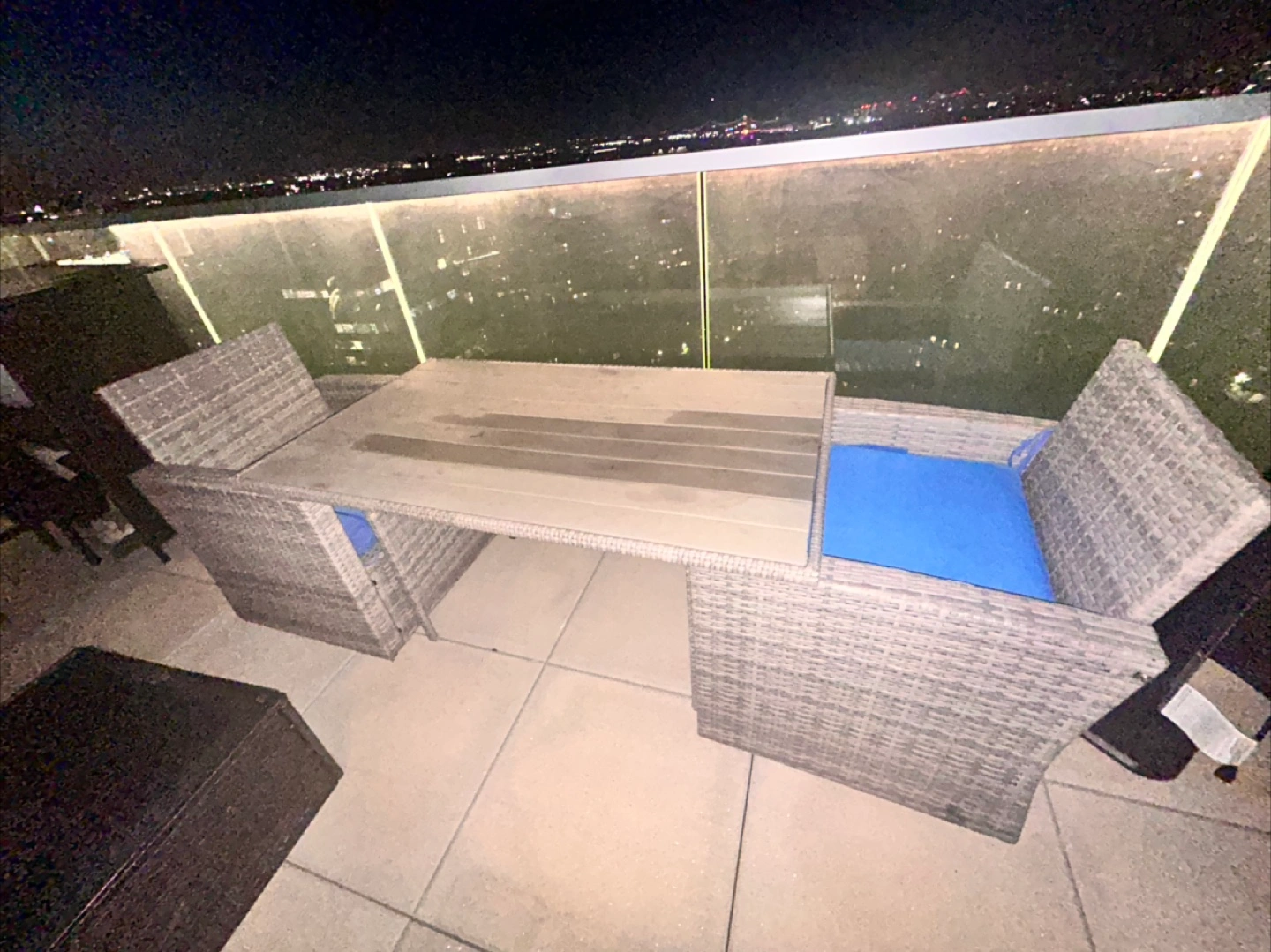 Selling an outdoor wicker patio dining set! The set includes a table and two chairs with blue cushions. Perfect for enjoying meals outside