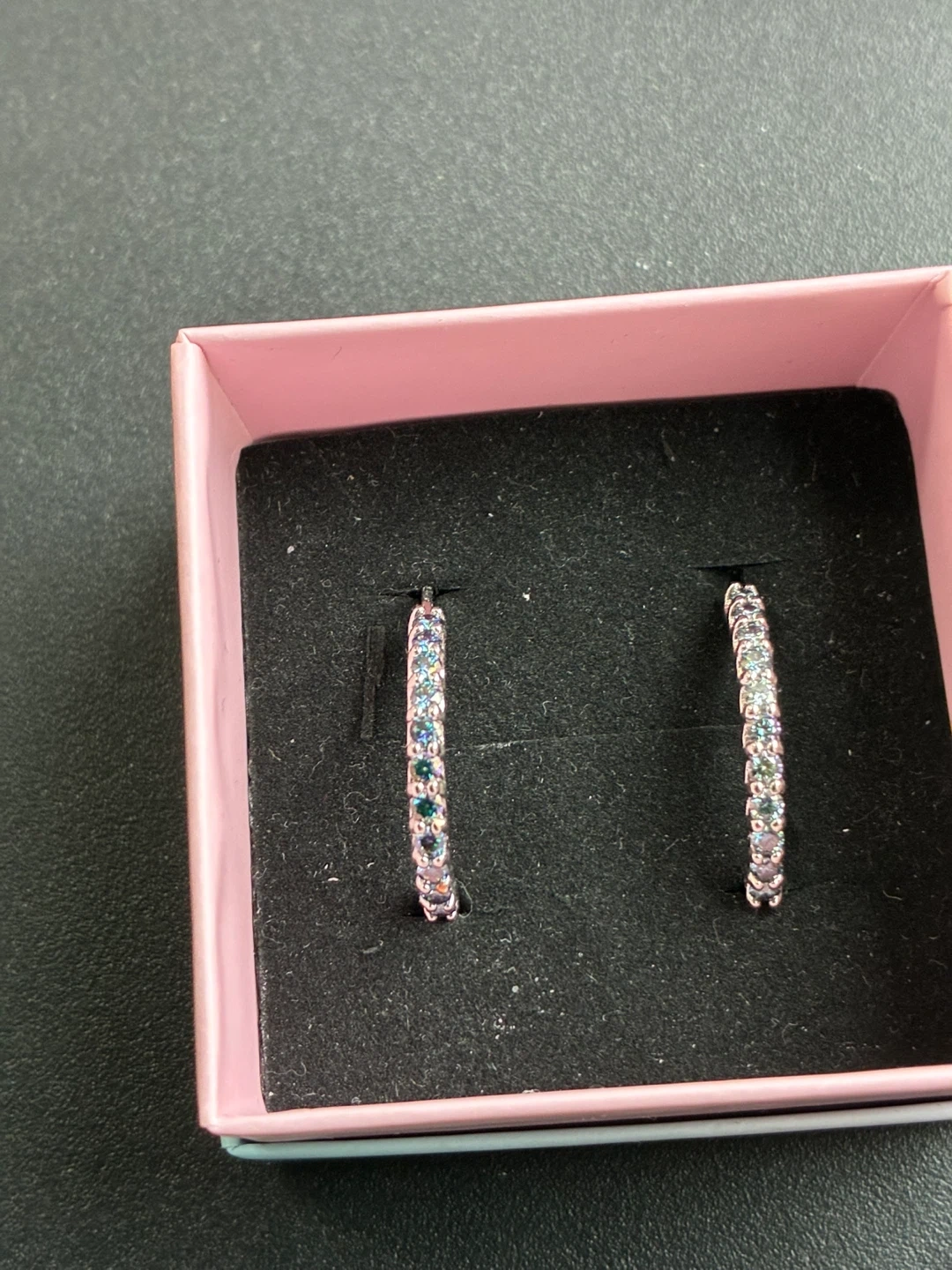 A pair of Moissanite Rainbow Blue hoop earrings. They're accented with small, multicolored Moissanite gems along the front of the hoops.