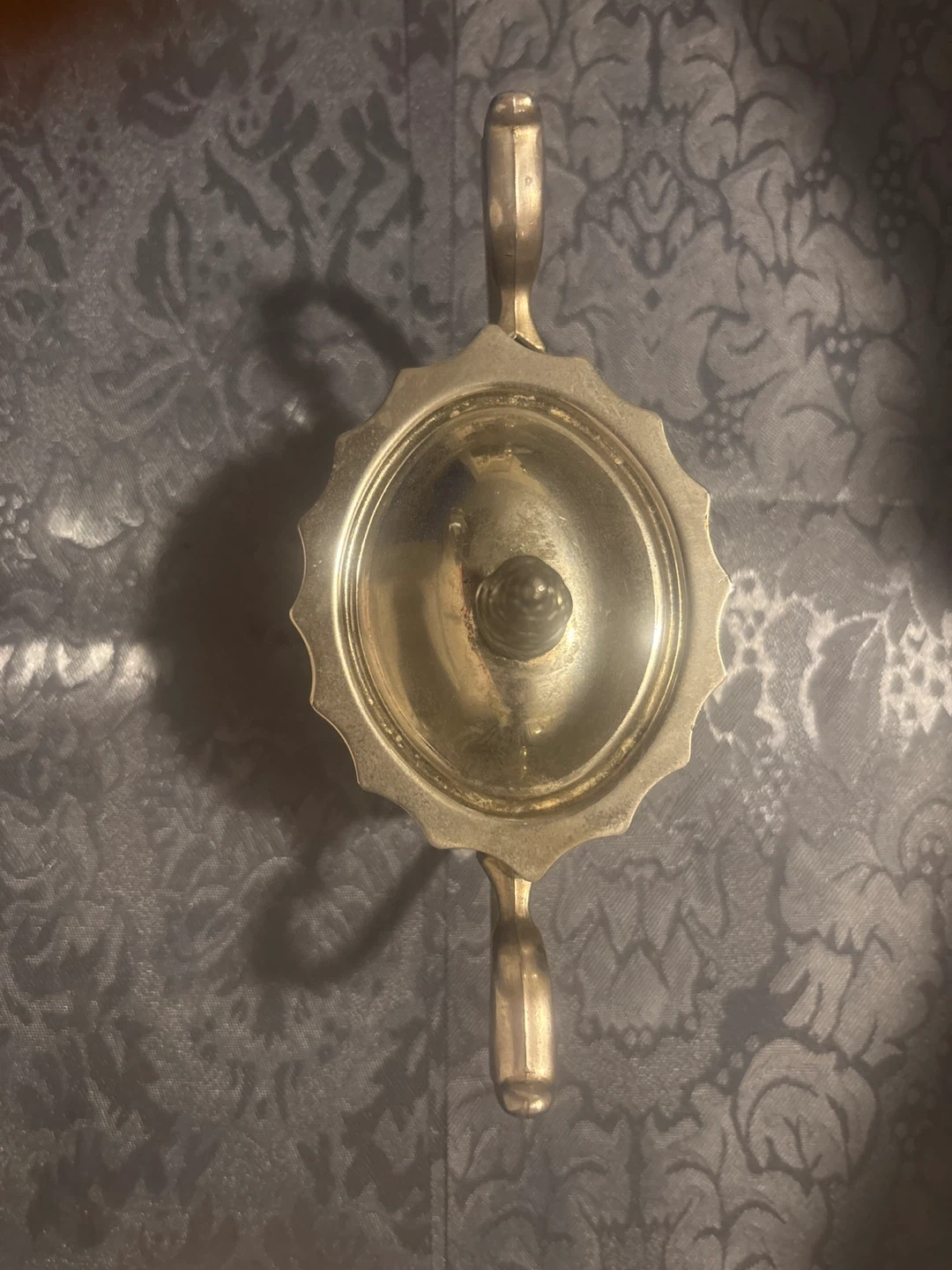 This vintage sugar bowl features a decorative fluted design and two elegant handles. It comes with a matching lid topped with a finial. Made from silver-plated metal, it's perfect for serving sugar at tea time or for display.
