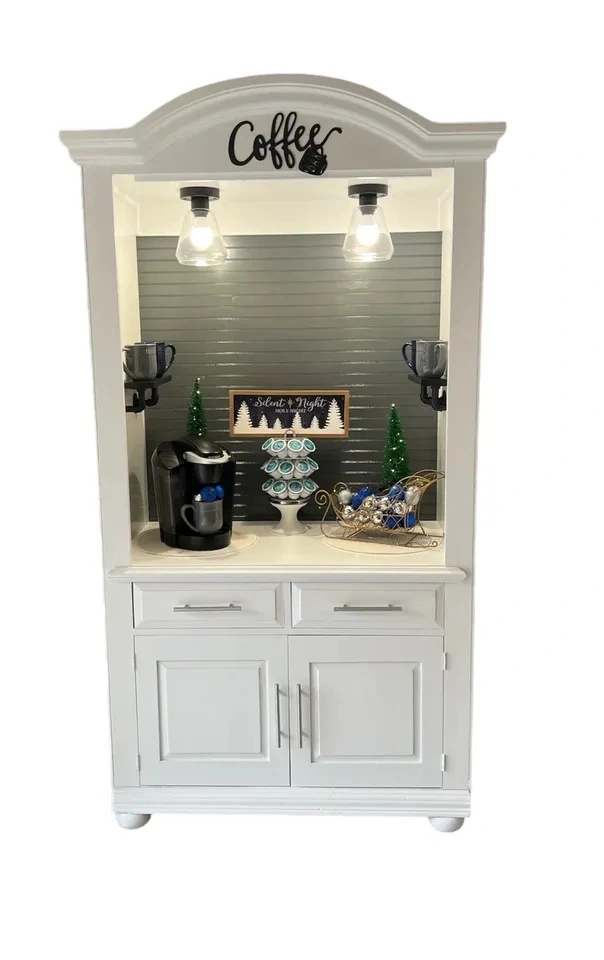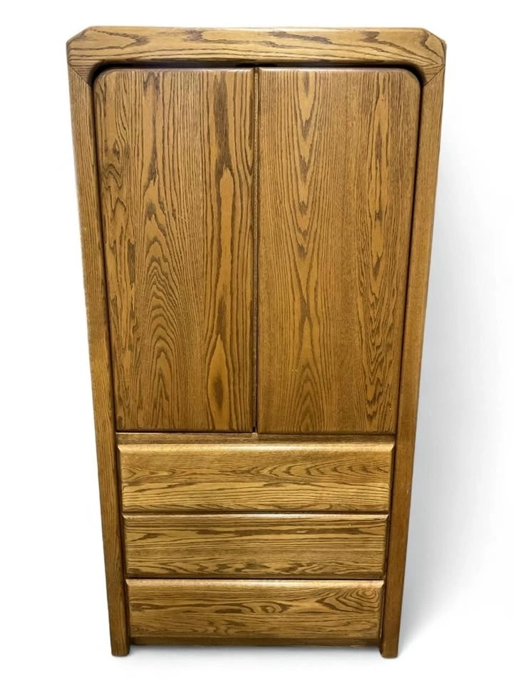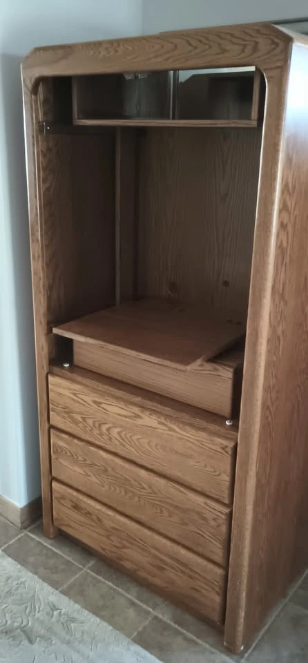 This Arbek armoire can fit a 30-inch flat screen TV if the doors are removed. It's been used as a coffee bar and could also work as a stand-up PC workstation. Get creative with its uses! The unit is heavy and will require two strong people to move. You'll need a large SUV or a pickup truck; an appliance dolly might be helpful. Located on the far west side of St. Charles, Illinois, off Campton Hills Rd., about 2 miles west of Peck. If this post is up, the item is still available. The last picture is just an idea for a coffee bar setup. Approximate dimensions are 36"W x 23"D x 73"H.