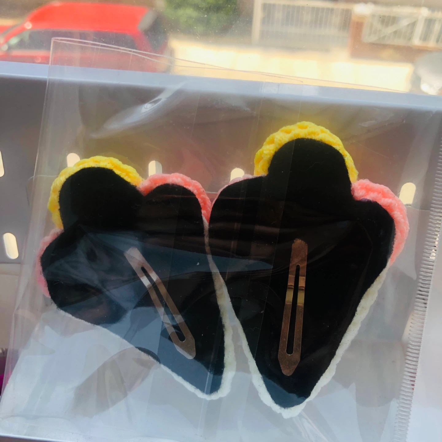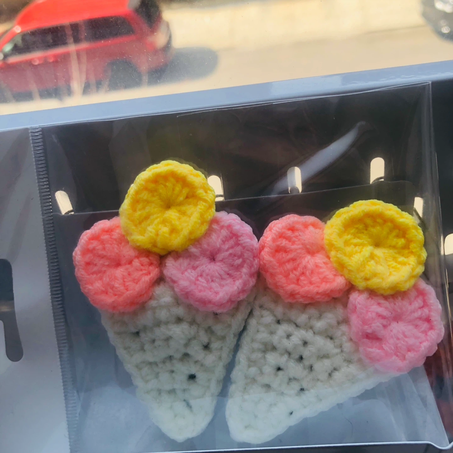 These adorable hair clips are handmade with crocheted yarn, shaped like ice cream cones. They have bright pink, yellow, and white accents. Perfect for adding a fun touch to any hairstyle!