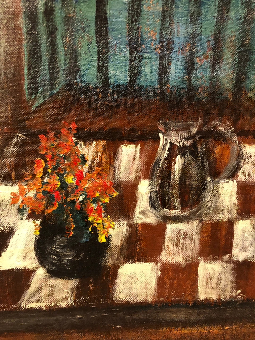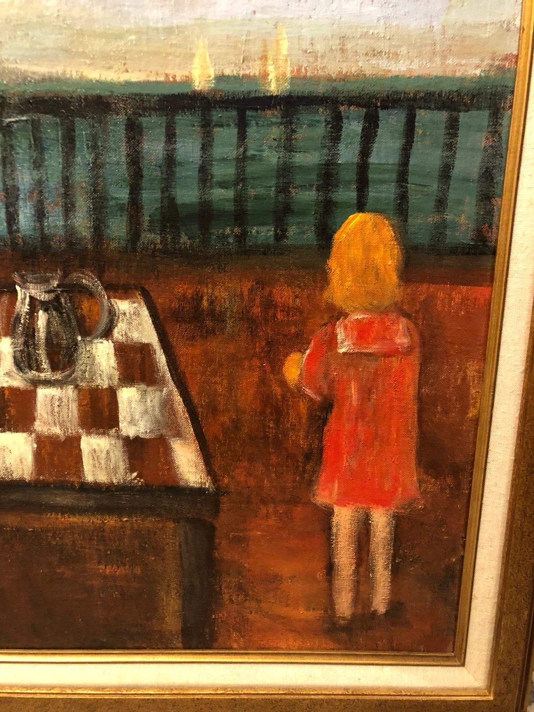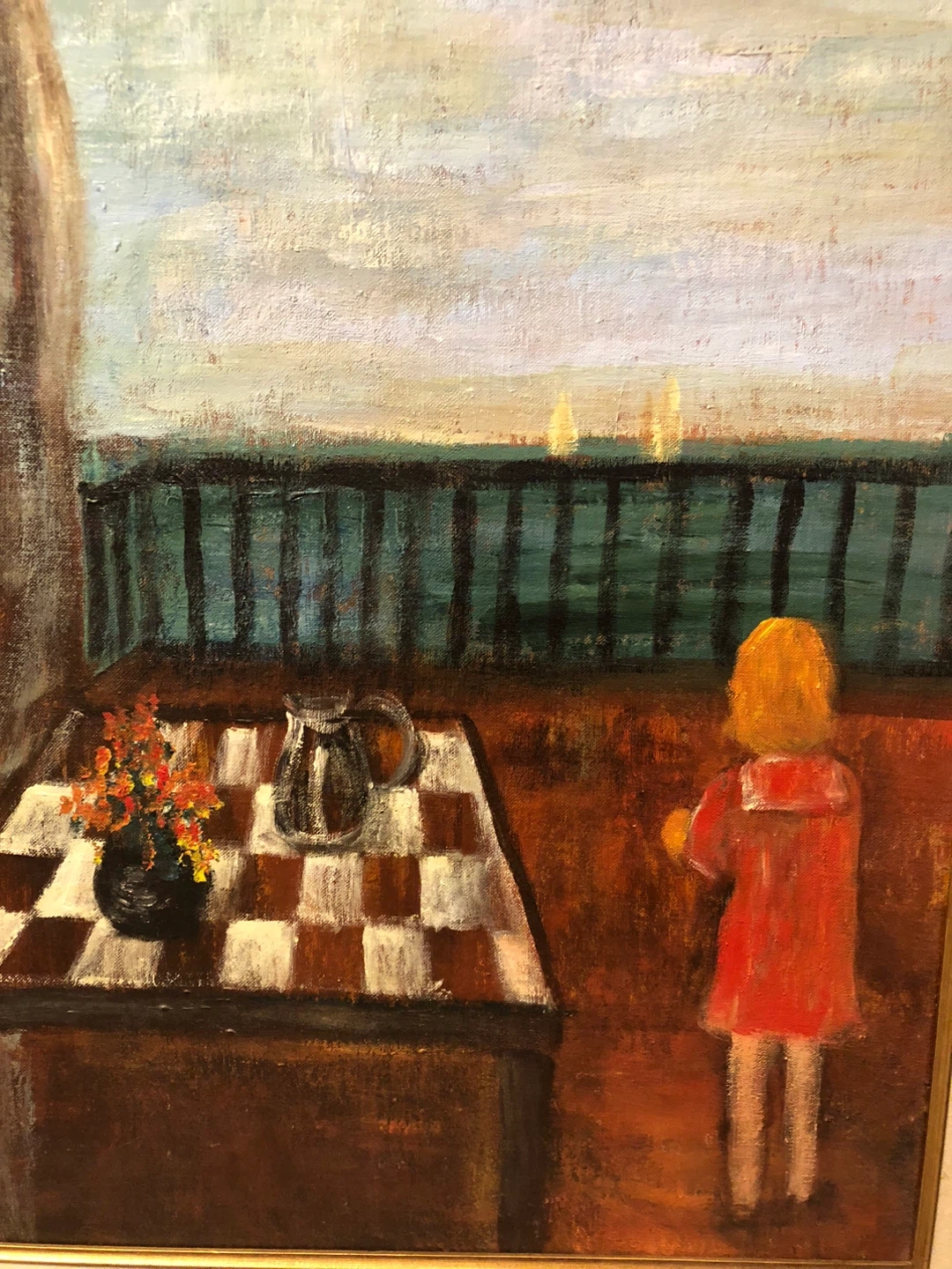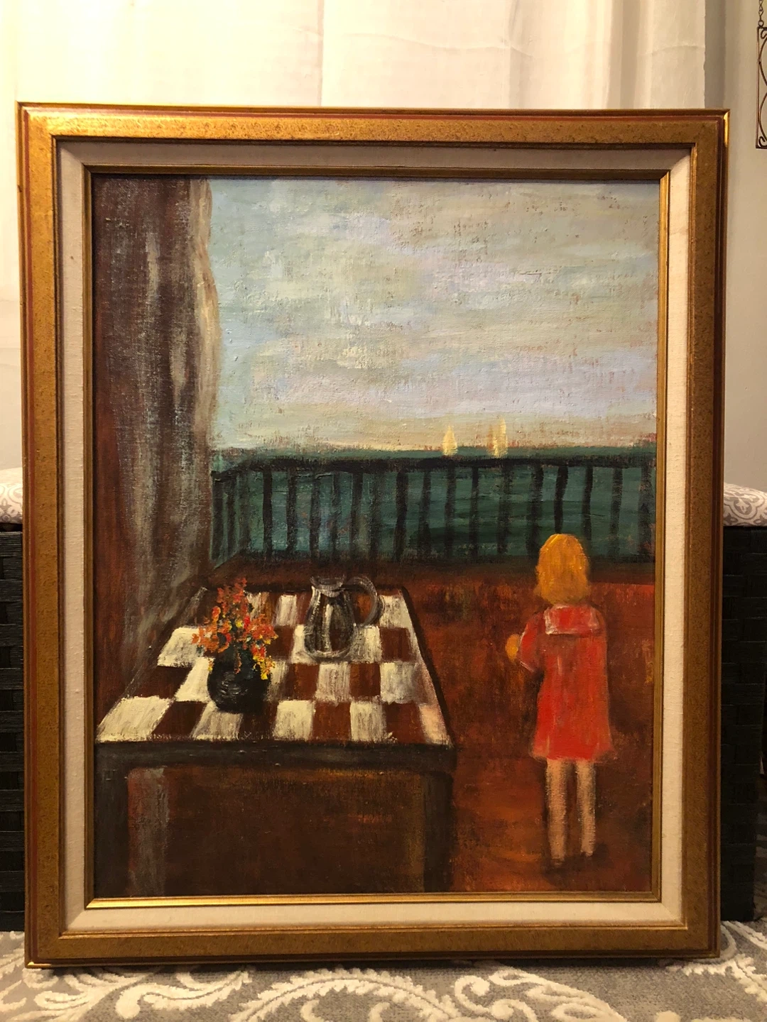 This surrealist acrylic painting with a girl in a red dress coat and a large checkered tablecloth appears to be an original work by unknown artist.Artwork depicts a still life with a pitcher and flowers on a checkered tablecloth, with a young girl in red looking out at a seascape. Framed and ready to display!
