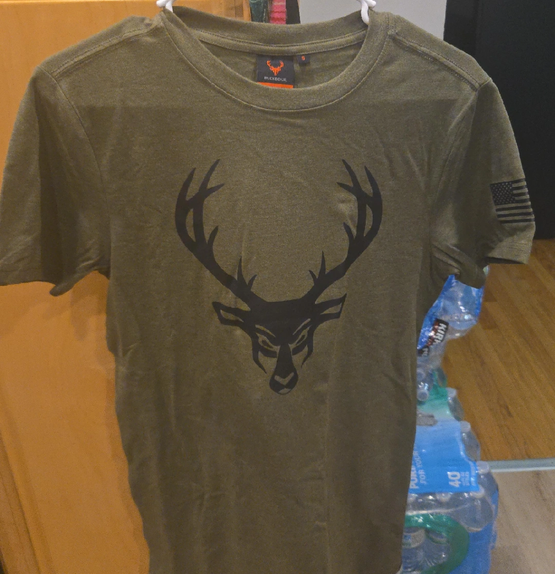 65Selling a Bucked Up olive green t-shirt with a stag design! It's a size small and features an American flag on the sleeve