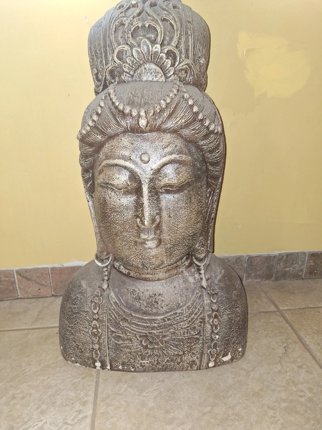 25I'm selling a Buddha head statue. It's a unique decorative piece that could add a peaceful vibe to any room or garden. It has some signs of wear, but it's still in good condition