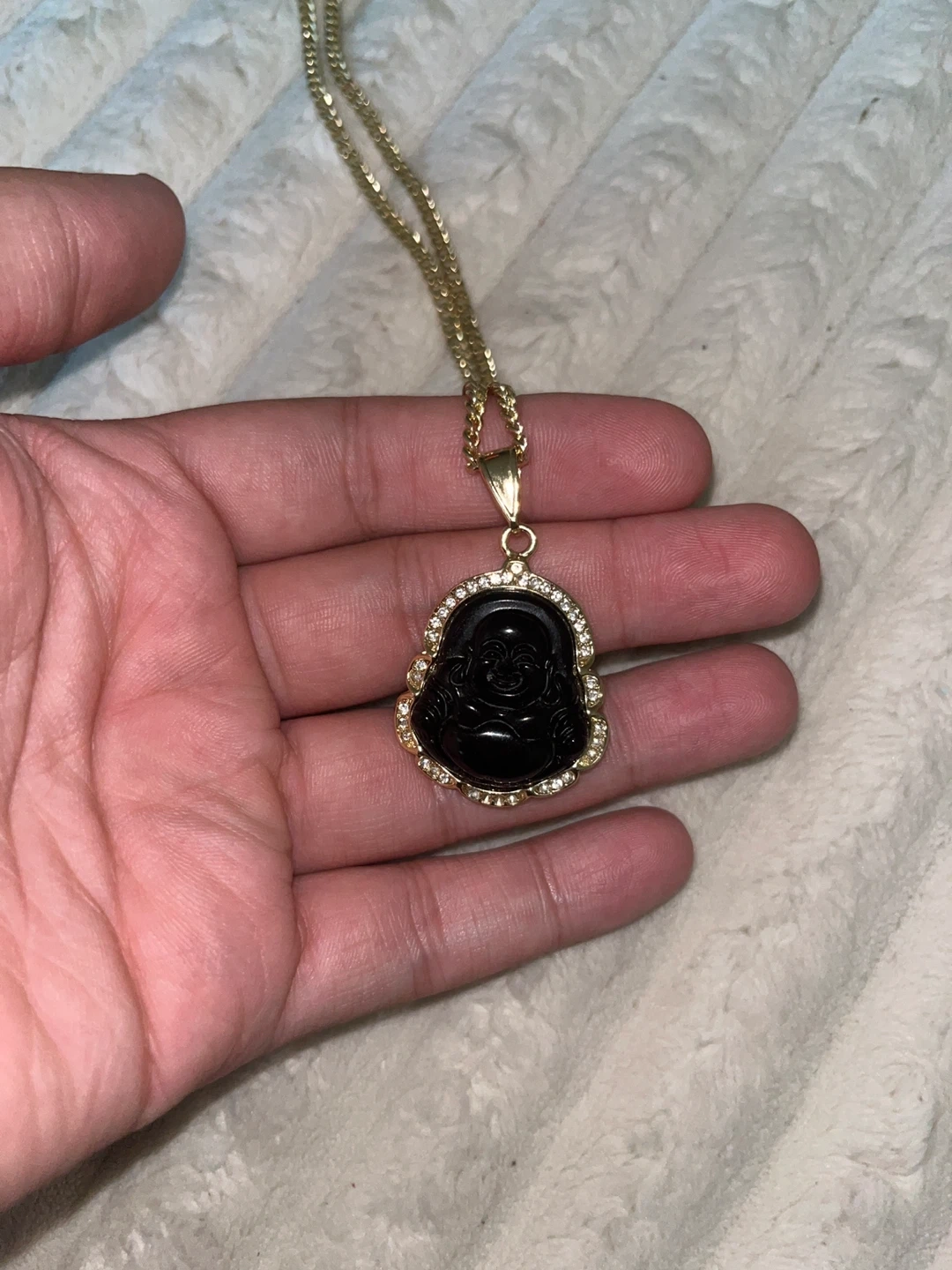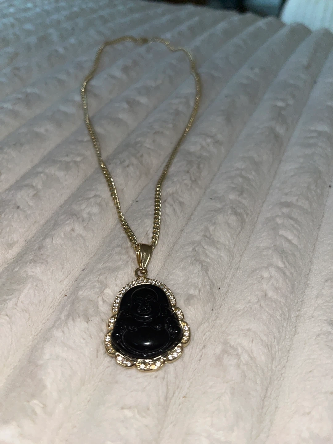 Selling a gold-tone necklace with a black Buddha pendant. It's in great condition and ready for a new home!