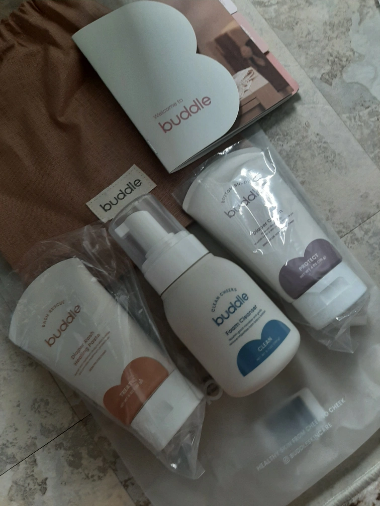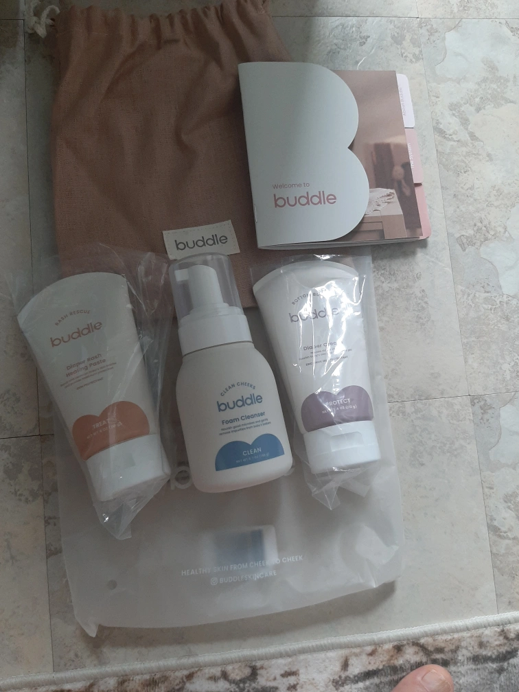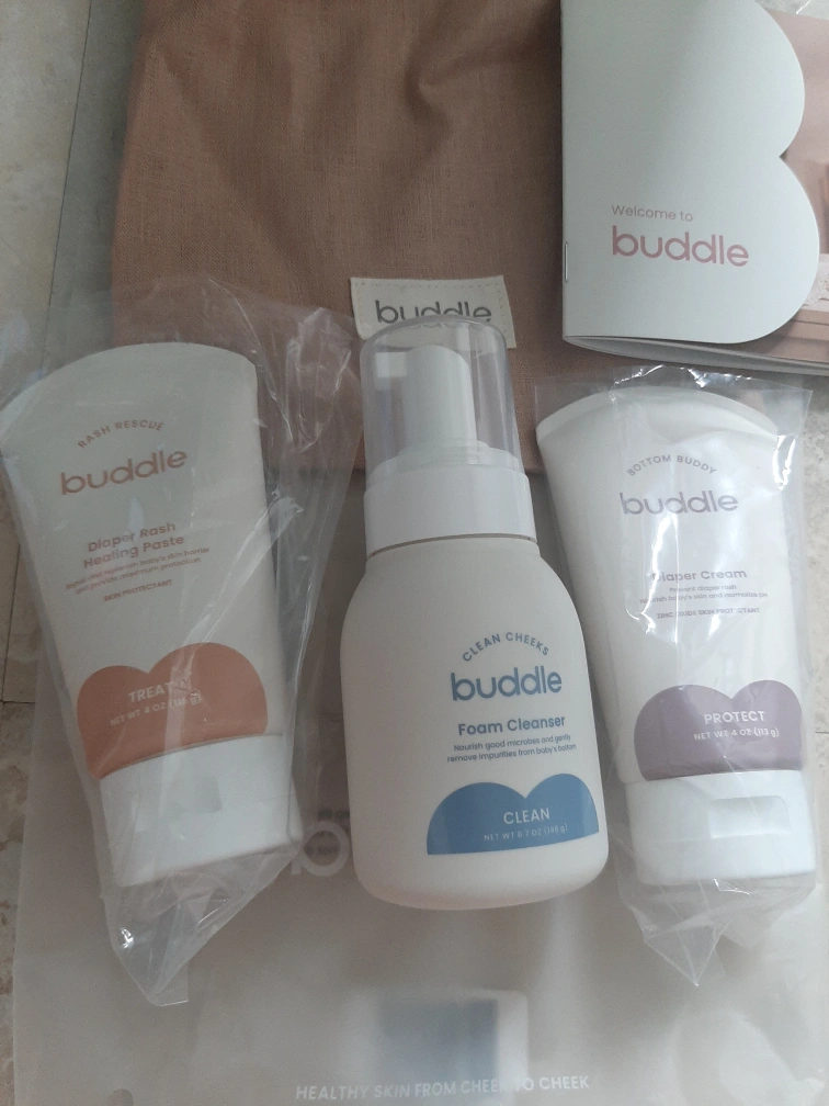 10I'm selling a Buddle skincare set with various items still sealed in their original packaging. It includes a foam cleanser, diaper rash cream, and diaper cream. There is also a welcome booklet and a bag. Use these gentle skincare products for your baby to help them relax.