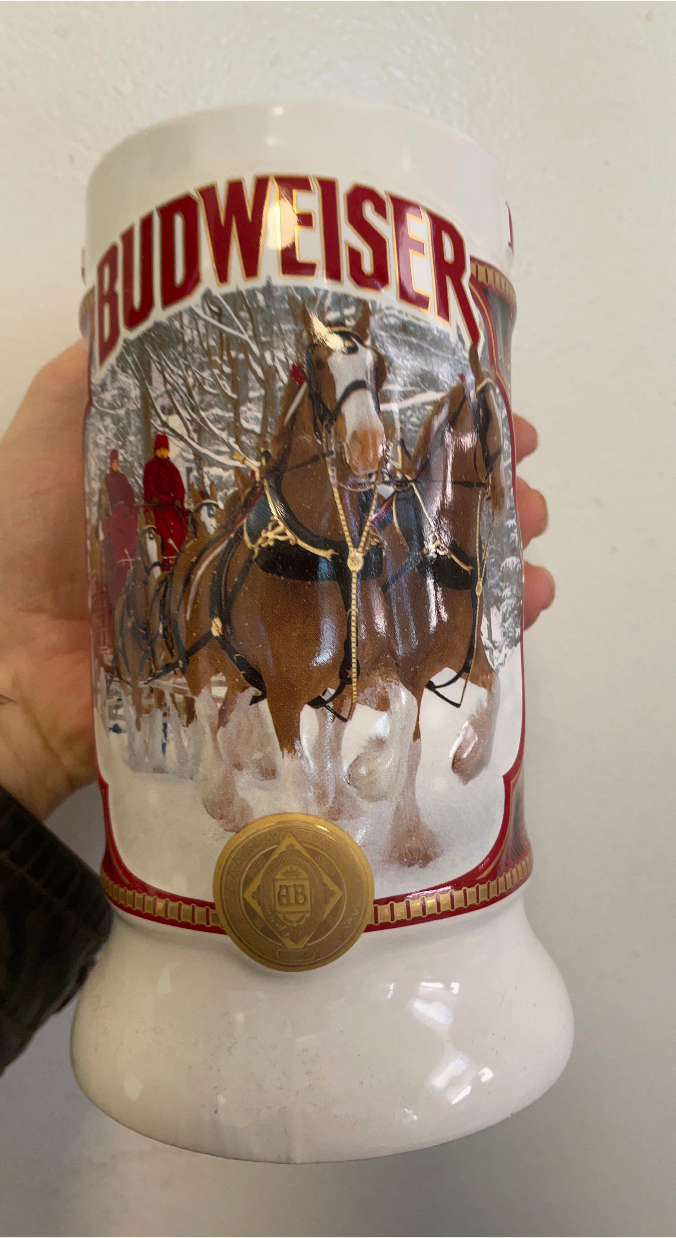Selling a Budweiser Clydesdales stein! It features the iconic team of horses pulling the wagon through a snowy scene. The stein is in good condition and would be a great addition to any collection