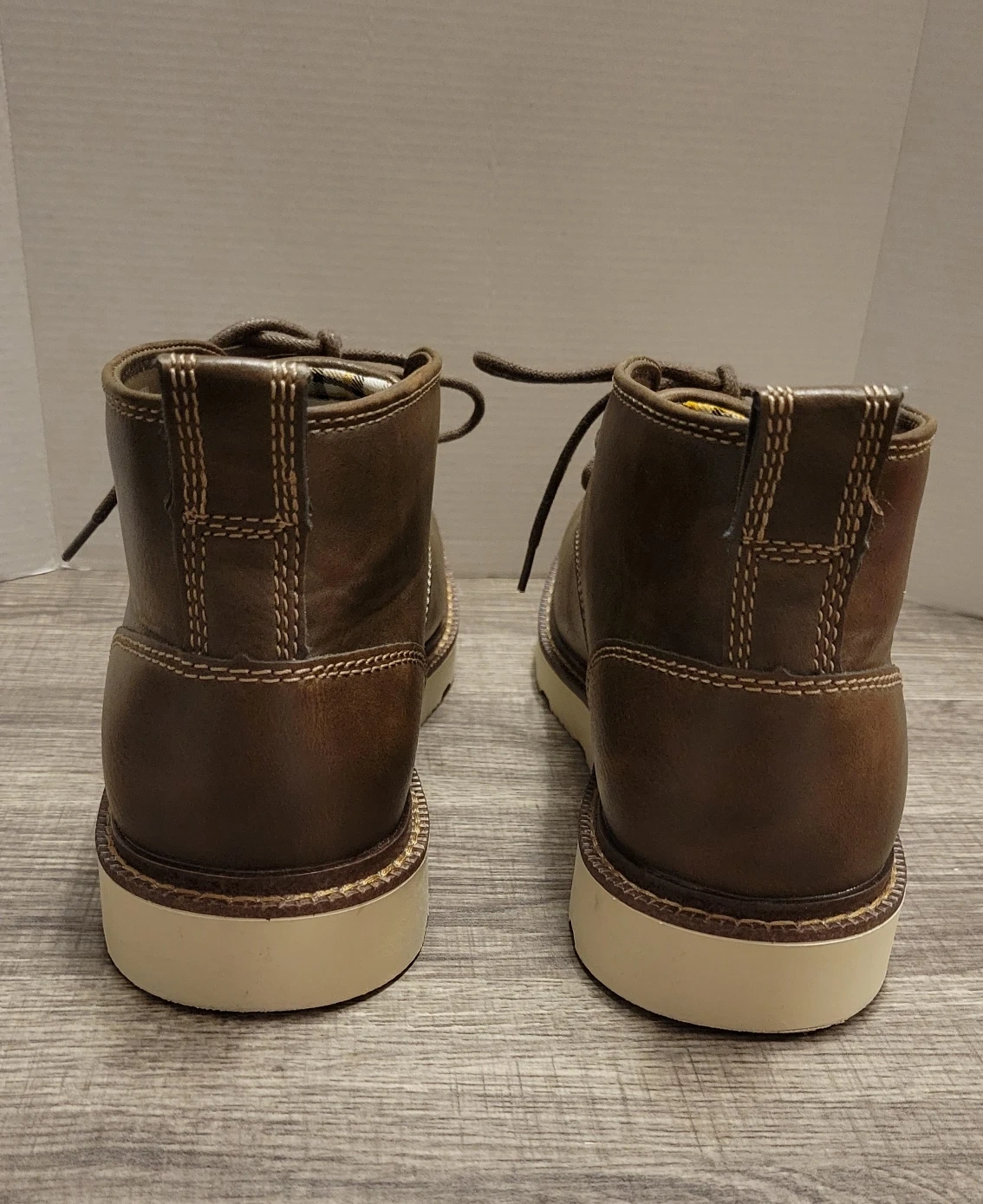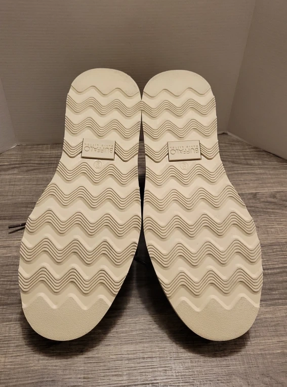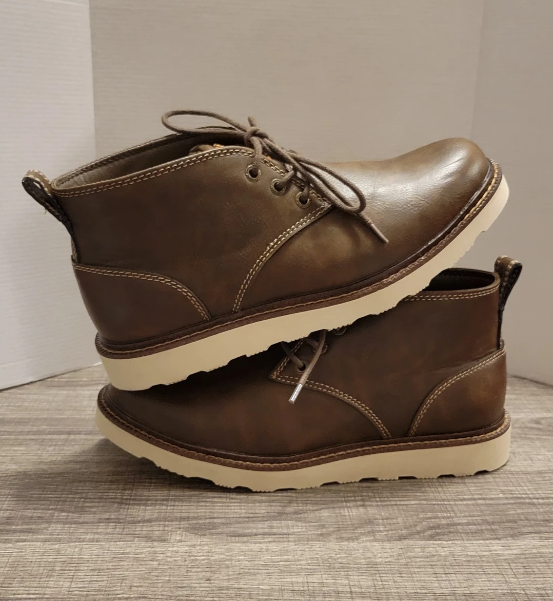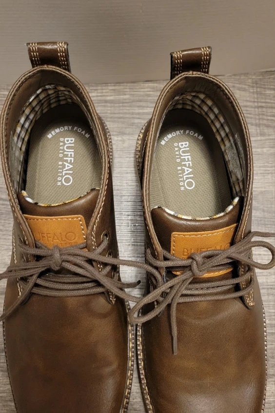 584Selling a pair of Buffalo David Bitton Metcalf chukka boots in size 9M. These stylish boots feature a brown leather-like upper with contrasting white stitching and a comfortable white sole. The inner lining has a cool plaid pattern. They are in great condition and ready for a new home!