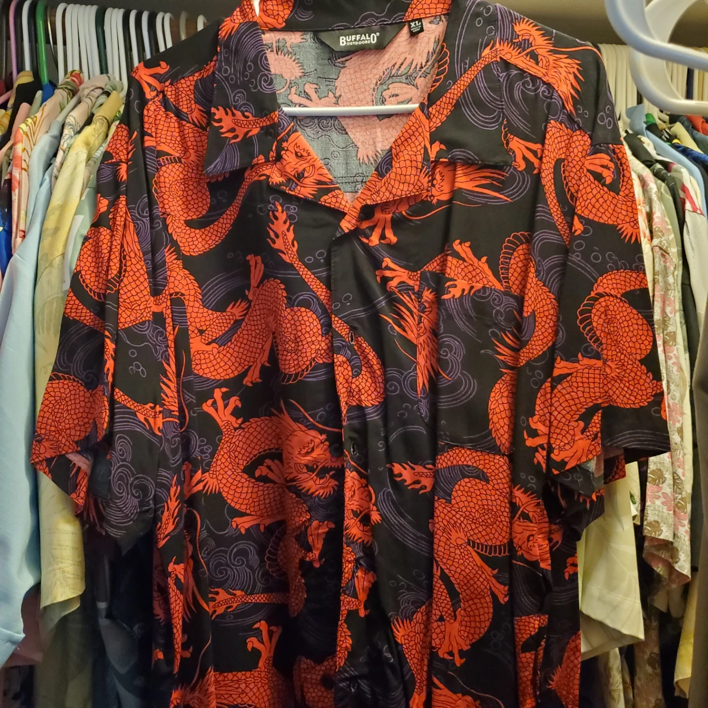 18Here's a stylish Buffalo Outdoors button-down shirt with a cool dragon print! It's a size XL and features a striking design with red dragons on a black background. Perfect for adding a unique touch to your wardrobe!