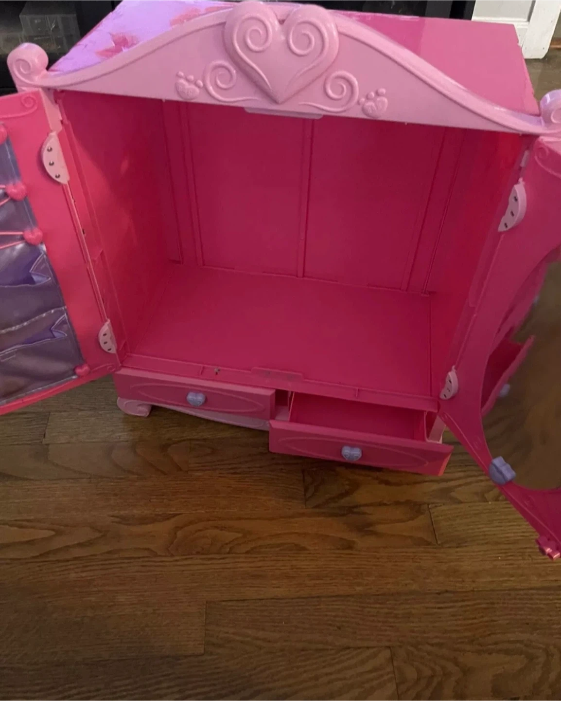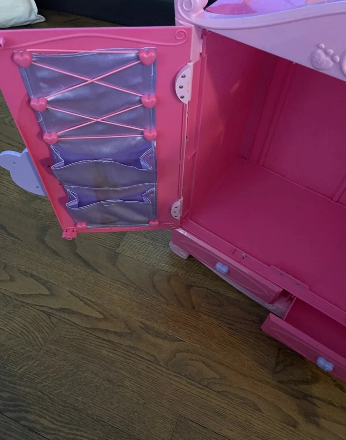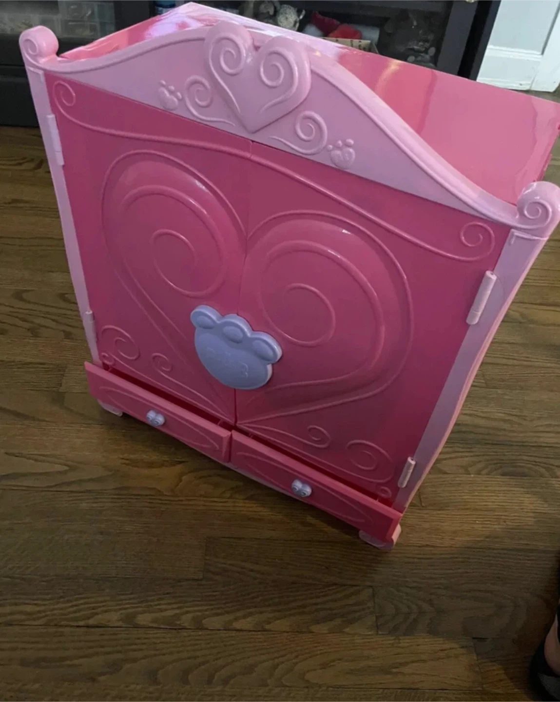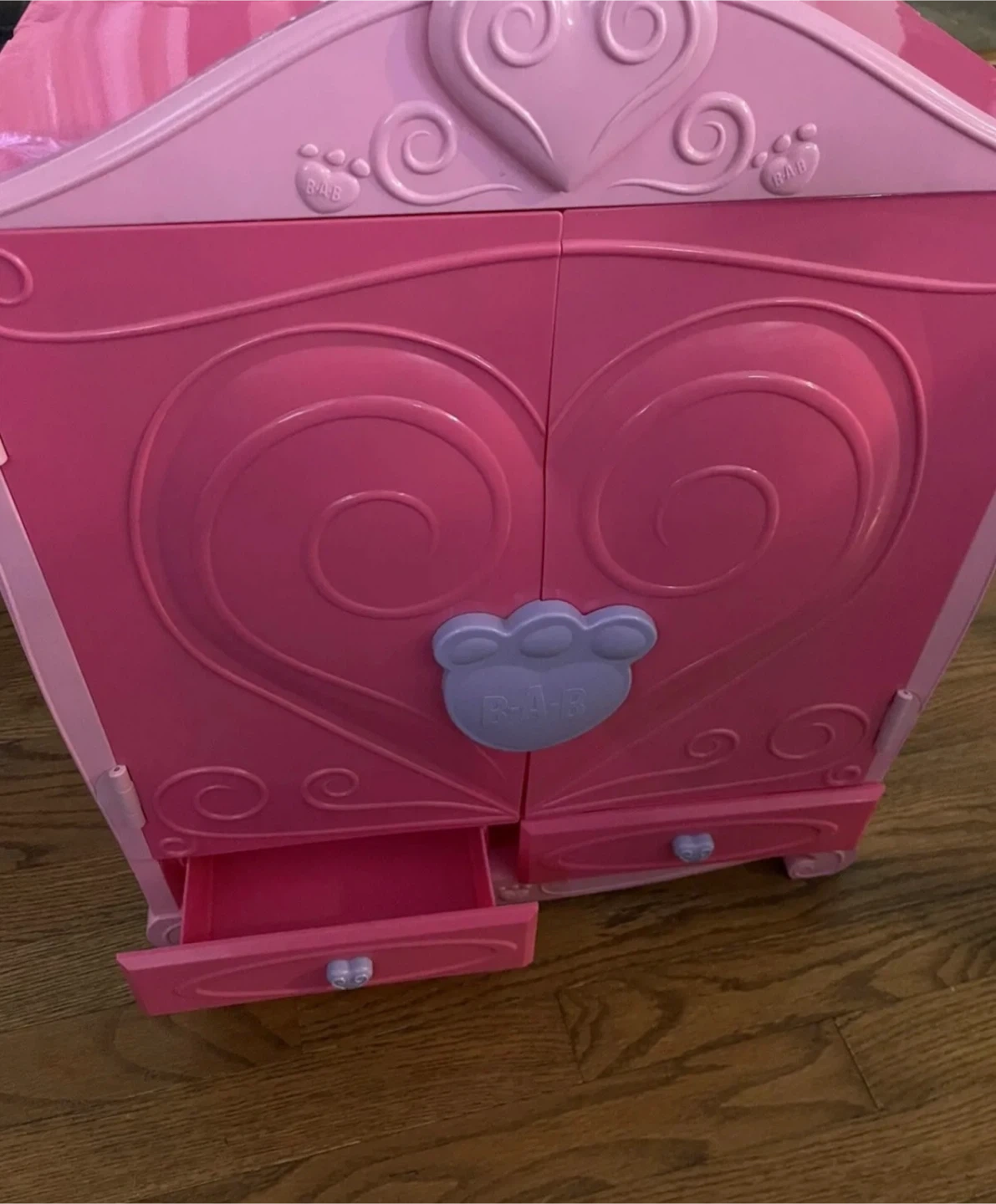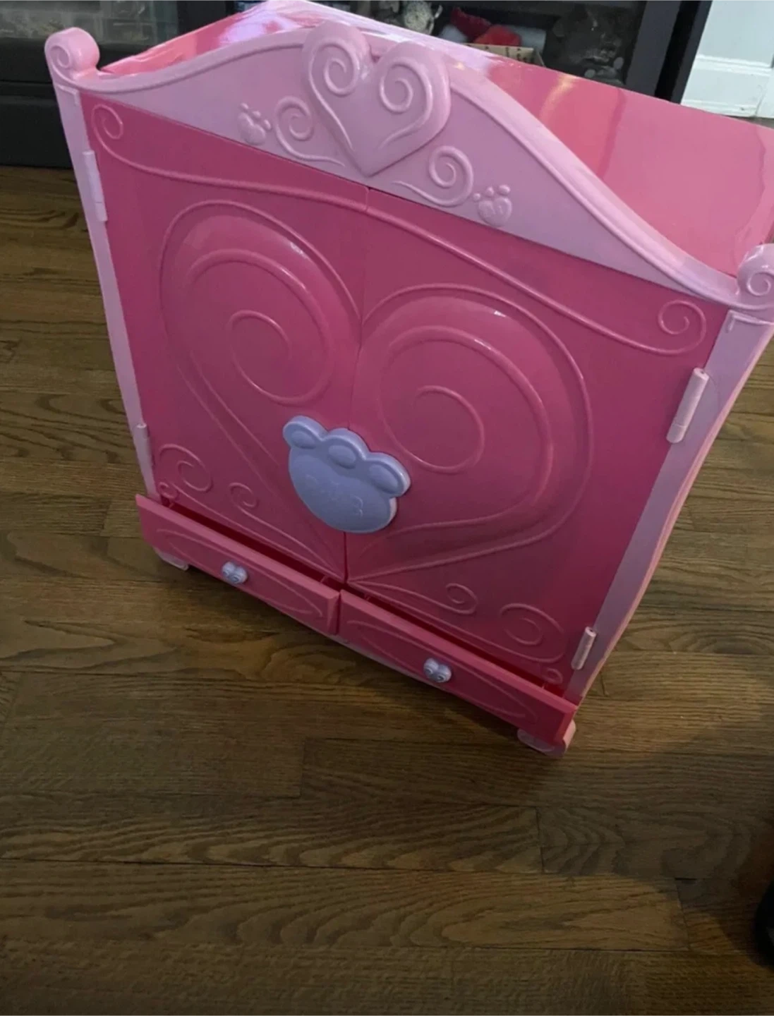 Selling a Build-A-Bear armoire. It's pink and has a cute design with hearts and the Build-A-Bear paw print. It also has drawers for storing your furry friends' clothes and accessories