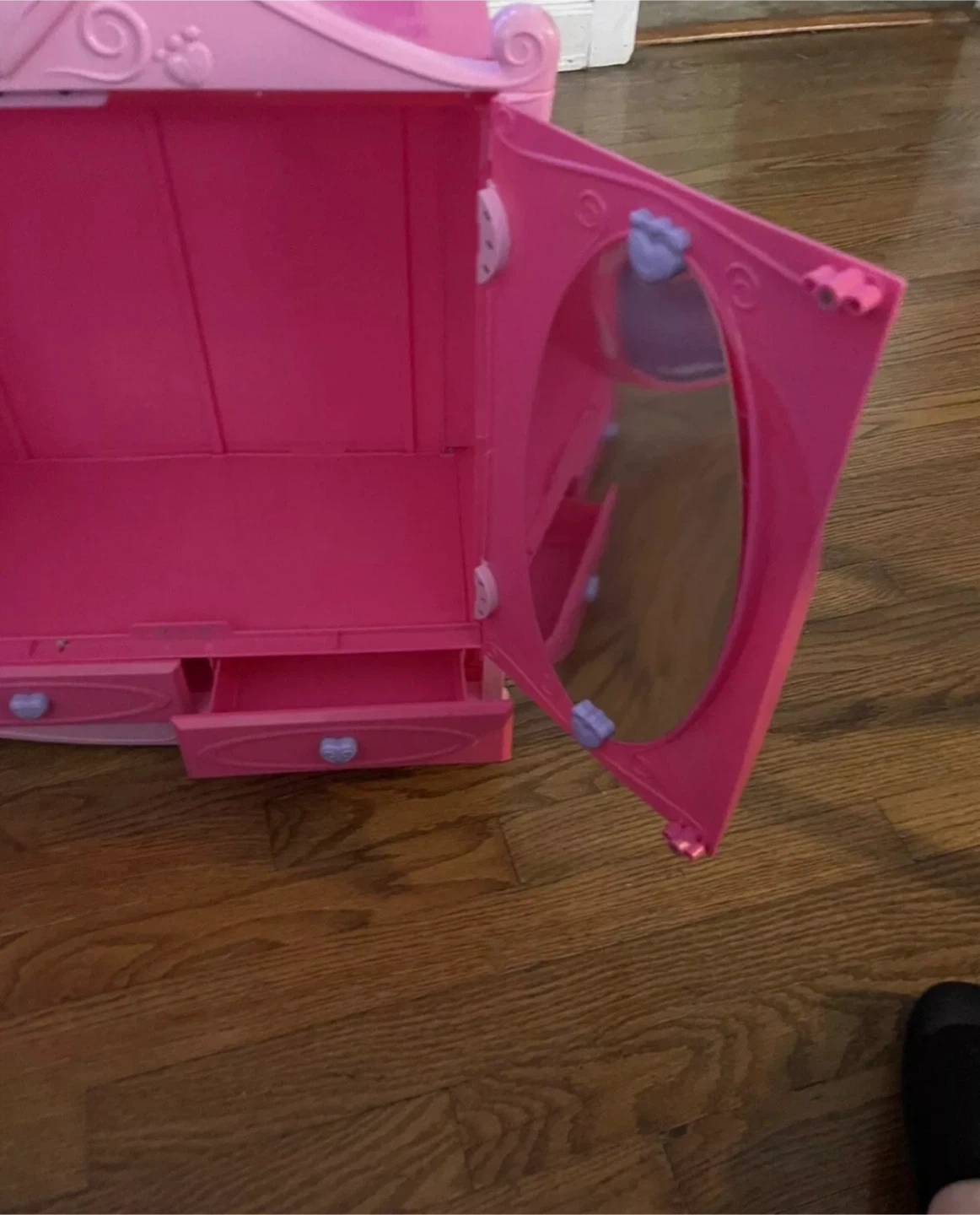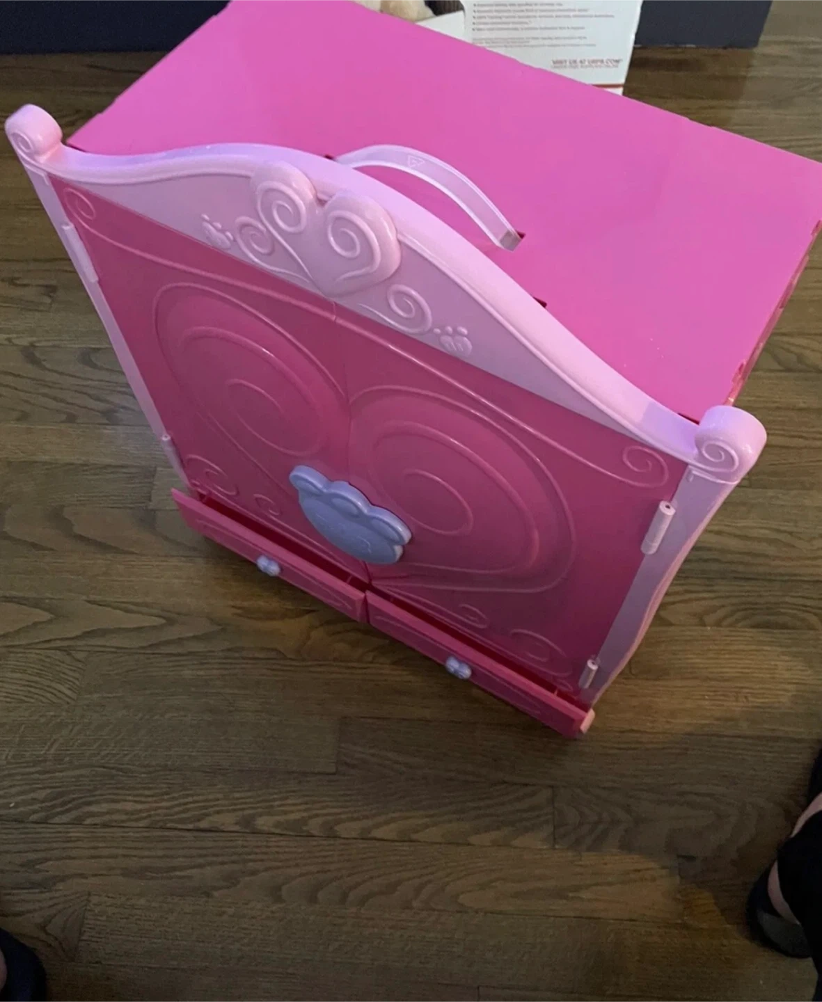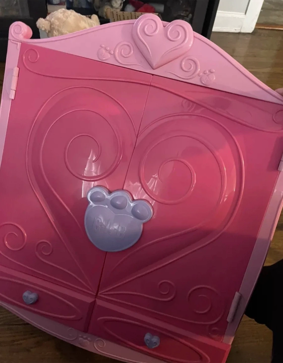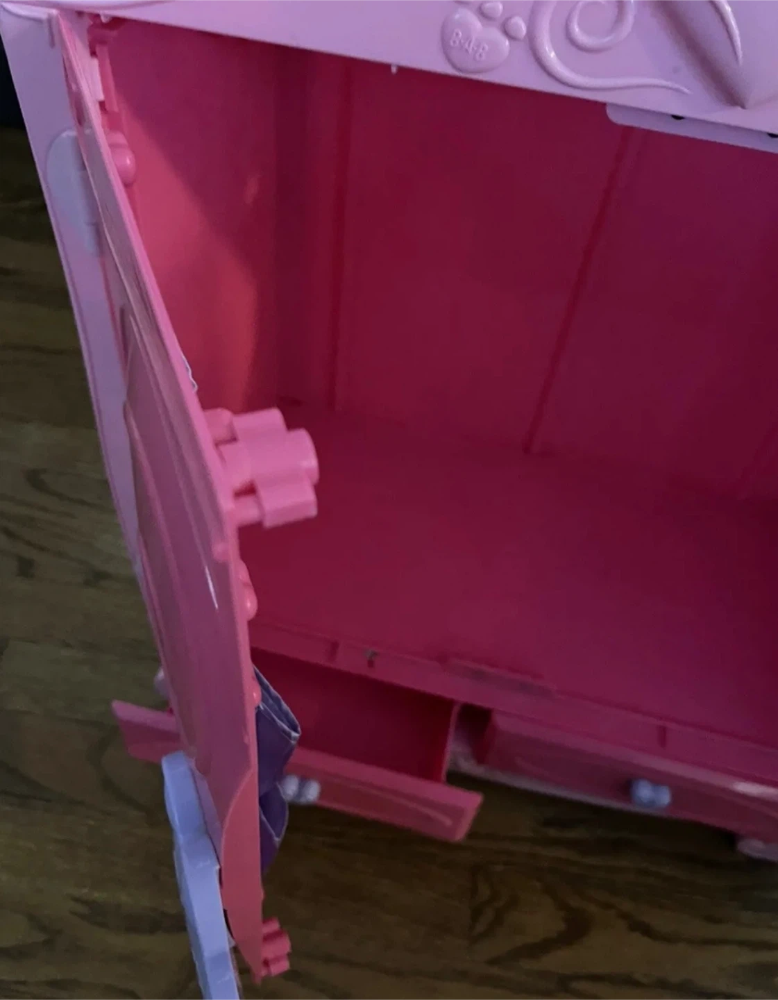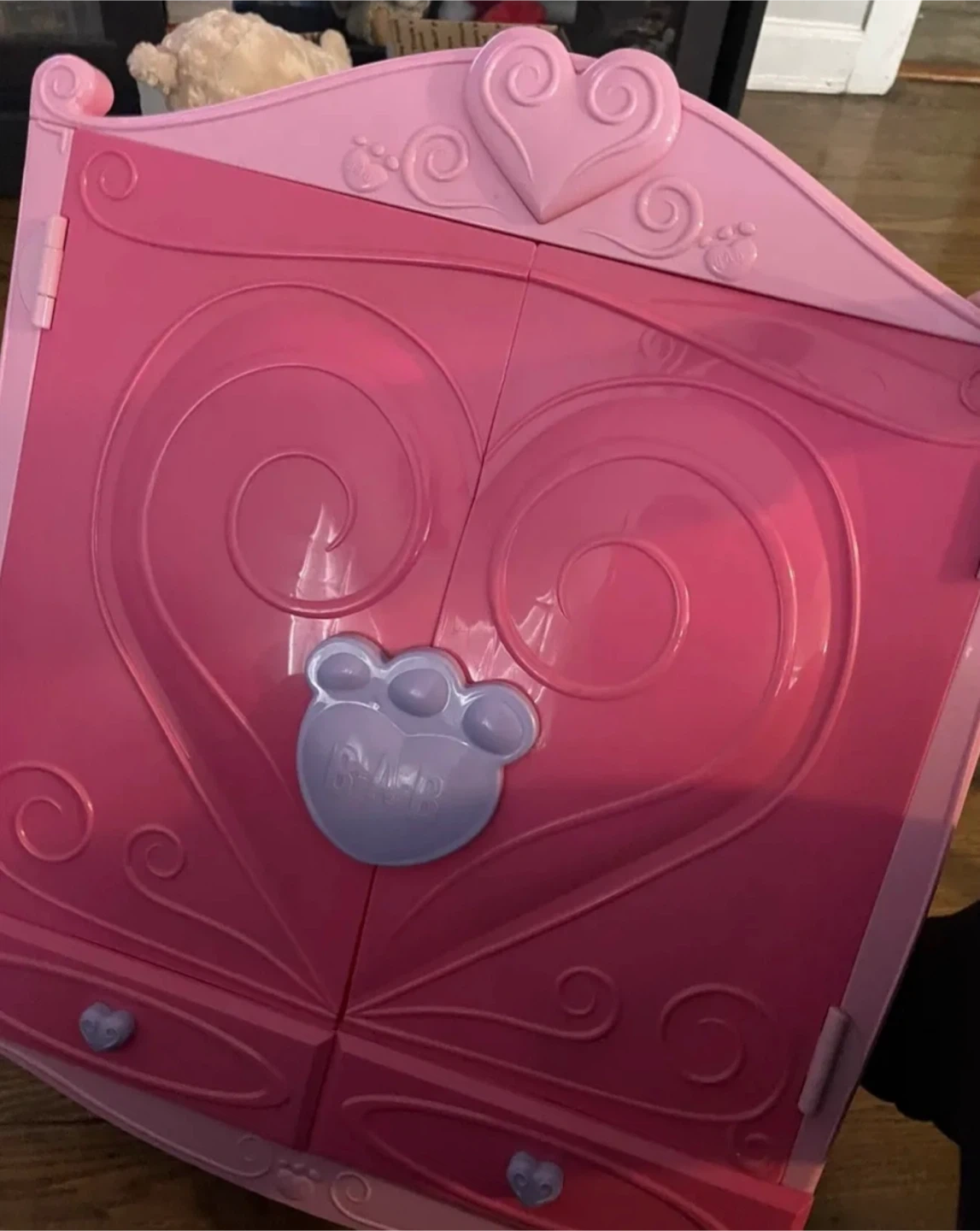 Selling a Build-A-Bear armoire. It's pink and has a cute design with hearts and the Build-A-Bear paw print. It also has drawers for storing your furry friends' clothes and accessories