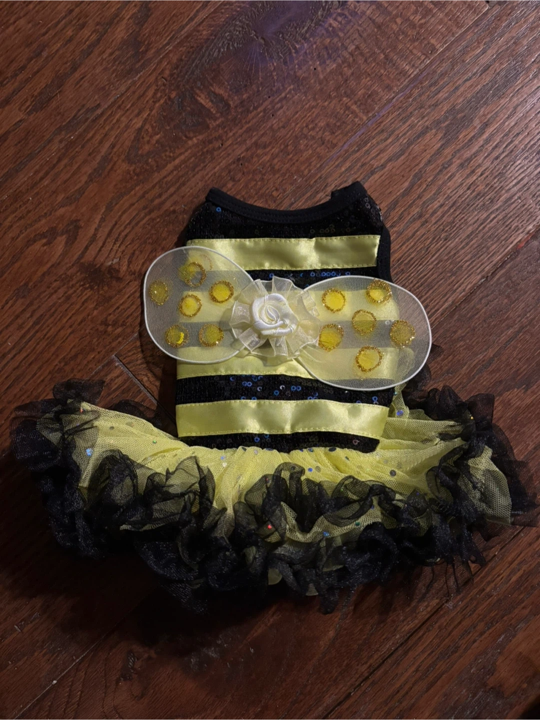 15This is an adorable bumble bee dog/cat costume! It features black and yellow stripes, a cute little bow, and frilly black trim. Perfect for Halloween or just for fun! Size X-Small!