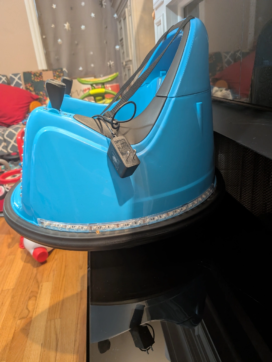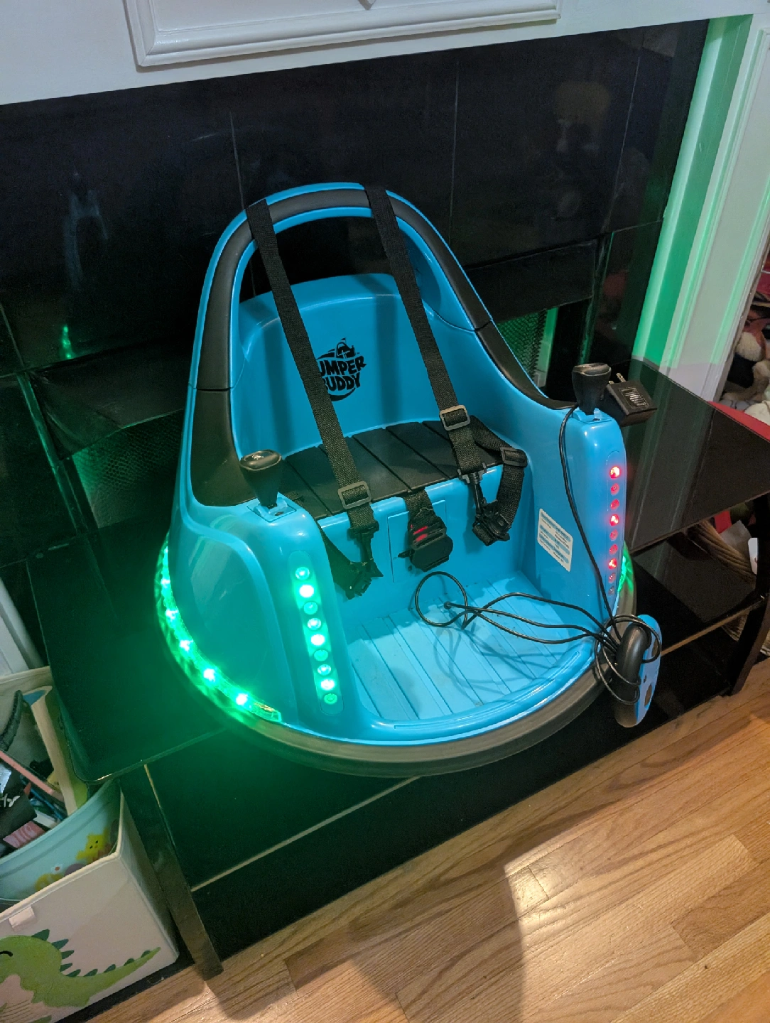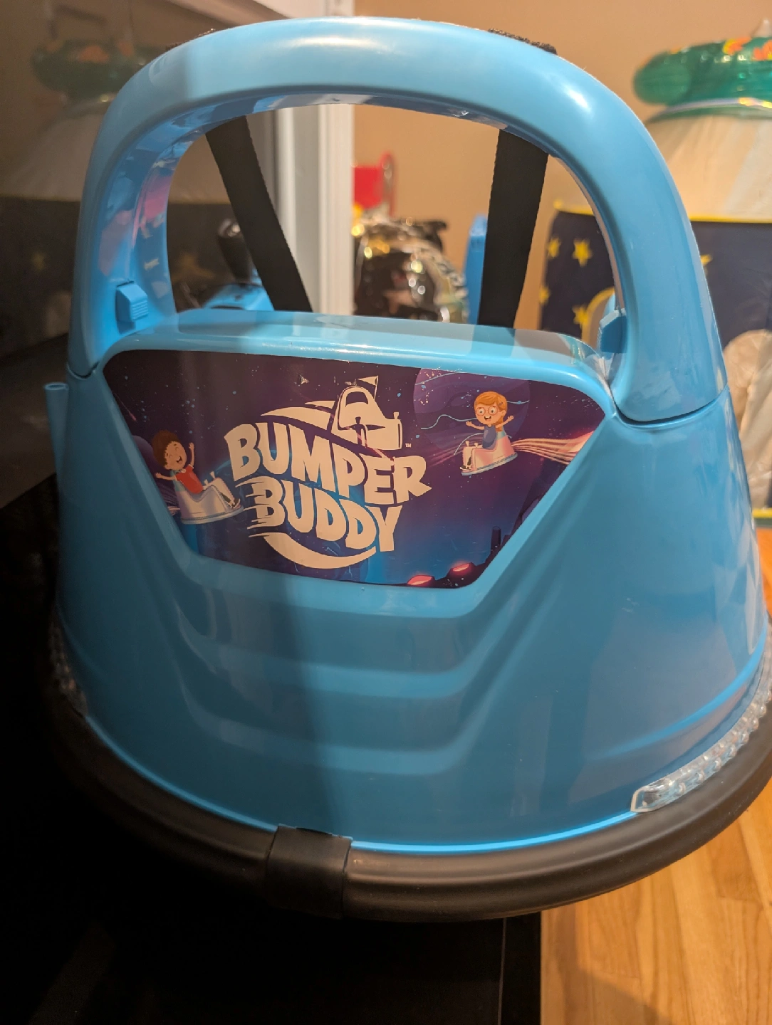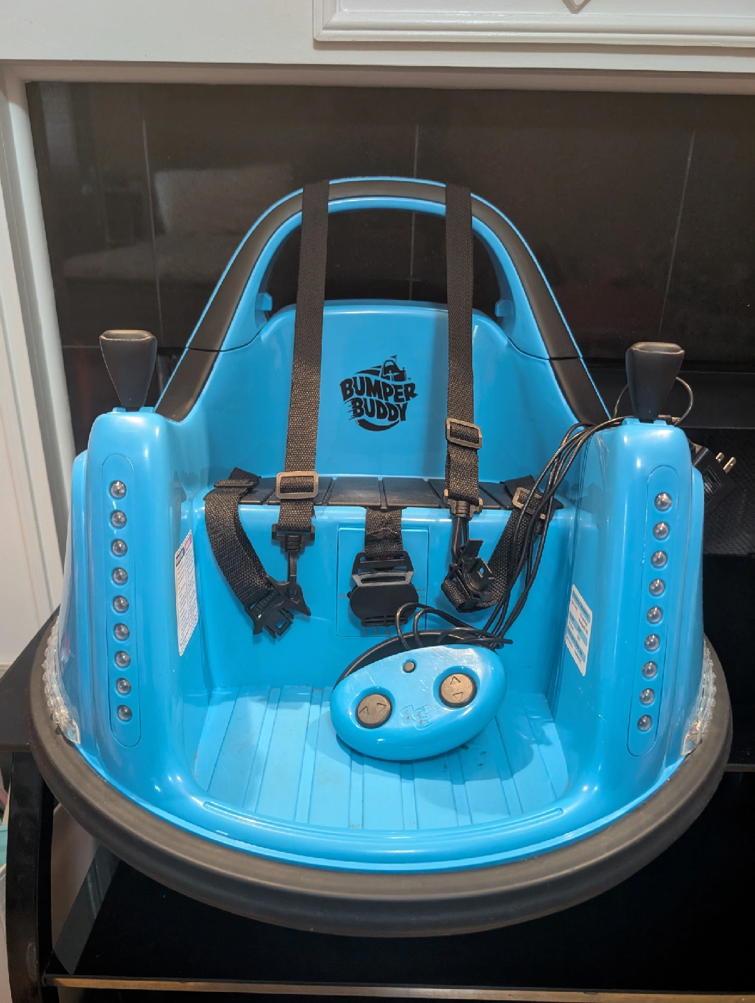 Selling a gently used Bumper Buddy bumper car for kids! It's in great condition and provides lots of fun. Features include a safety harness, easy-to-use controls, and colorful LED lights around the base. Perfect for indoor or outdoor play! My son used this at 9 months and 2 years old.
