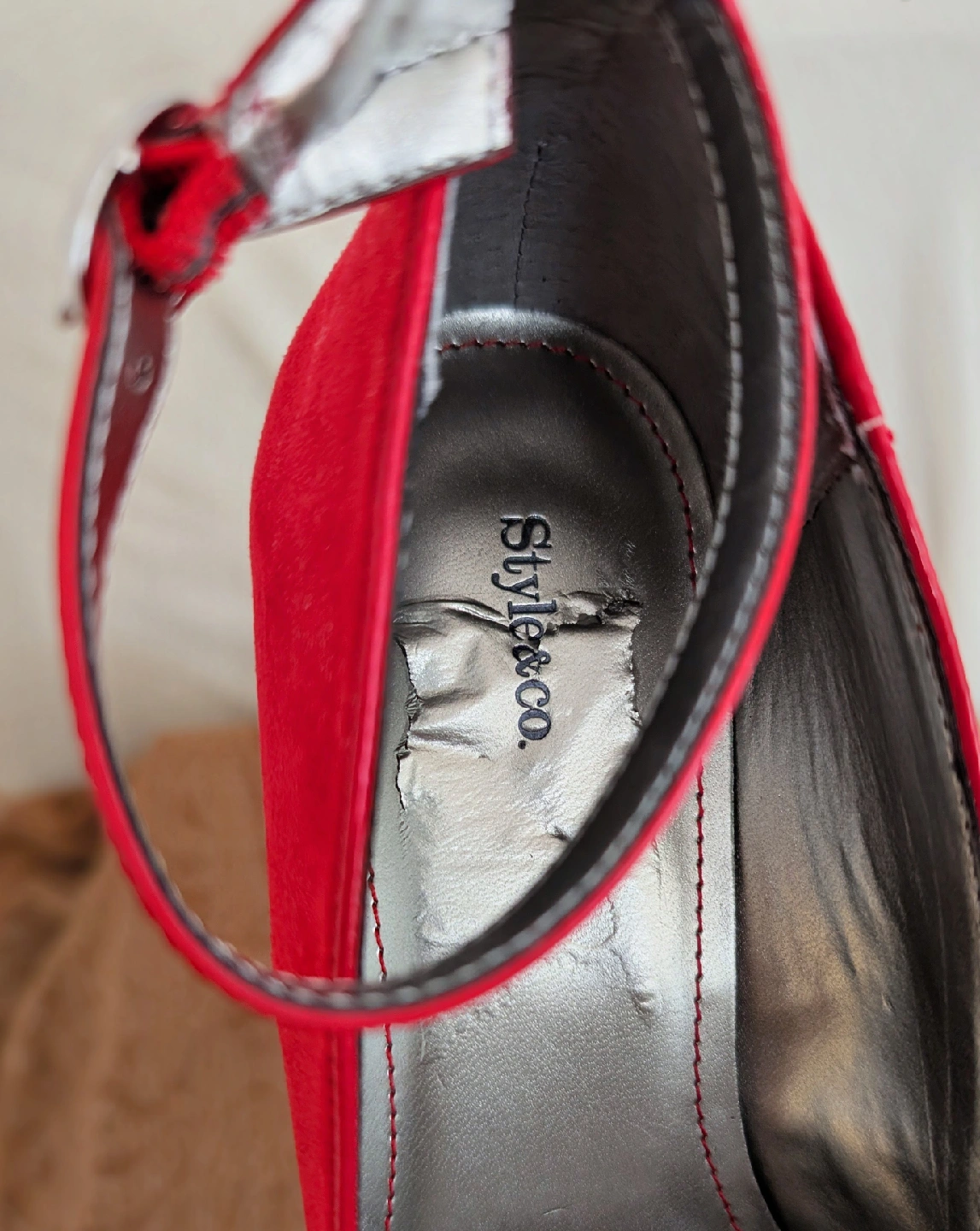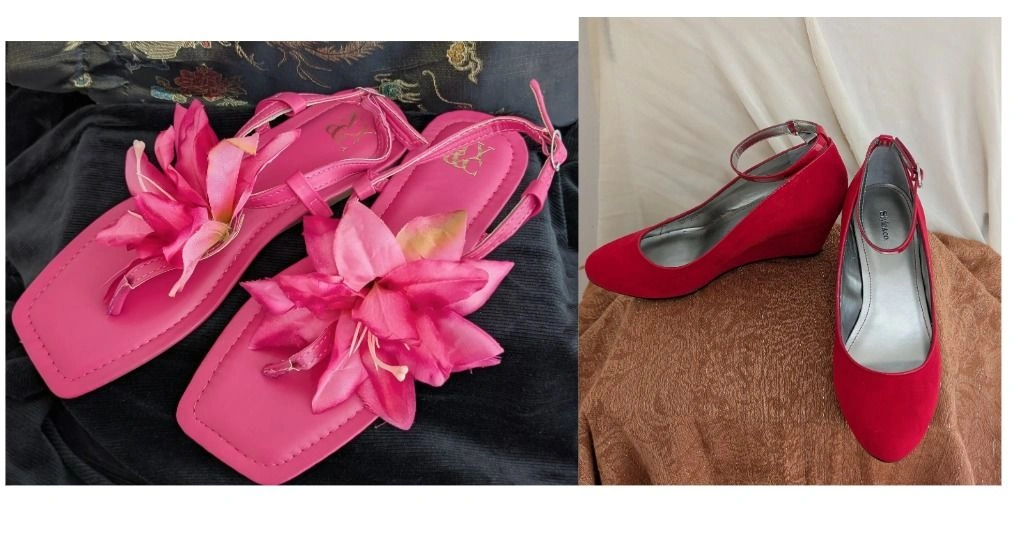 141A fun and stylish shoe bundle for various occasions! Both pairs are by the popular brand Style & Co. (Macy's brand). 1. Bright Red Ankle-Strap Wedge Heels Color: Vibrant Red (Suede/Microfiber look) Style: Low wedge heel with an elegant ankle strap (buckle closure). Closed toe. Condition: Gently used. Great for dressing up or work wear. Note: The insole logo sticker shows some wear (see close-up photo). Size: 7M 2. Hot Pink Floral Thong Sandals Color: Hot Pink Style: Flat thong sandals with a large, beautiful pink fabric floral embellishment. Condition: Excellent pre-owned condition. Perfect for summer, vacation, or adding a pop of color to any outfit. Size: 6.5 Why buy this bundle? Two pairs for one low price! Stylish and comfortable shoes from a trusted brand. Ready to wear for your next event or casual outing! Smoke-free home. Selling as a bundle only. Cash preferred, local pickup only.