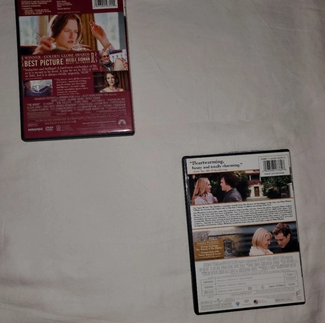 65Two Romance DVD Includes The Holiday Rated: PG-13 Genre: Romantic Comedy, Comedy, Romance, Comedy-Drama and The Hours Rated: PG-13 Genre: Romance, Drama Good Condition No Scratches