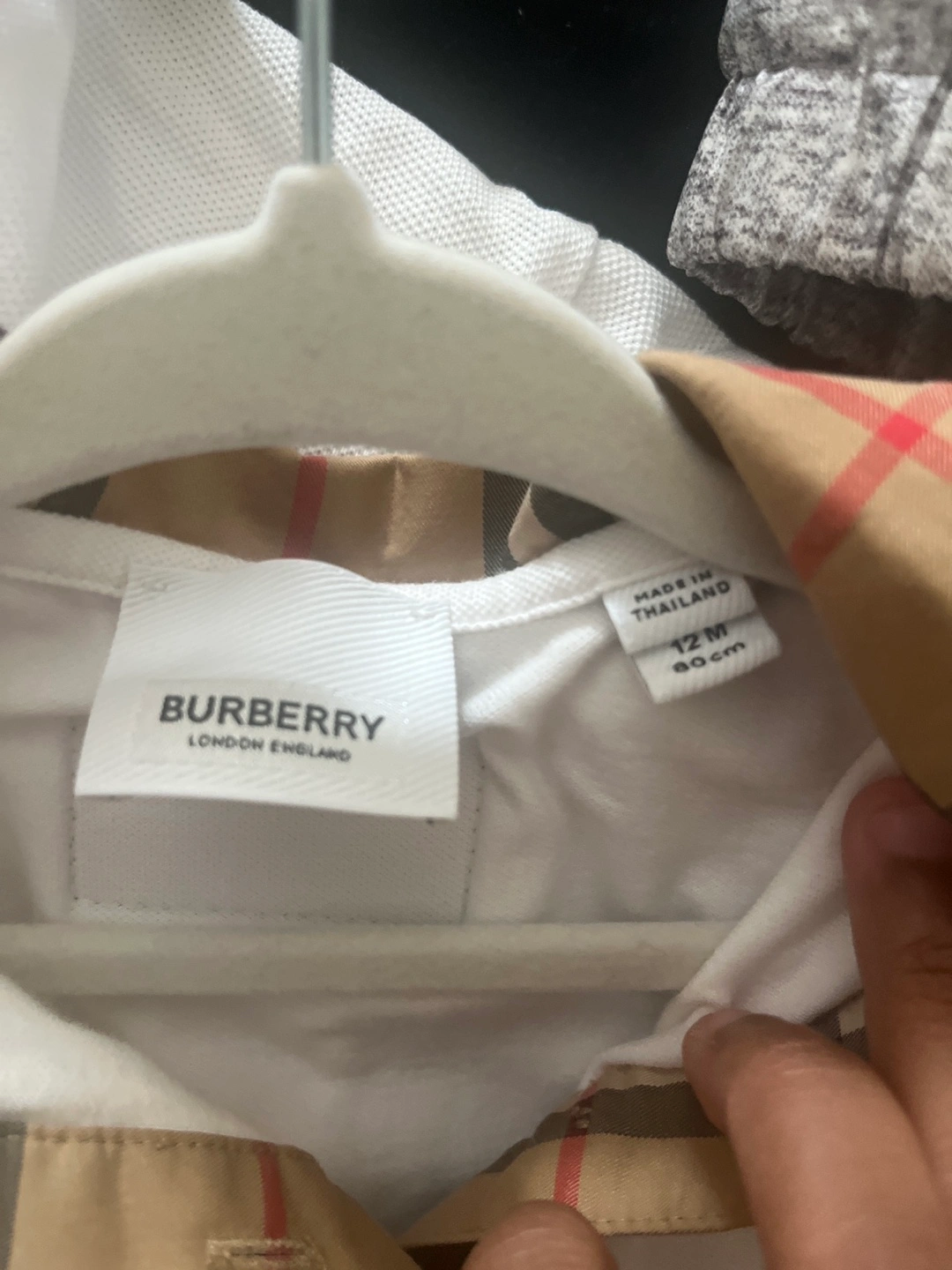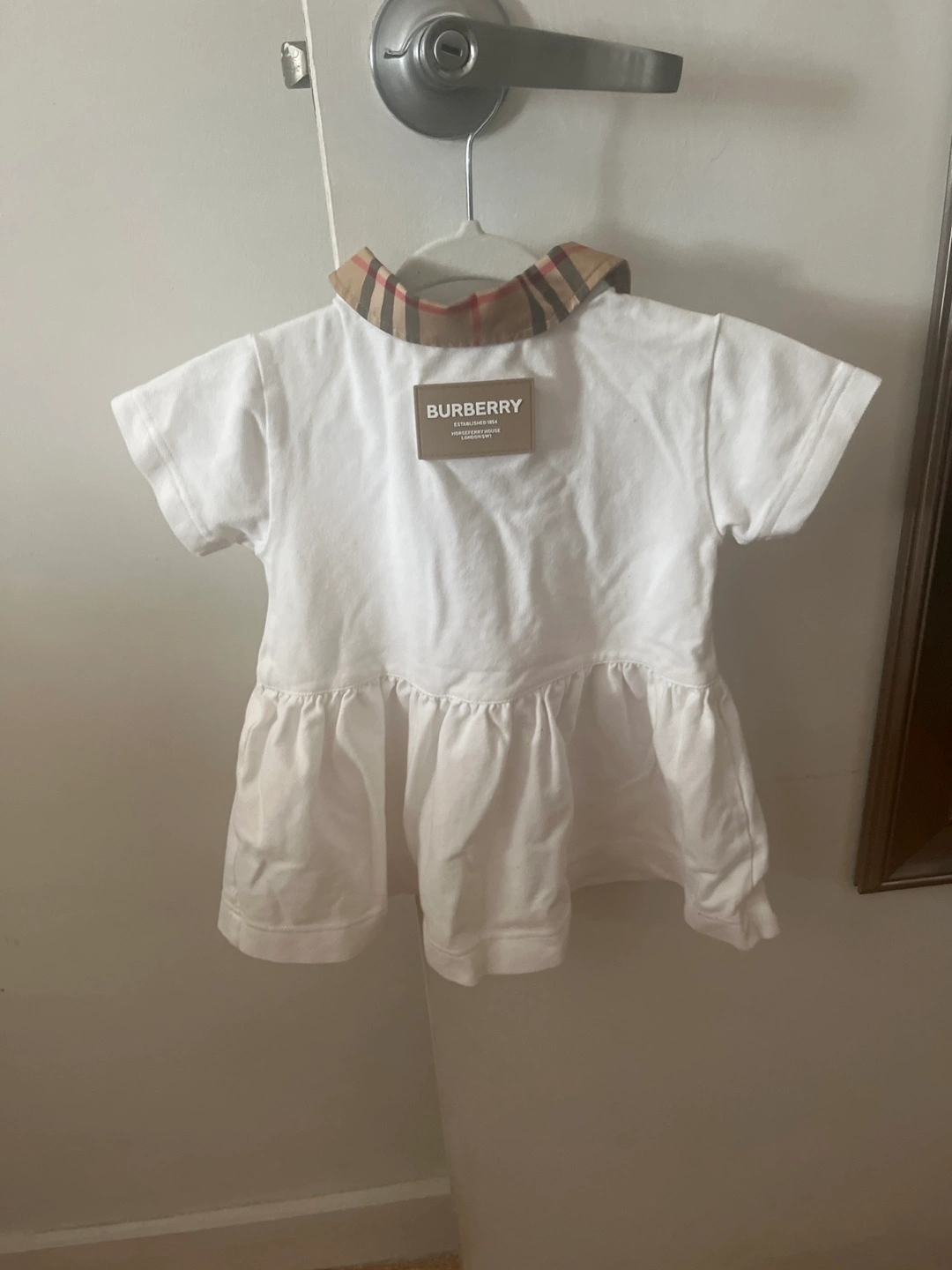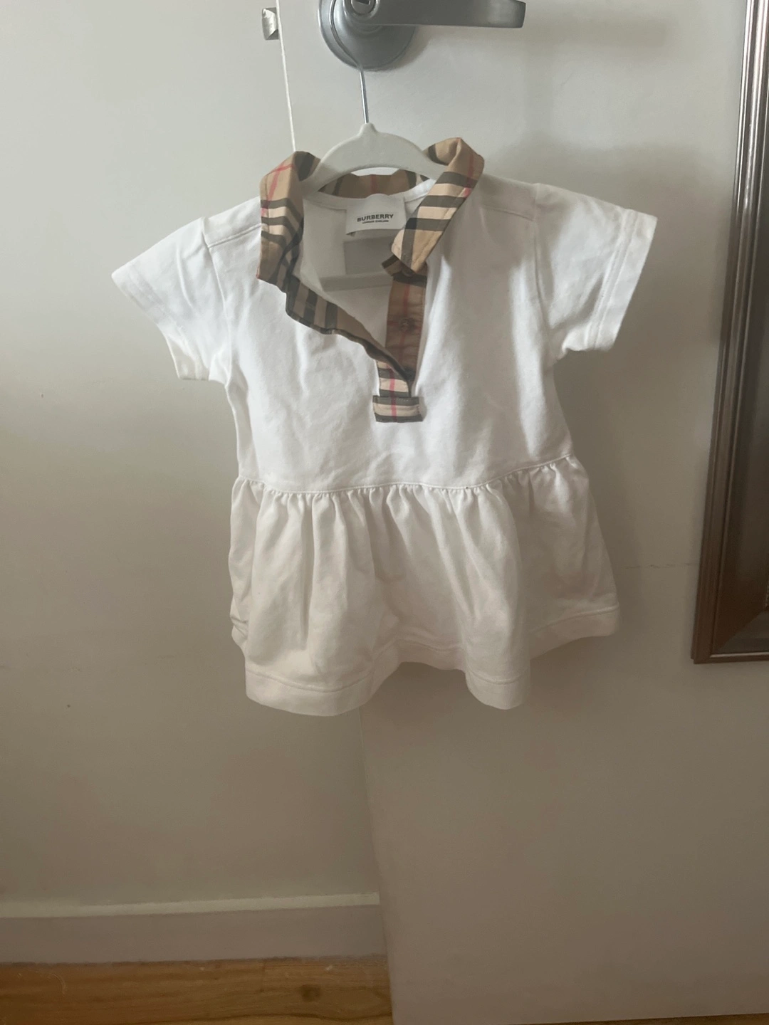 Cute Burberry baby dress in size 12M. It’s white with the classic Burberry plaid trim. Perfect for your little one!