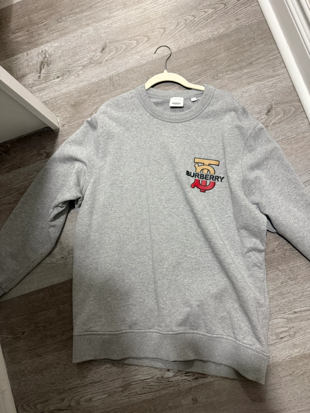 Selling a gray Burberry sweatshirt. It features the Burberry logo on the front. The sweatshirt is in great condition and ready for a new home!