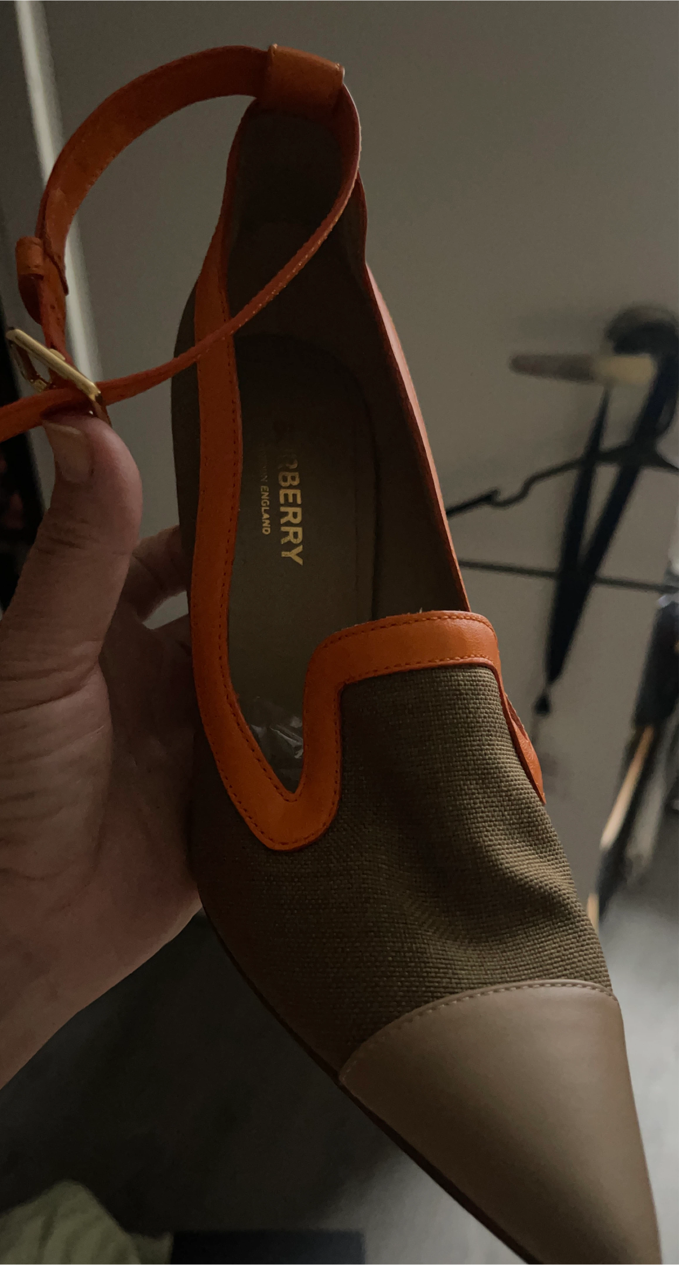 10These heels feature a unique orange trim that really makes them stand out! They are Burberry and in good condition. Perfect for adding a pop of color to your outfit!