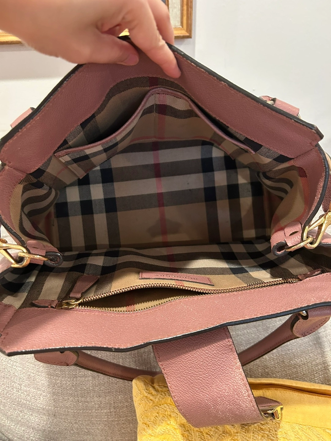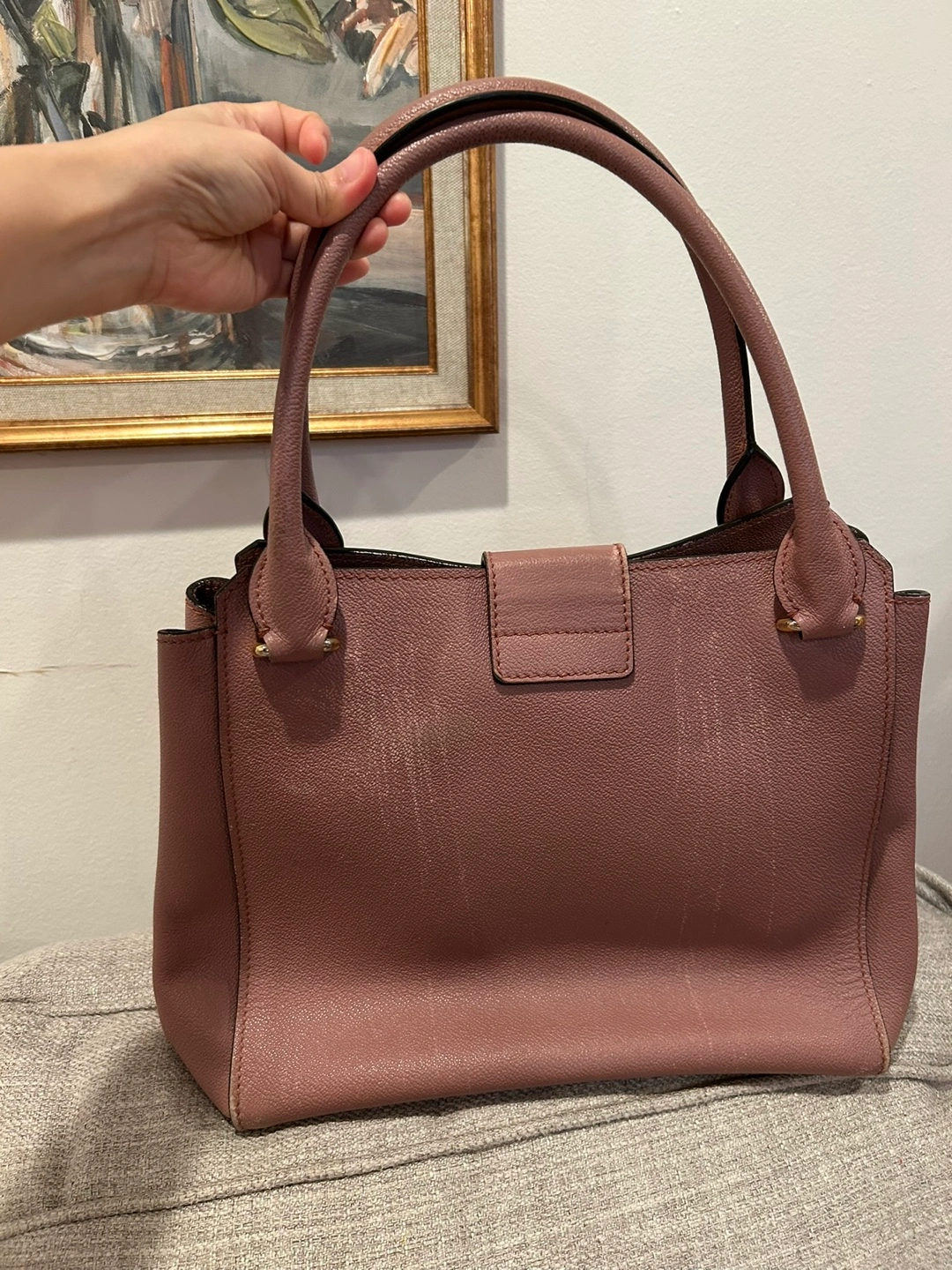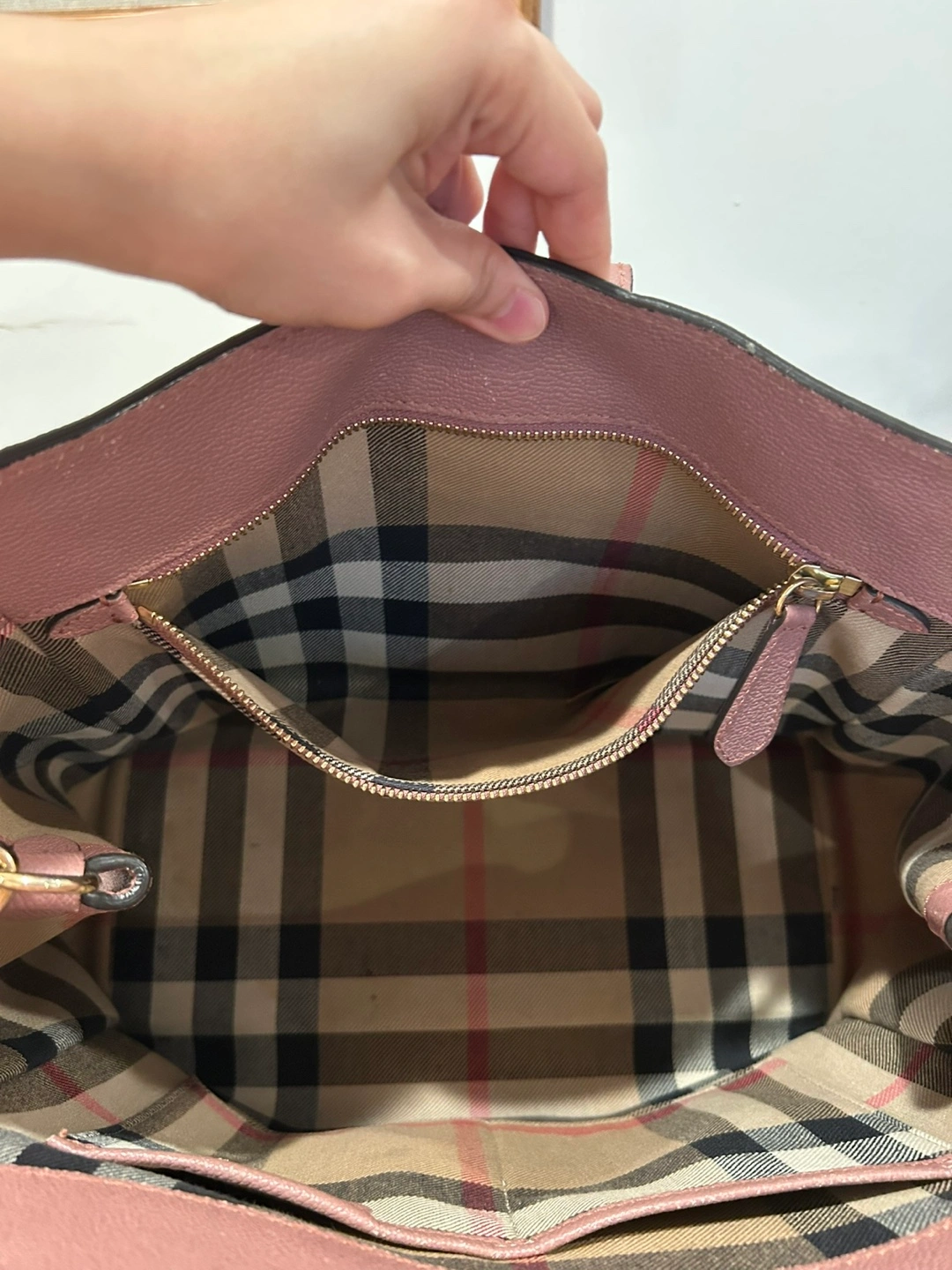 Selling a Burberry tote bag in a lovely pink leather. It has a buckle detail on the front and the classic Burberry plaid lining. There are some signs of wear, but it's still a stylish and functional bag! Comes with a third party Certificate of Authenticity.