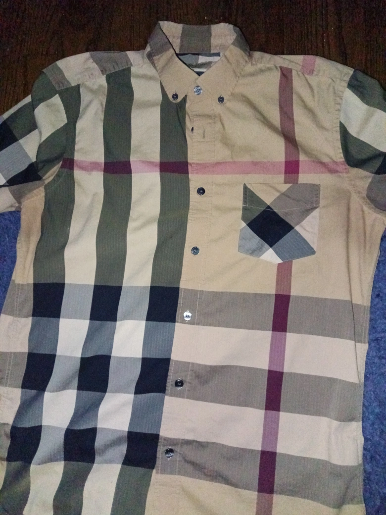 10Here's a stylish Burberry button-down shirt with a classic plaid pattern. It's in great condition and ready for a new home! The material feels high quality and the design is timeless.