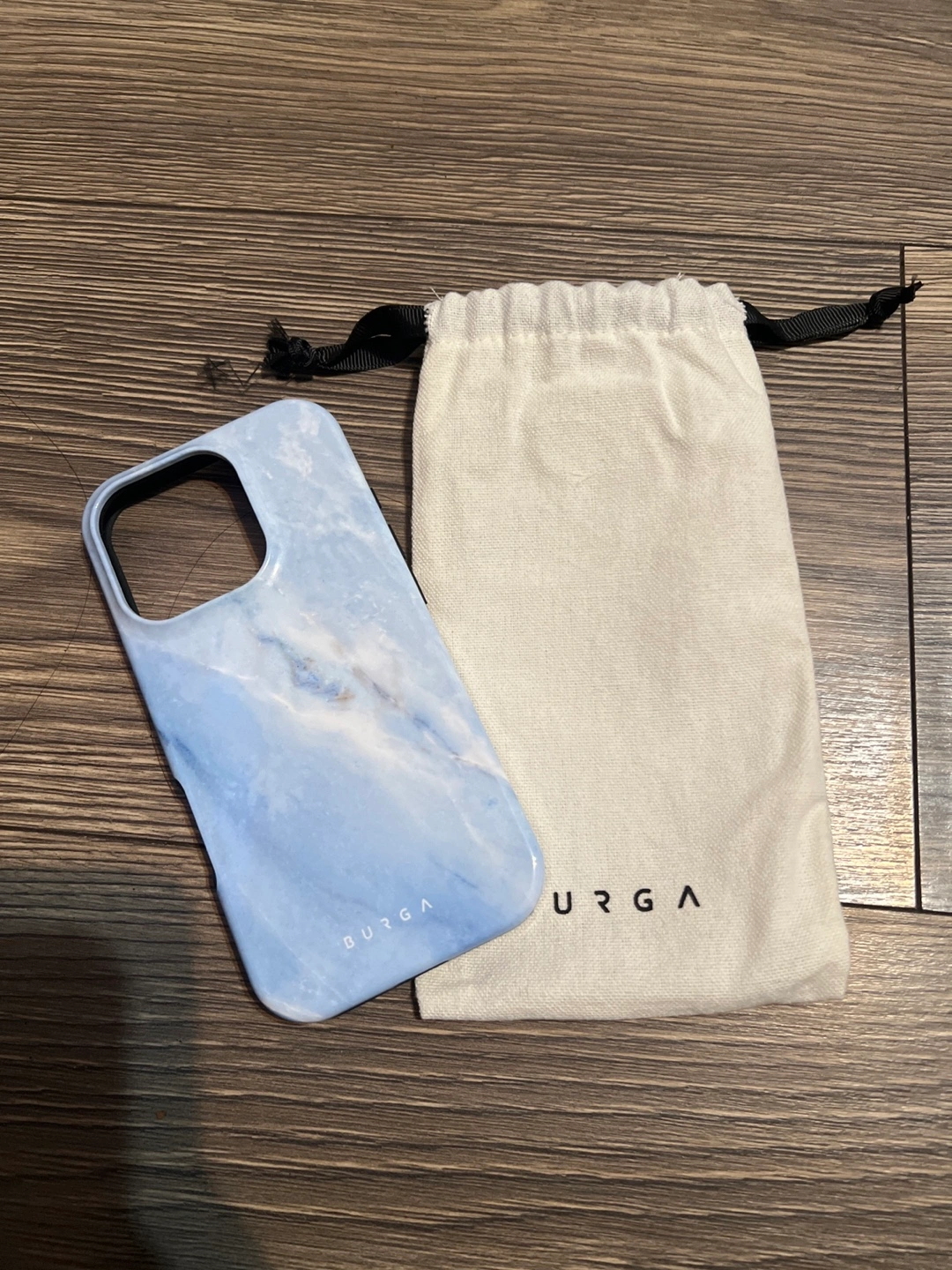 Selling a BURGA iPhone 16 pro case with a light blue marble design. It comes with the original pouch.
