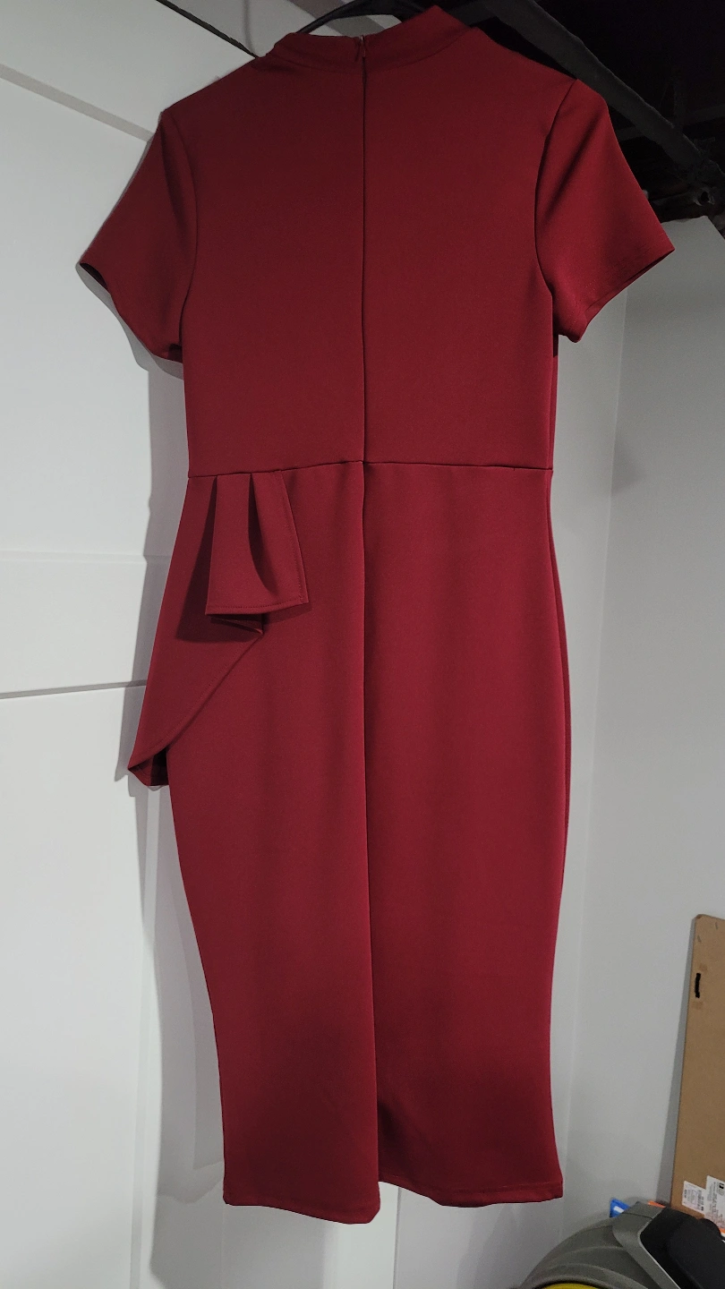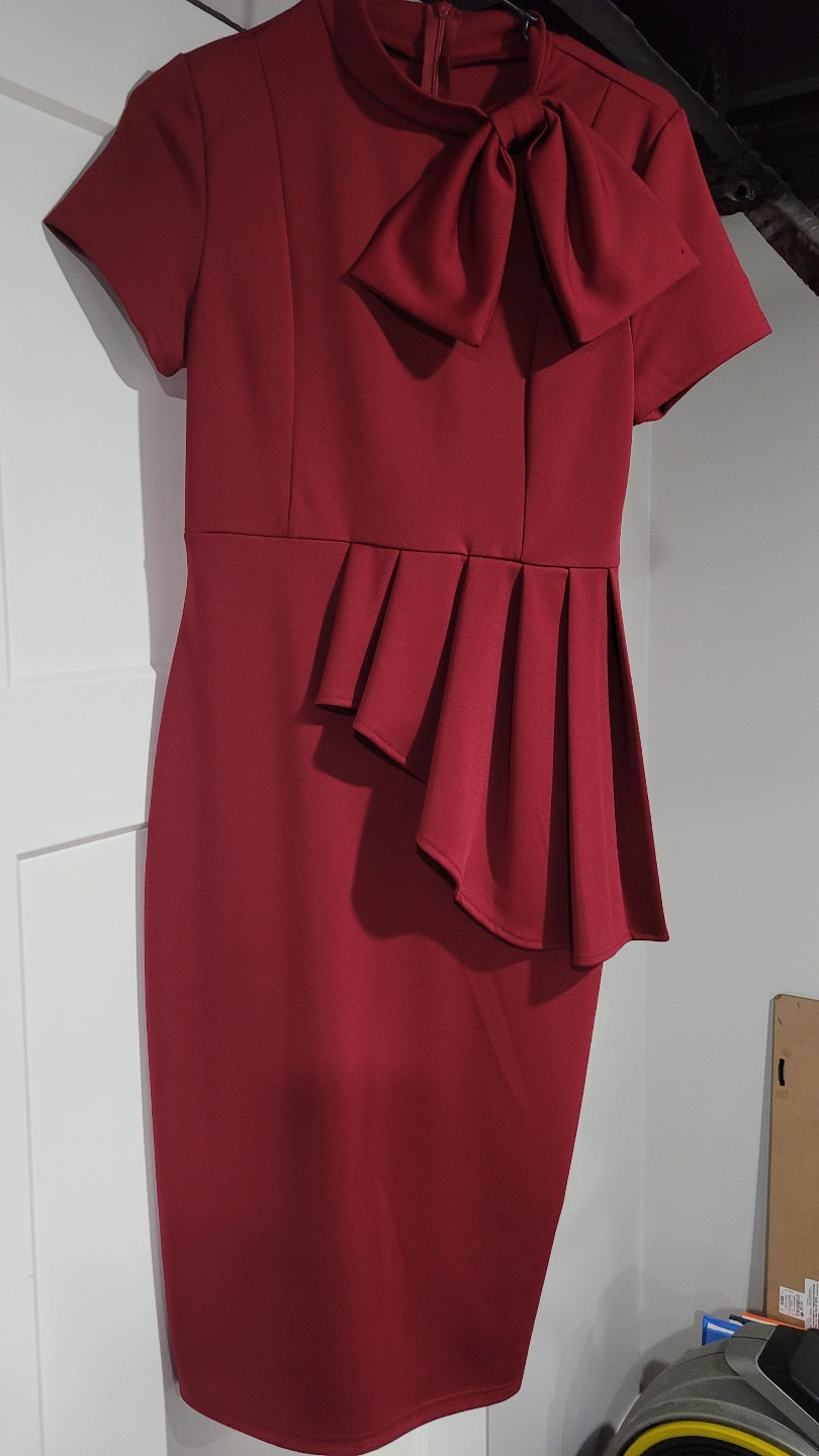 Never worn- Stunning burgundy dress. Features a large bow at the neckline and a pleated peplum detail at the waist. Short sleeves. Midi length. Perfect for a special occasion.