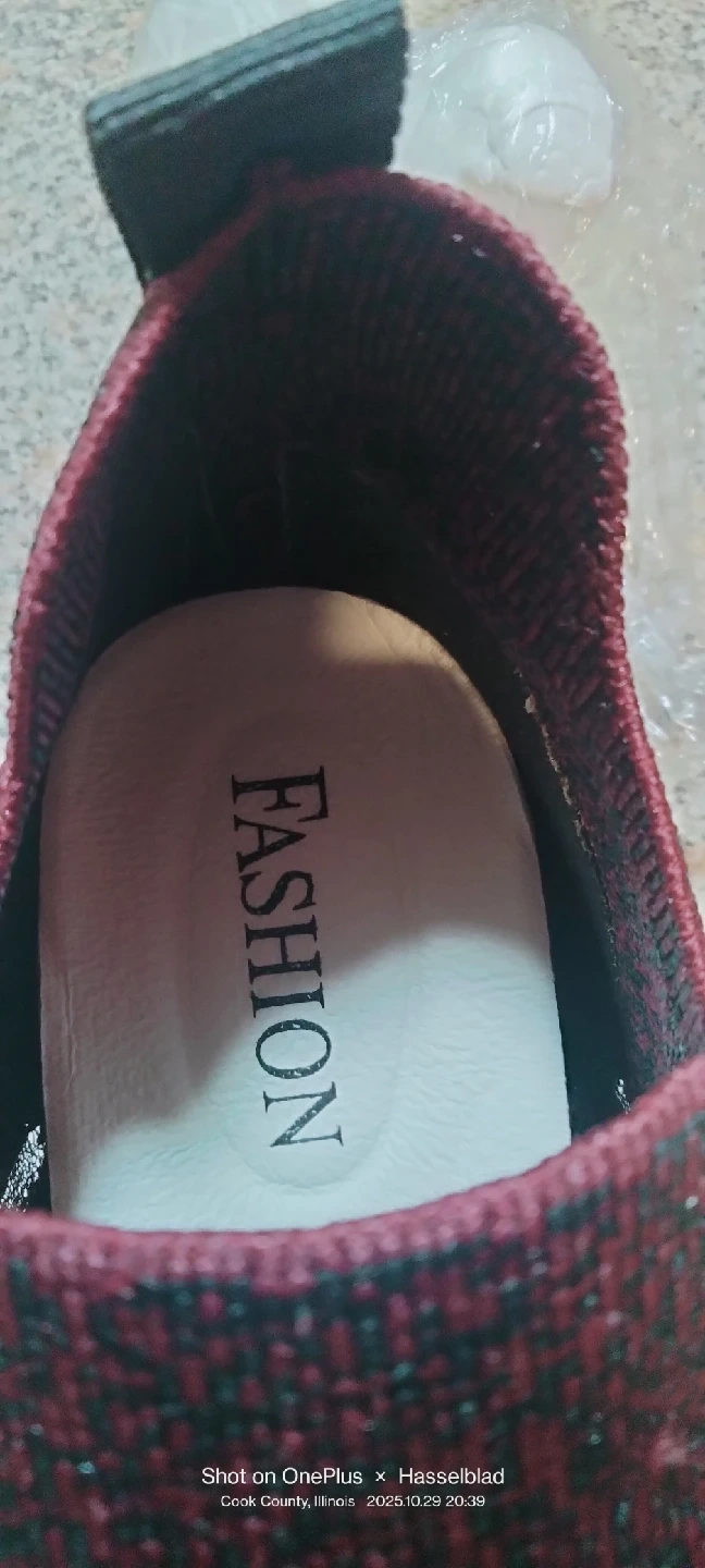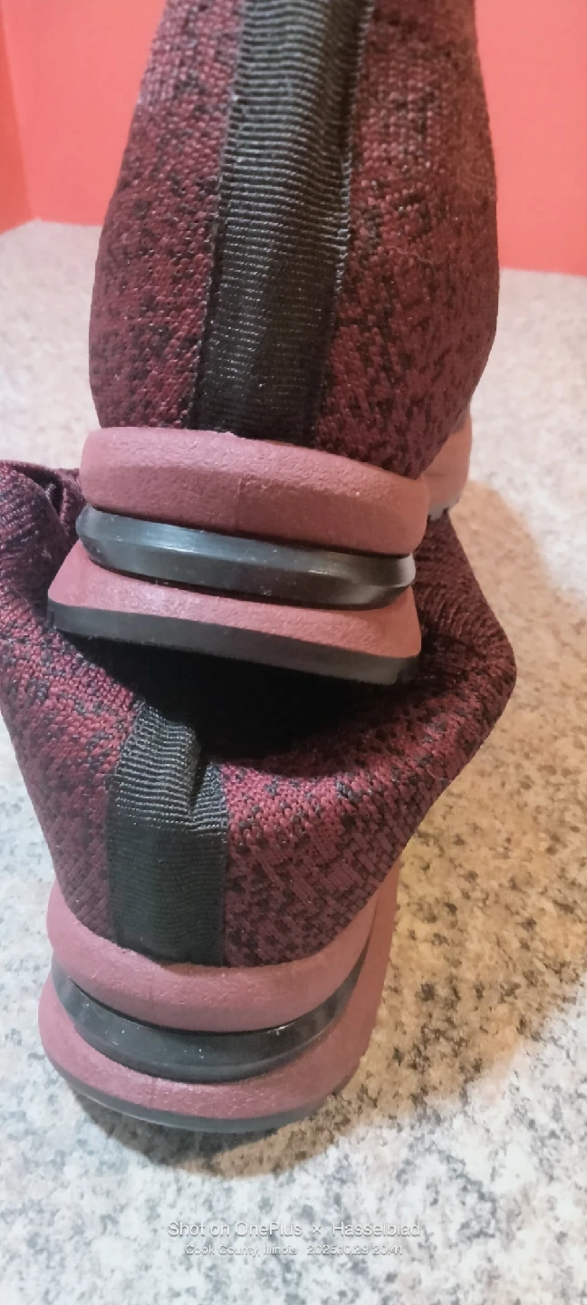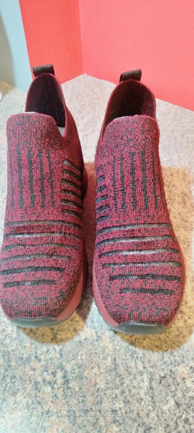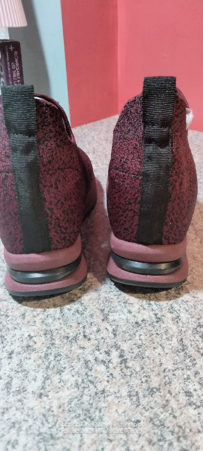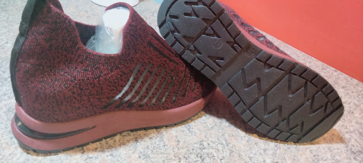 In color burgundy knitted slip-on platform walking heightening shoes . Makes you almost 3" toller.They are a size 38. US 7.5-8, 10 inches long. New without tag or box .