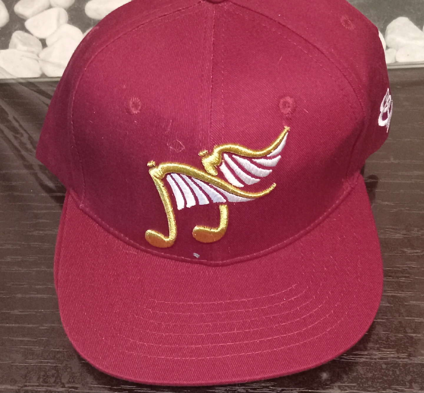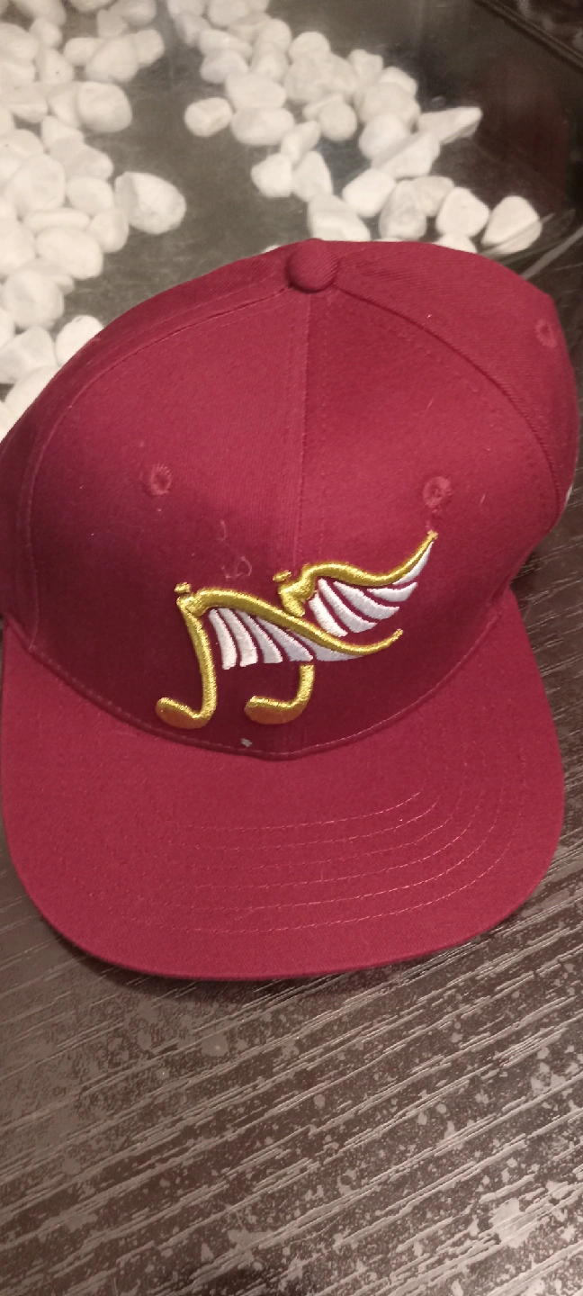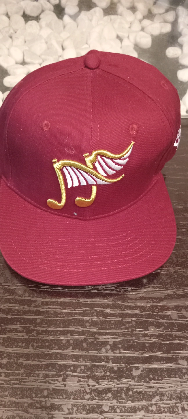 28Burgundy fitted cap featuring a unique winged logo design. This stylish cap is in great condition and ready for a new owner! The logo is gold and white.