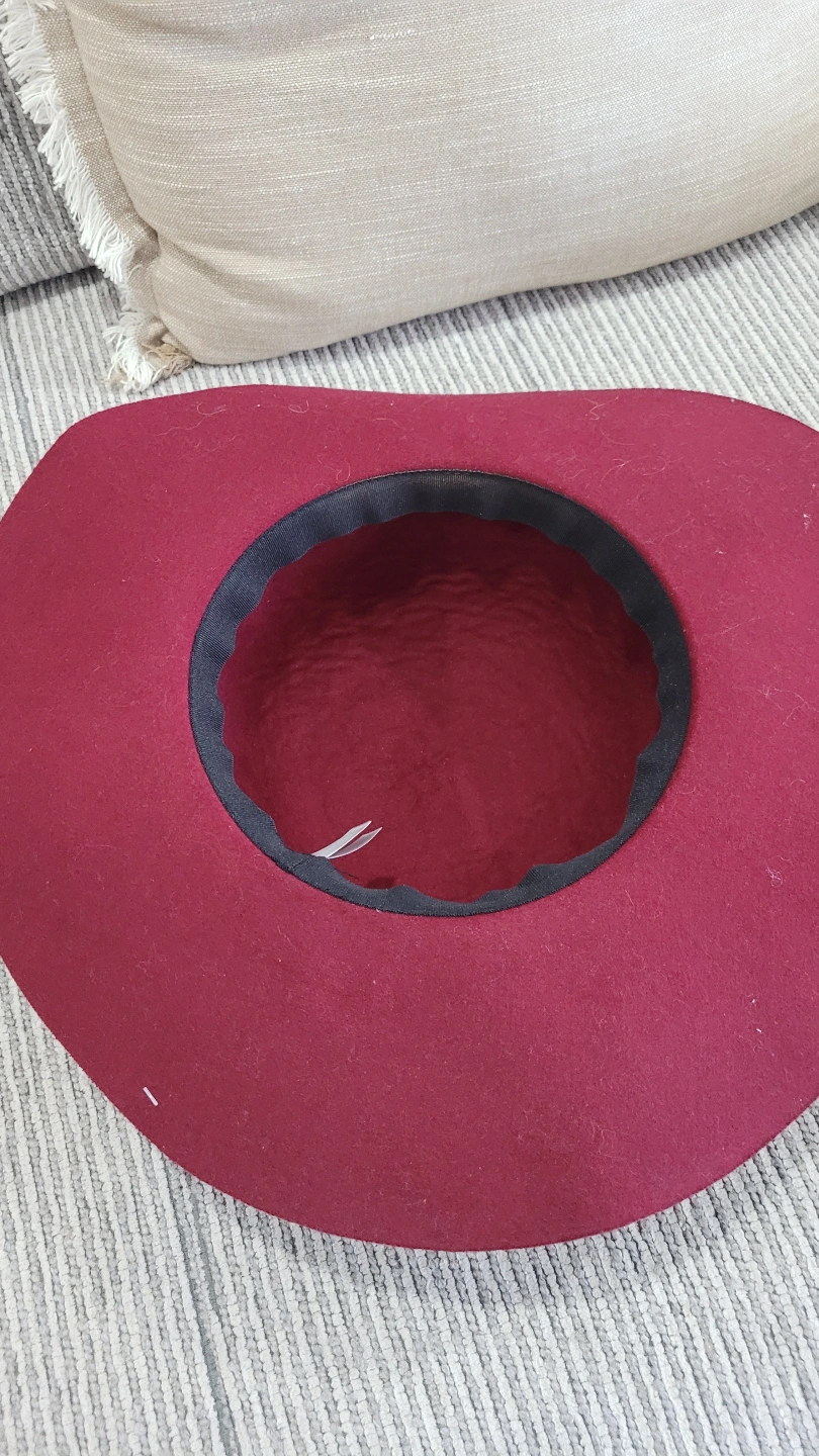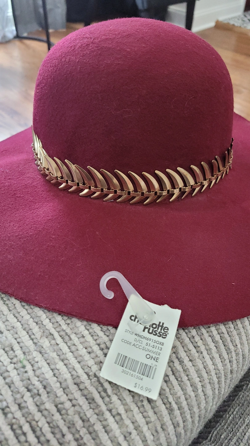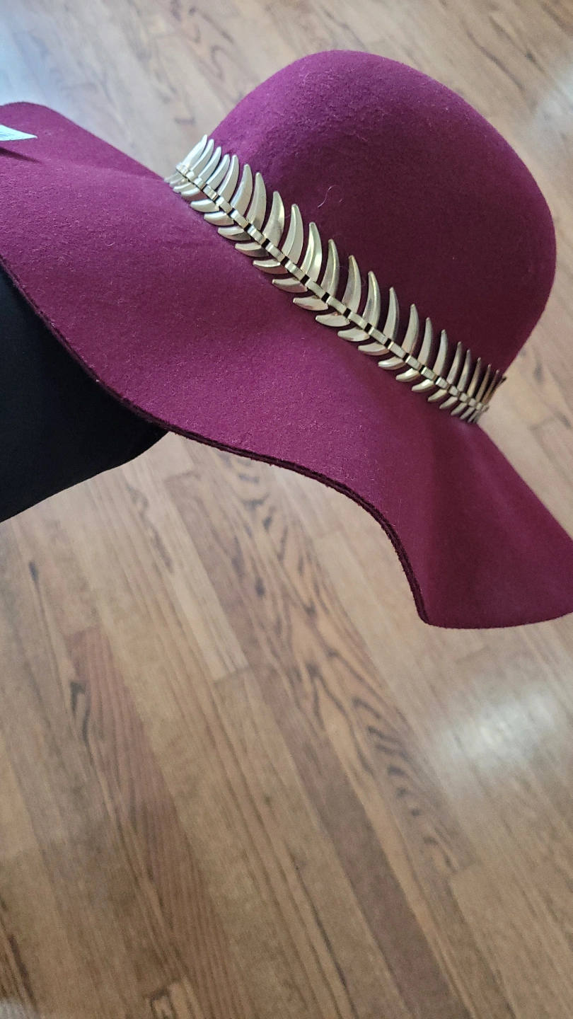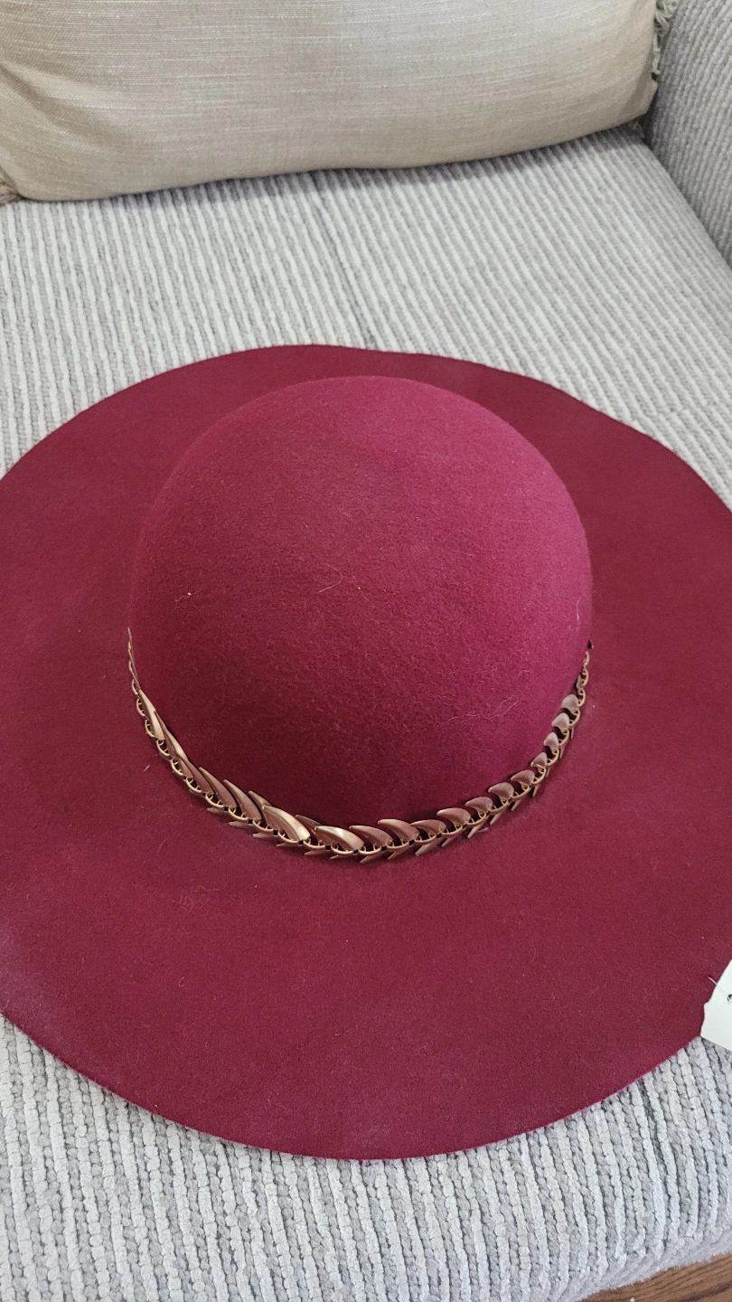 Women's burgundy felt floppy hat. Features a gold chain accent around the crown. New with tags.