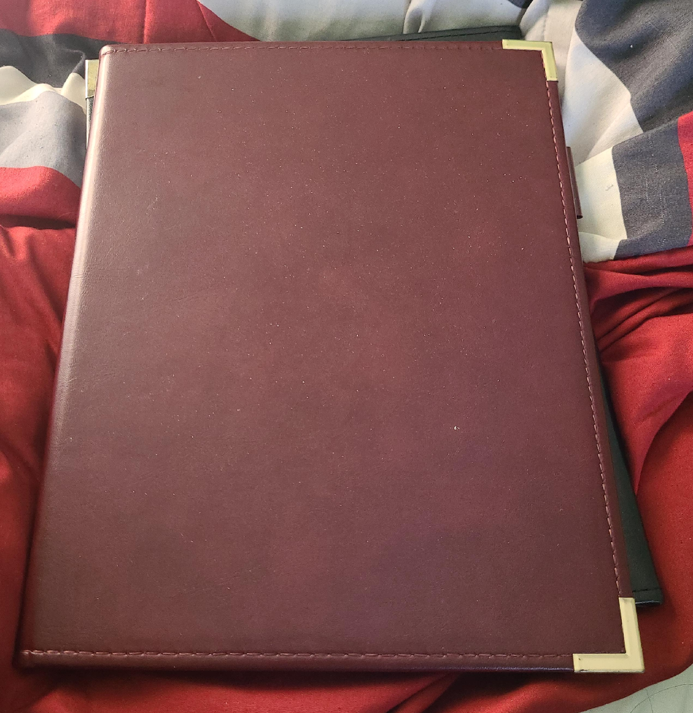 Burgundy leather binder with gold corner accents. It's in great condition and ready to keep your documents organized