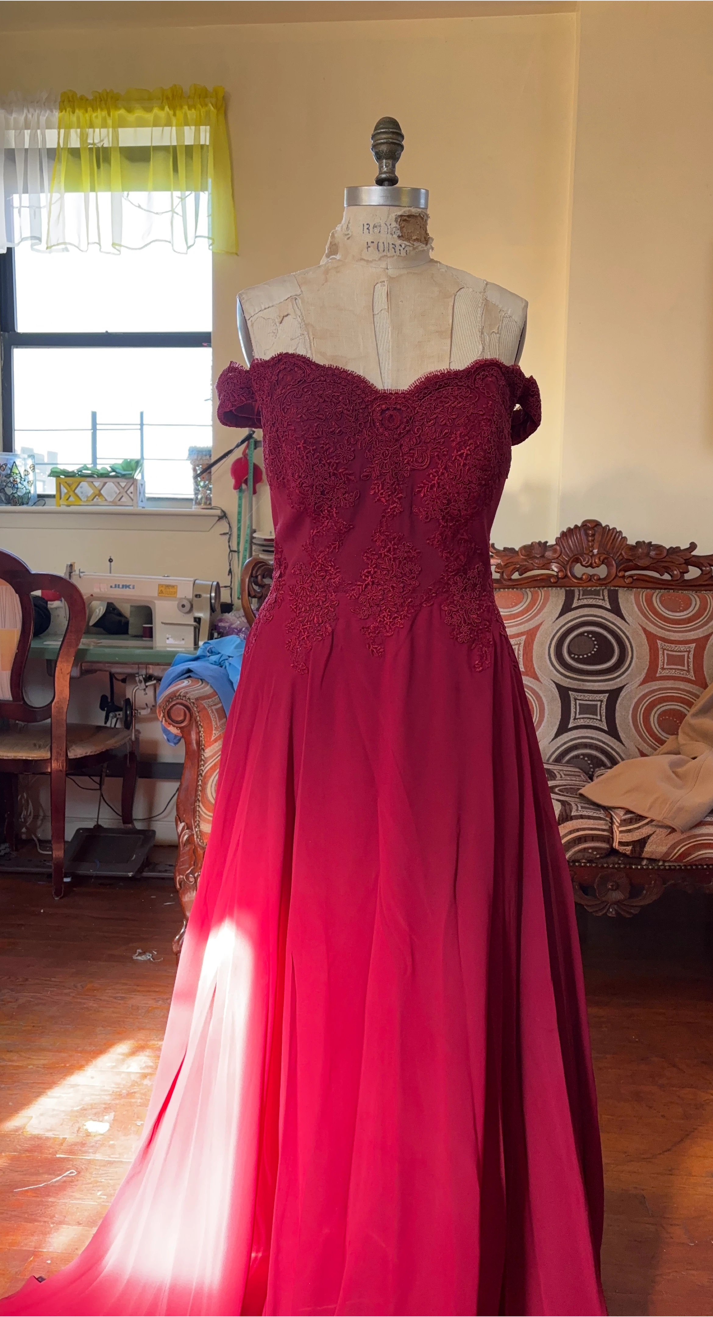 10Beautiful burgundy off-shoulder formal dress. It features delicate lace detailing on the bodice and a flowing skirt. Perfect for a special occasion!