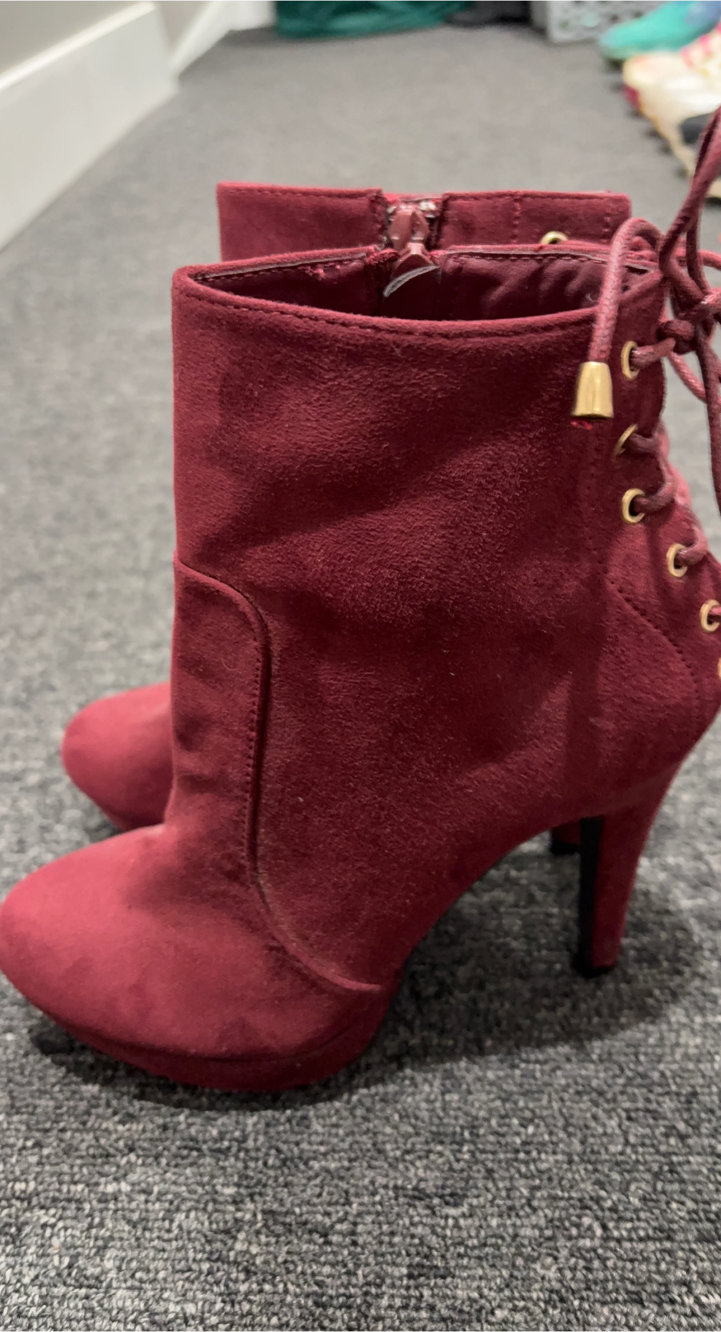 10These burgundy ankle boots are a stylish addition to any wardrobe! They feature a soft suede texture and a lace-up back detail. Perfect for adding a pop of color to your outfit!