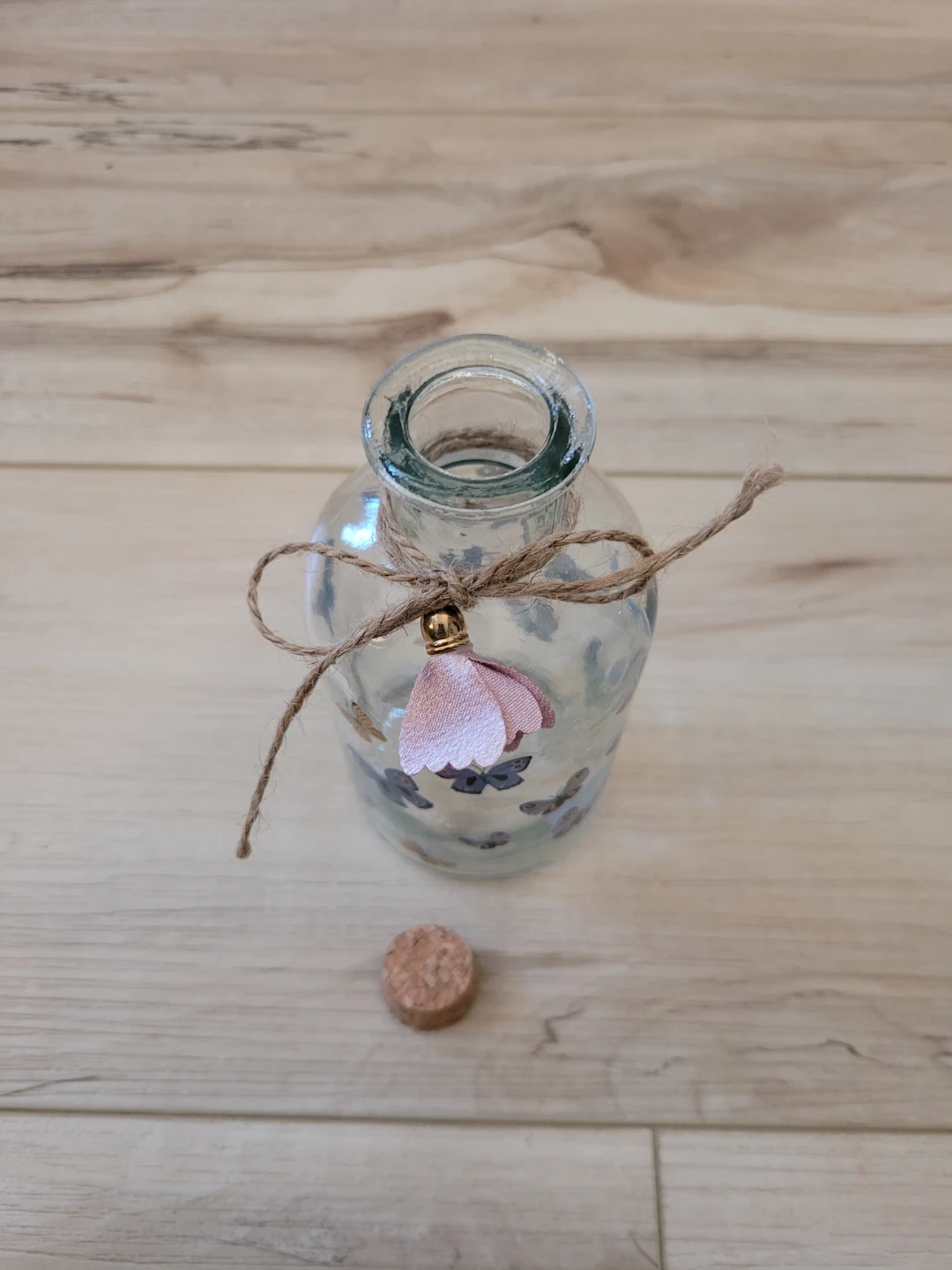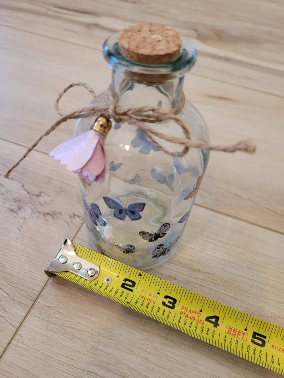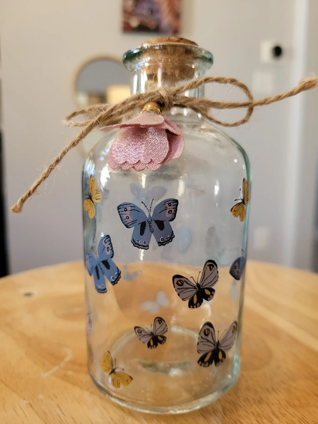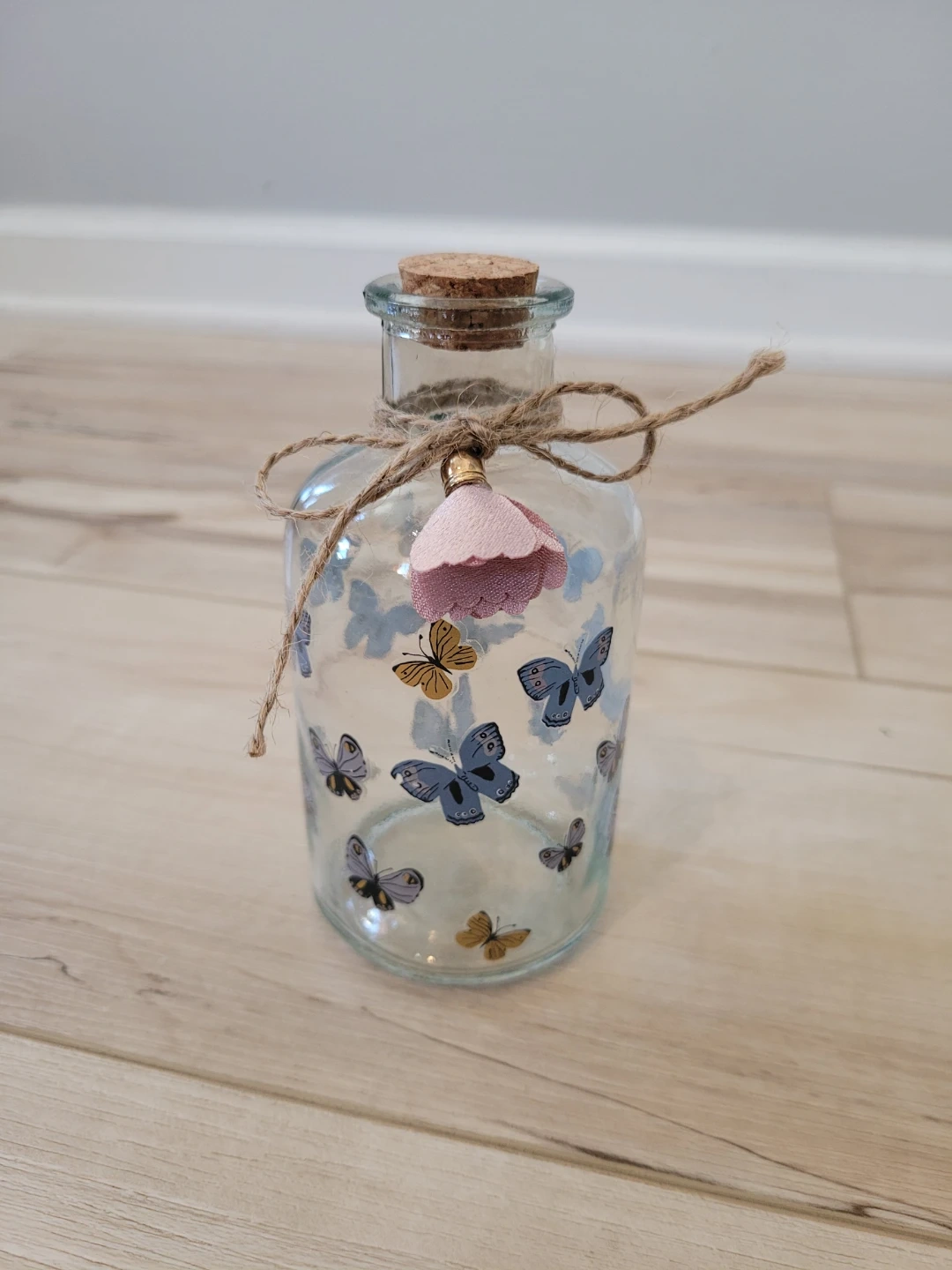 85Here's a cute glass bottle decorated with butterfly decals! It has a cork top and a twine bow, perfect for adding a touch of whimsy to any room. Approximately 5 inches high. Feel free to check out my other unique items listed.