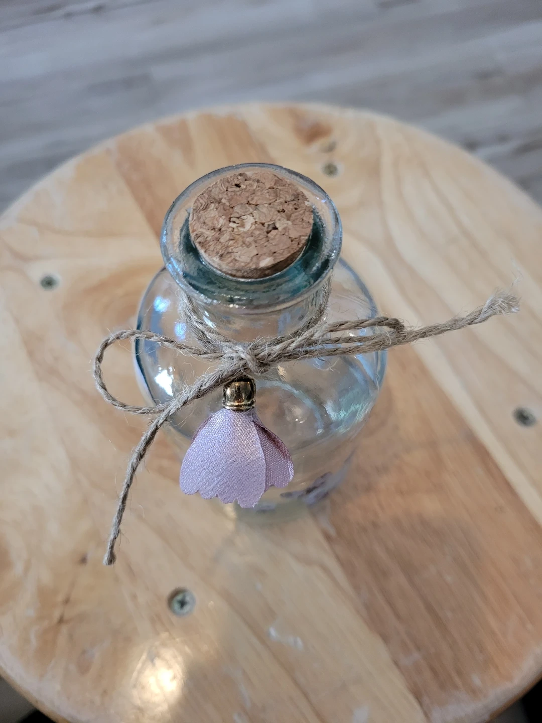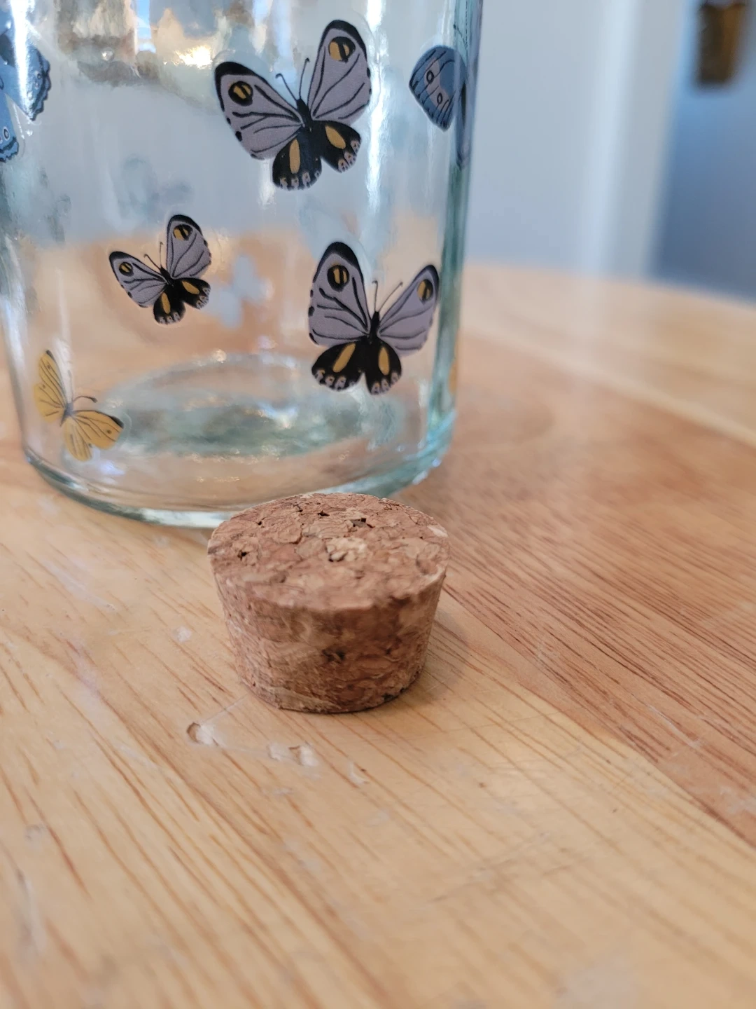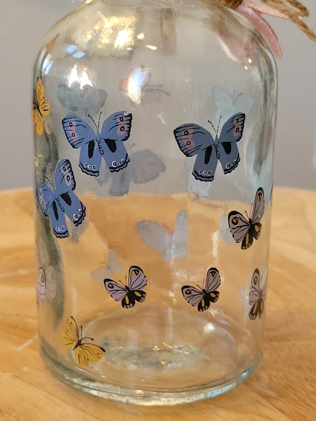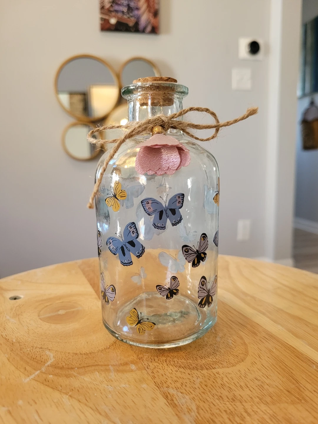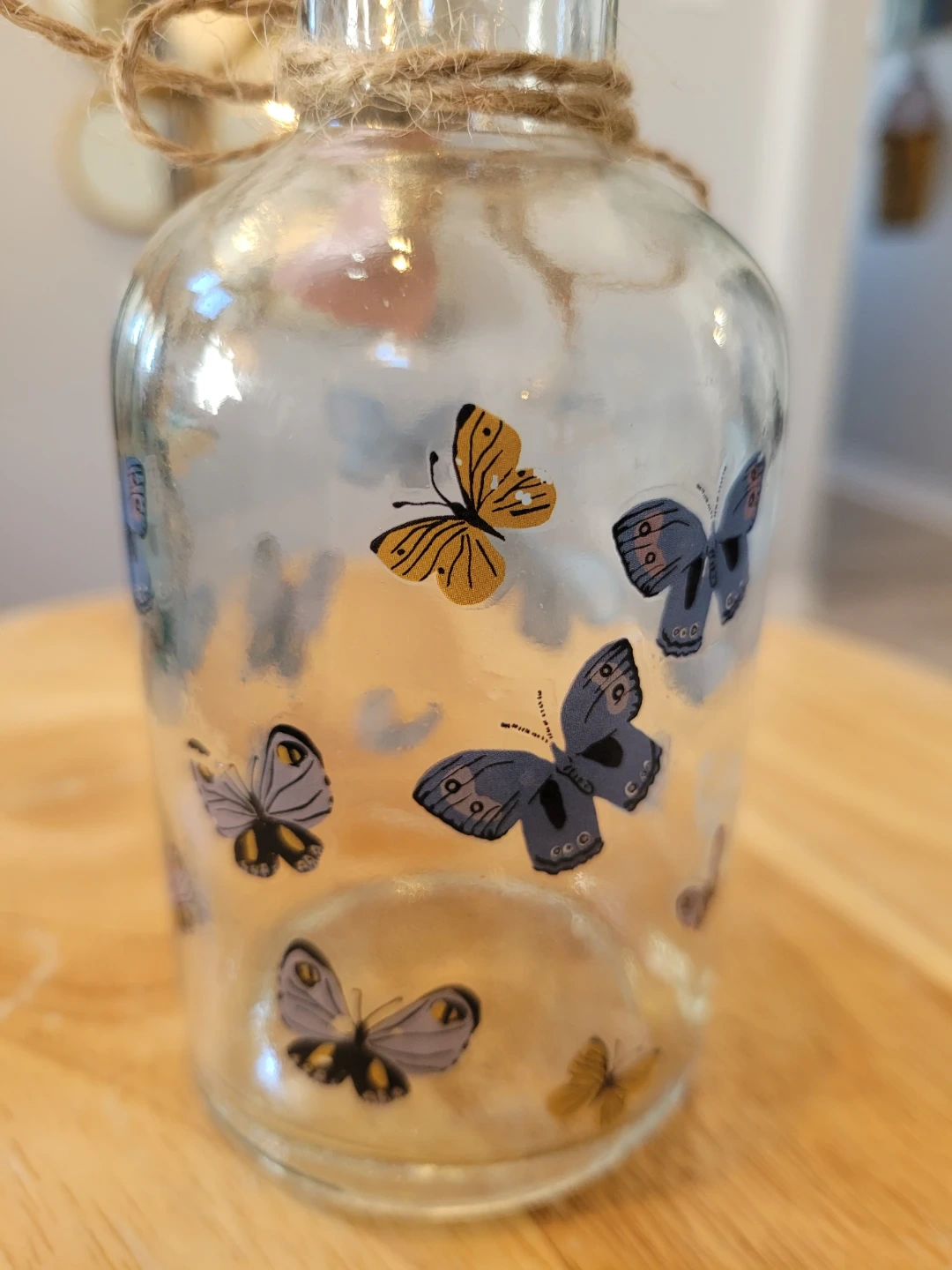 85Here's a cute glass bottle decorated with butterfly decals! It has a cork top and a twine bow, perfect for adding a touch of whimsy to any room. Approximately 5 inches high. Feel free to check out my other unique items listed.