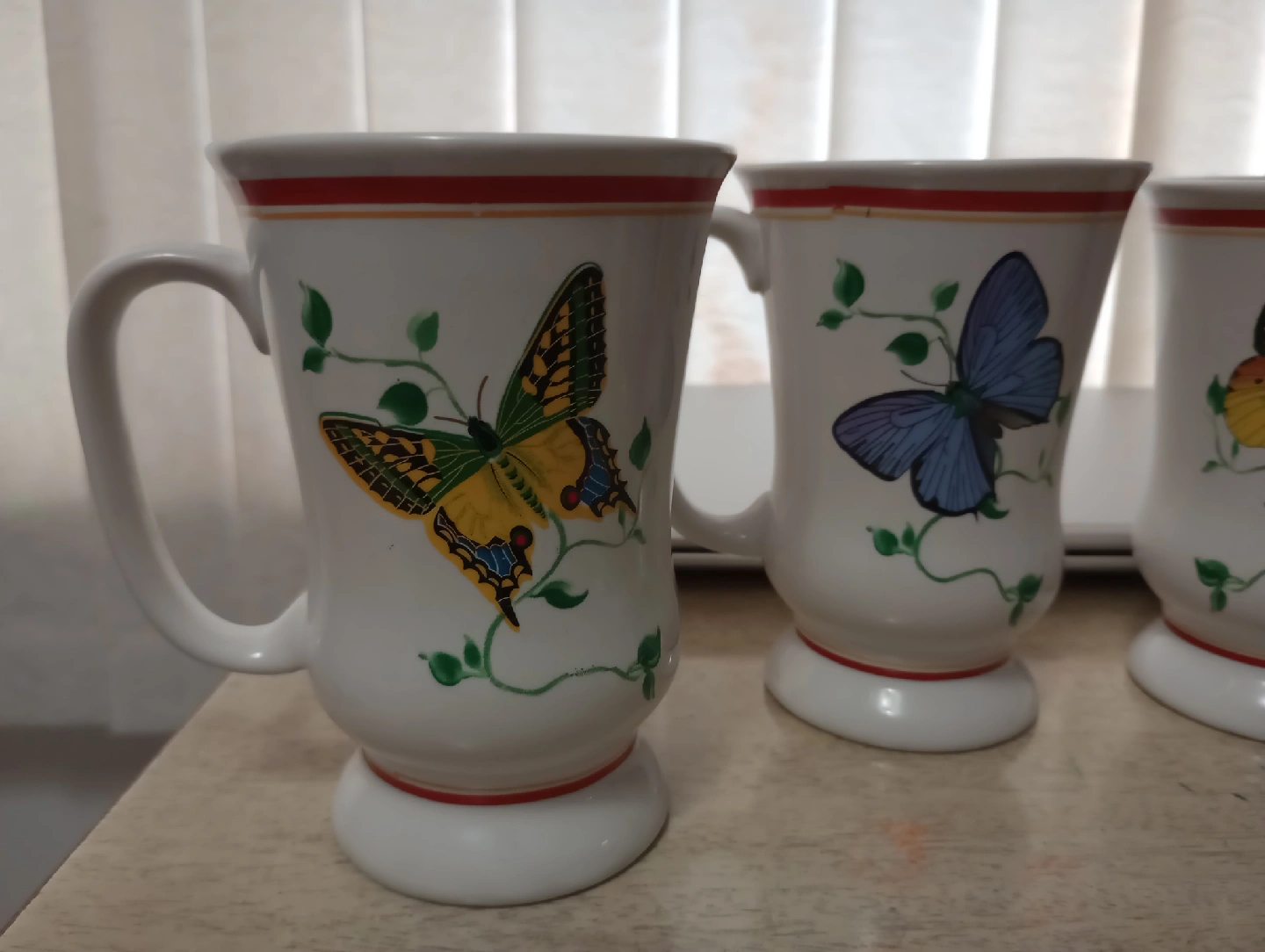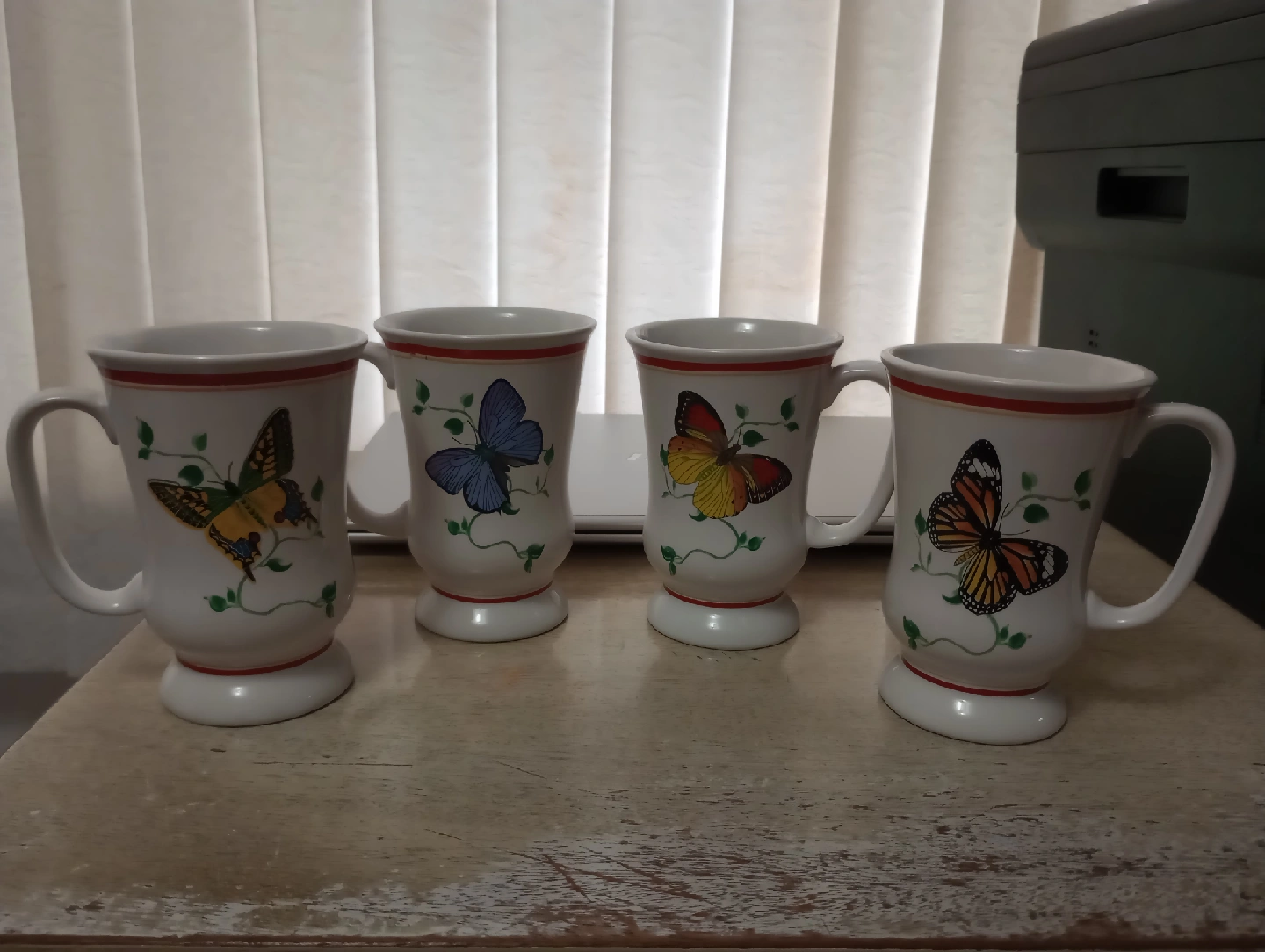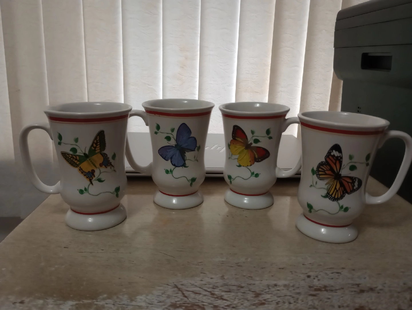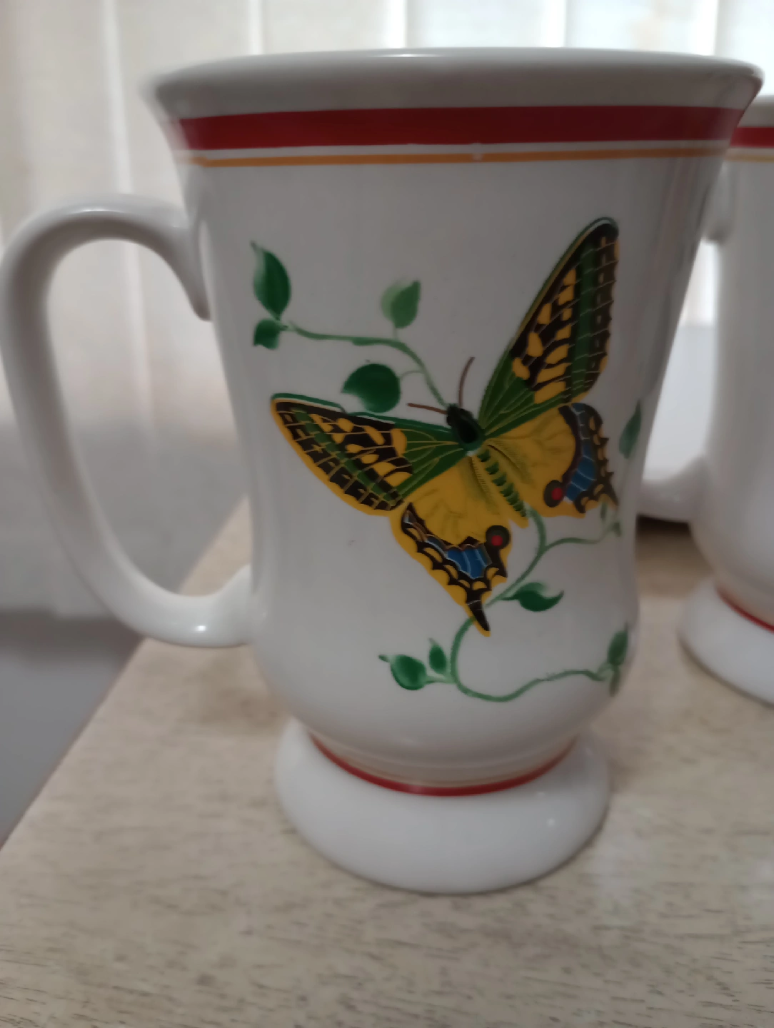 10Hi! Thank you for visiting my listings. Not quite ready for winter? Well, here's a set of four fabulous coffee mugs featuring beautiful butterfly designs to chase away the chill. Featuring a white base color with colorful butterfly patterns and a red and yellow stripe near the top, these hard-to-find mugs are the perfect way to add a touch of nature to your morning coffee or tea with friends! BTW, I have been a 100% Top-rated seller on eBay (my avatar/name on that platform is felicitasmaximus) for many years. So, although this is my first venture on Karrot, you can certainly buy with confidence. Thanks for looking. Best wishes from West Elsdon...