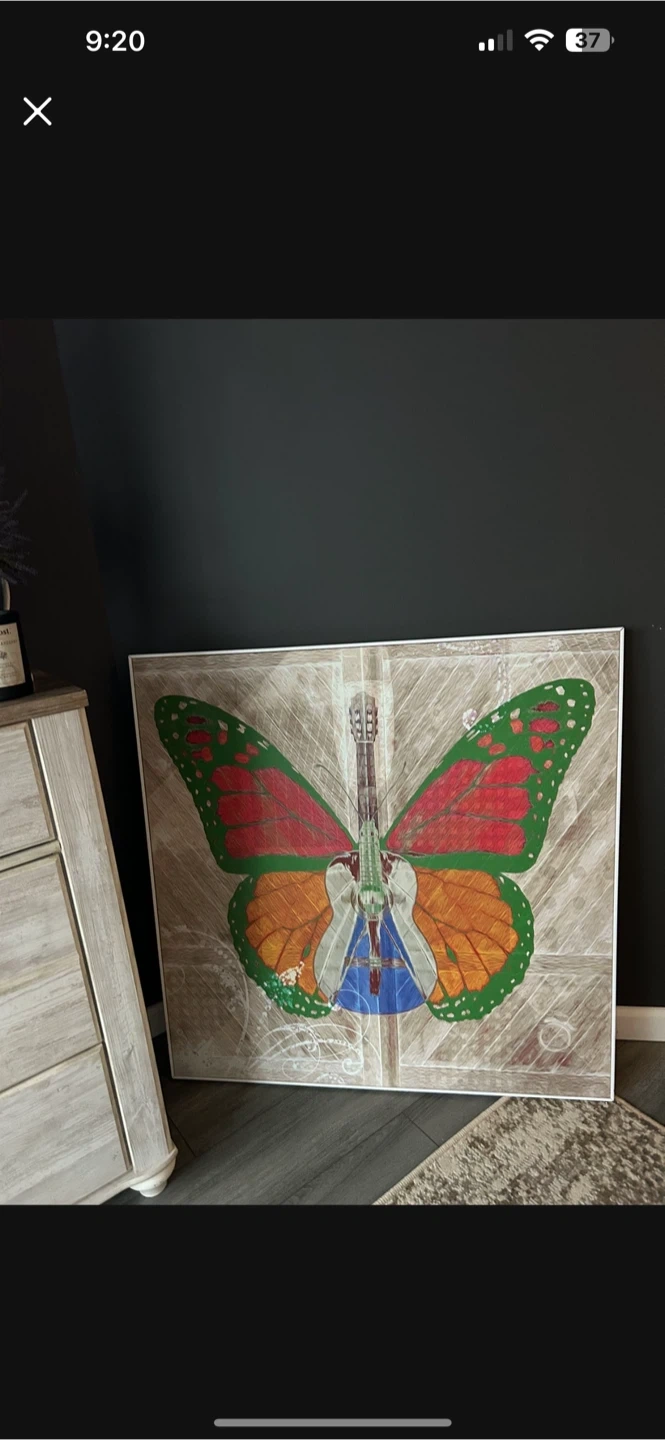 10Wall art featuring a butterfly and guitar design. It's in great condition and ready to add some flair to your space