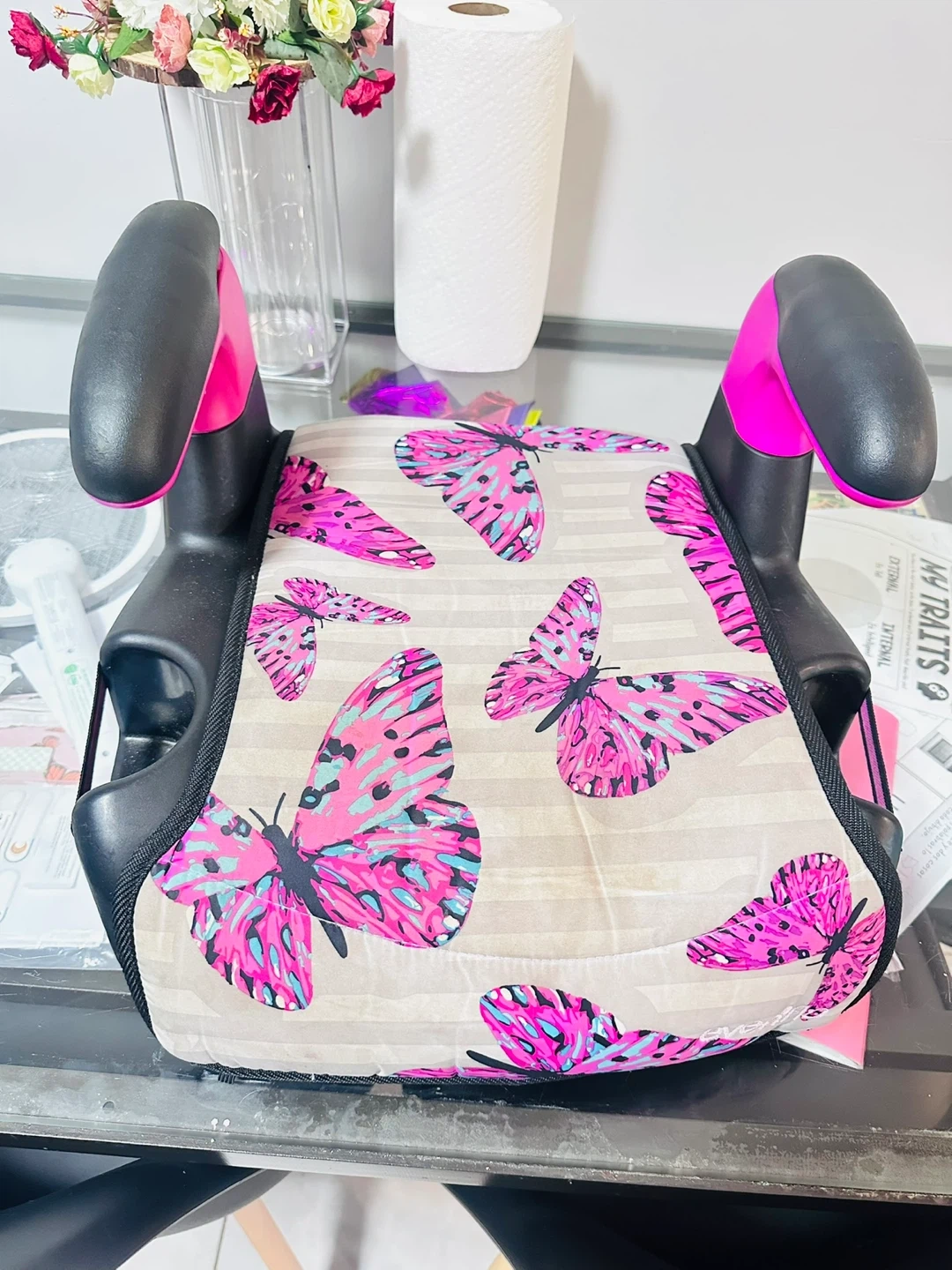 Here's a booster car seat with a fun butterfly print! The seat is black and pink with a beige seat cover. Great for kids who have outgrown their toddler car seats