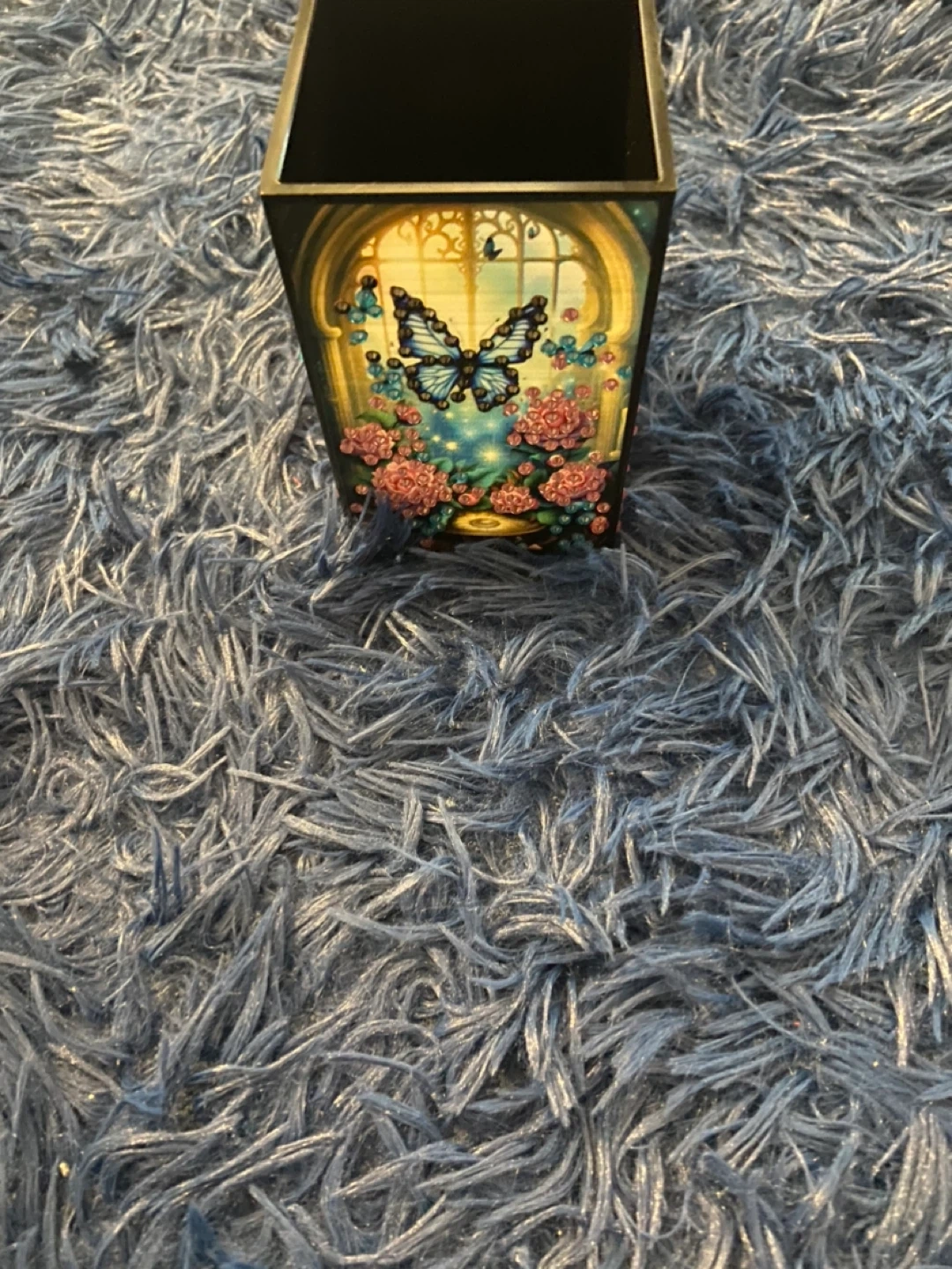 Here's a decorative pen holder with a beautiful butterfly and roses design! It's perfect for adding a touch of whimsy to your desk or workspace