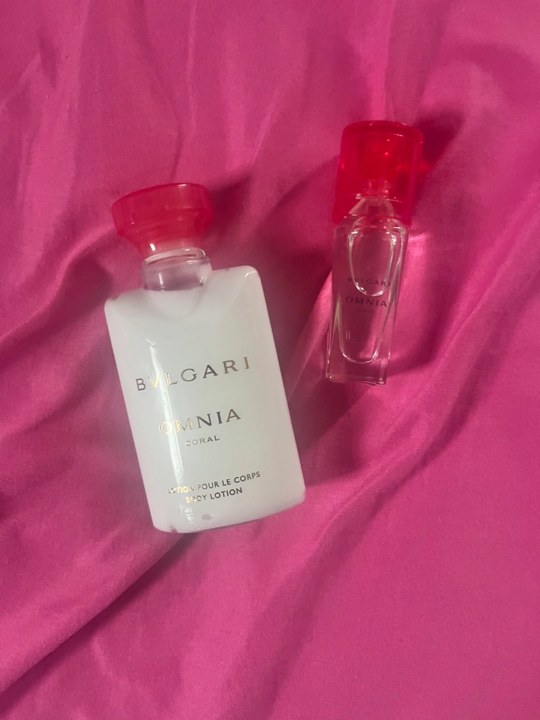 193Matching set. Includes a body lotion and a perfume. Both items have red tops and white containers. Perfect for a relaxing self care routine.